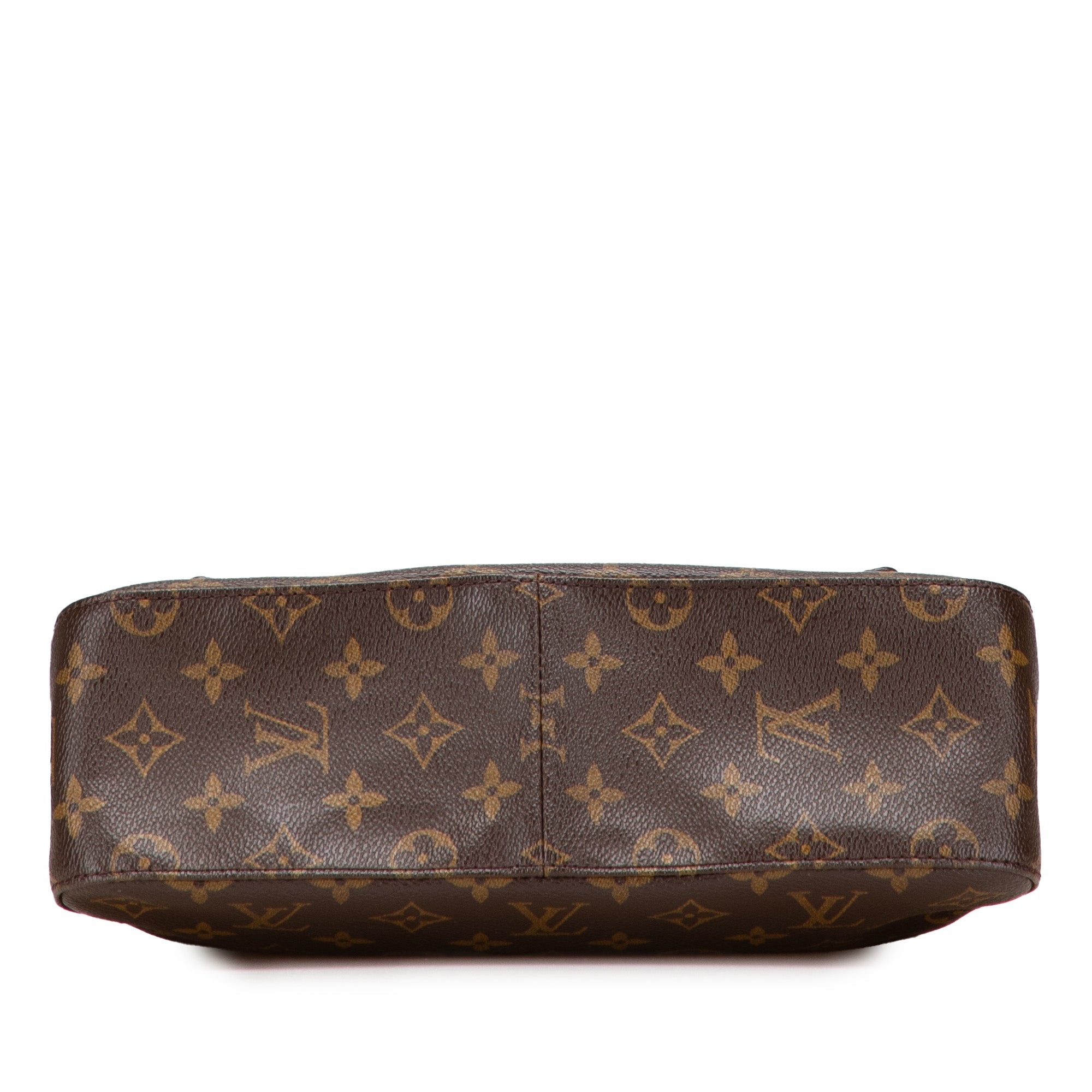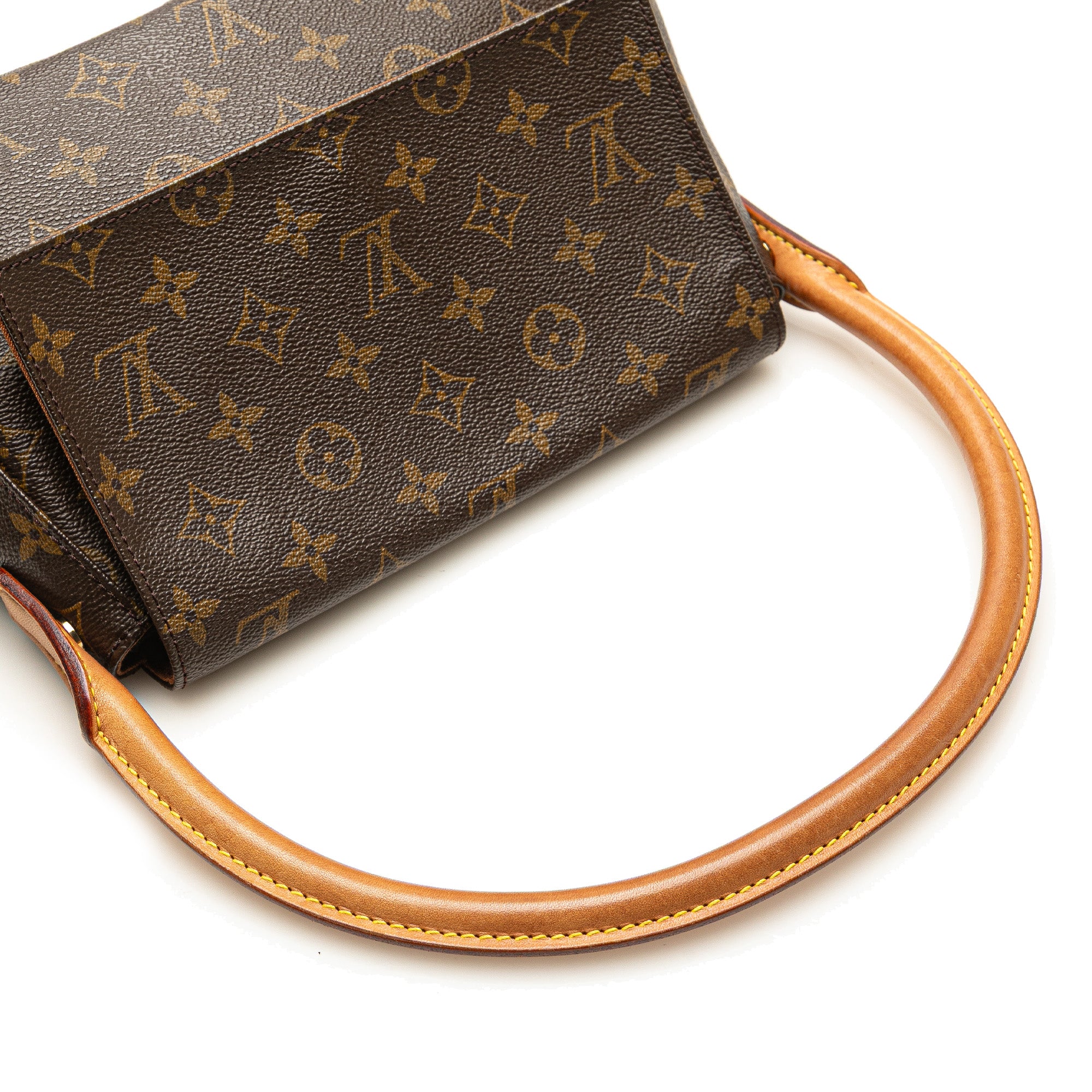 Product Details: Brown Louis Vuitton Monogram Mini Looping Shoulder Bag. The Mini Looping features a monogram canvas body, a rolled vachetta leather handle, a front flap with magnetic snap closure, and an interior zip pocket. 6.3" L x 11" W x 3.1" D. Serial number MI0011.