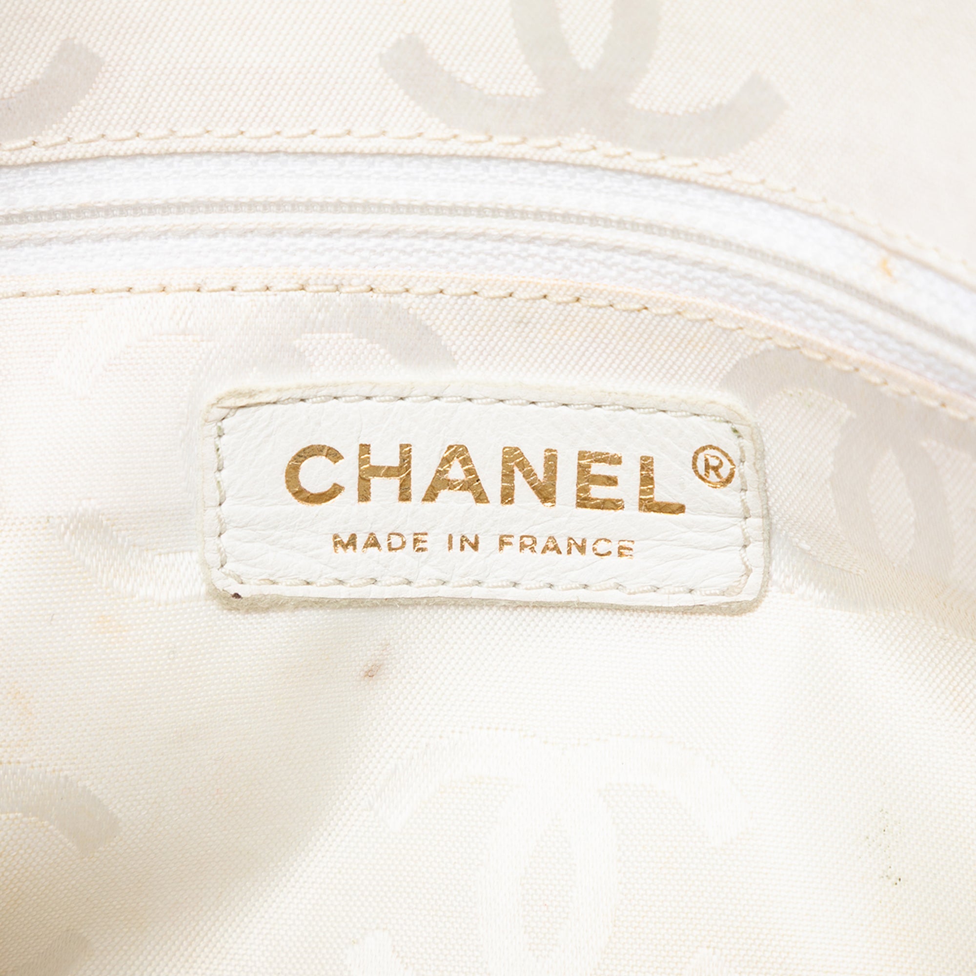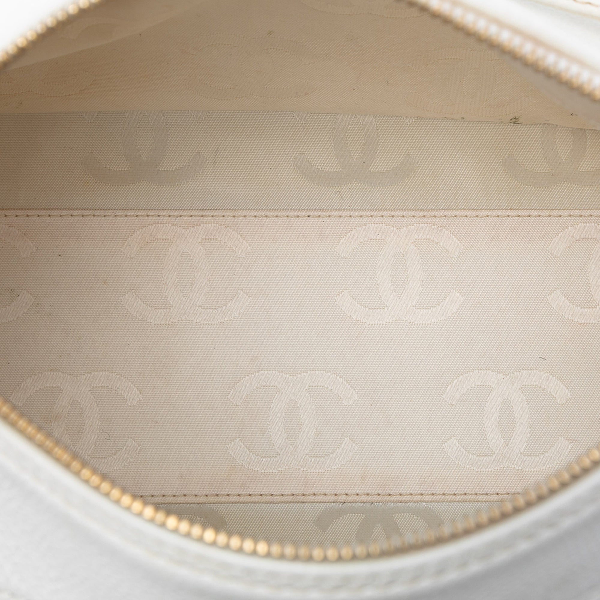 Product Details: White Chanel CC Caviar Chain Shoulder Bag. This shoulder bag features a caviar leather body, a curb chain strap, a top zip closure, exterior side slip pockets, and an interior zip pocket. 7.9" L x 10.6" W x 4.7" D. Serial number 8905175.
