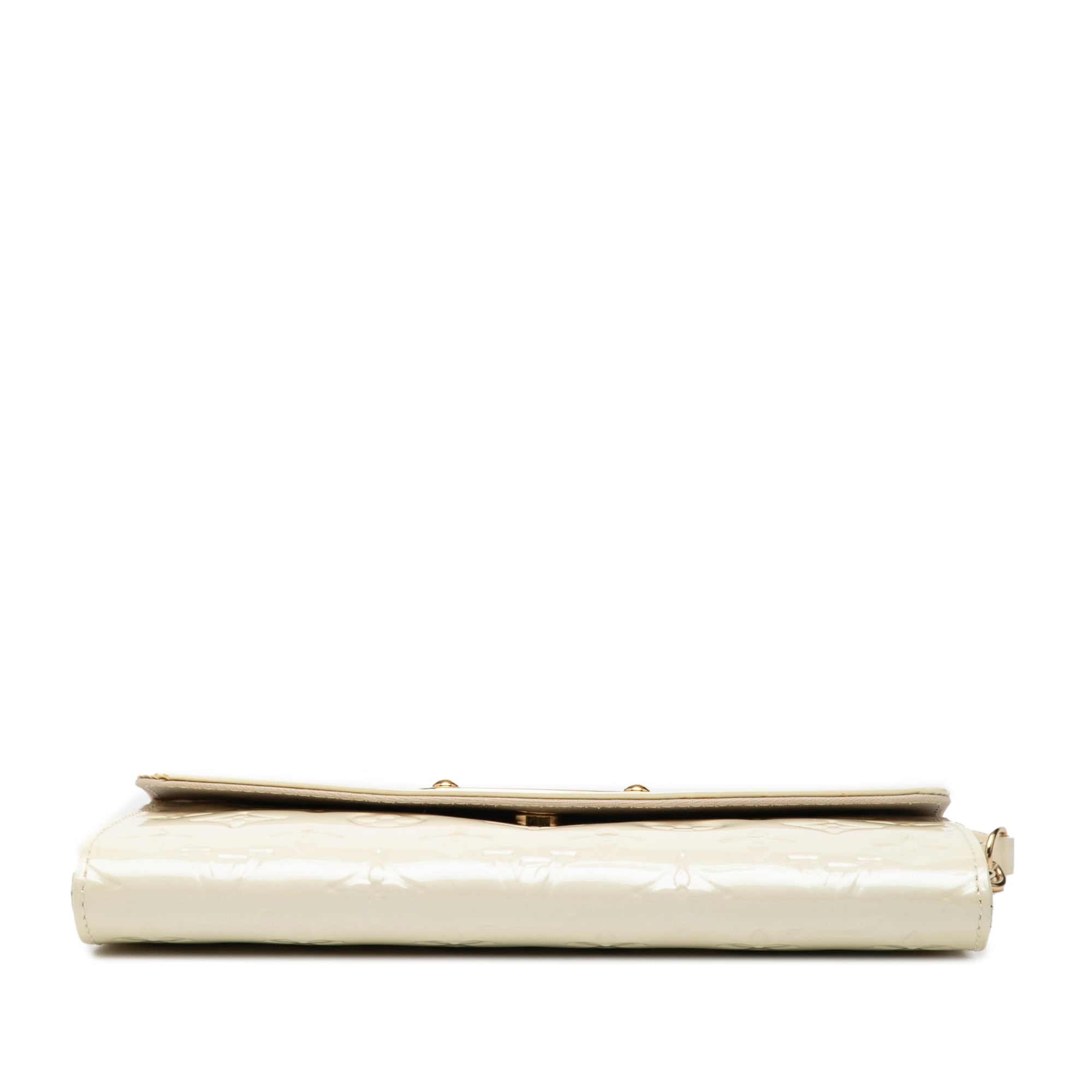 Product Details: White Louis Vuitton Monogram Vernis Sunset Boulevard Shoulder Bag. The Sunset Boulevard features a monogram vernis leather body, a flat leather strap, a front flap with magnetic snap closure, and interior slip pockets. 4.5" L x 9.4" W x 1" D, 6.1" drop. Serial number TH1098.
