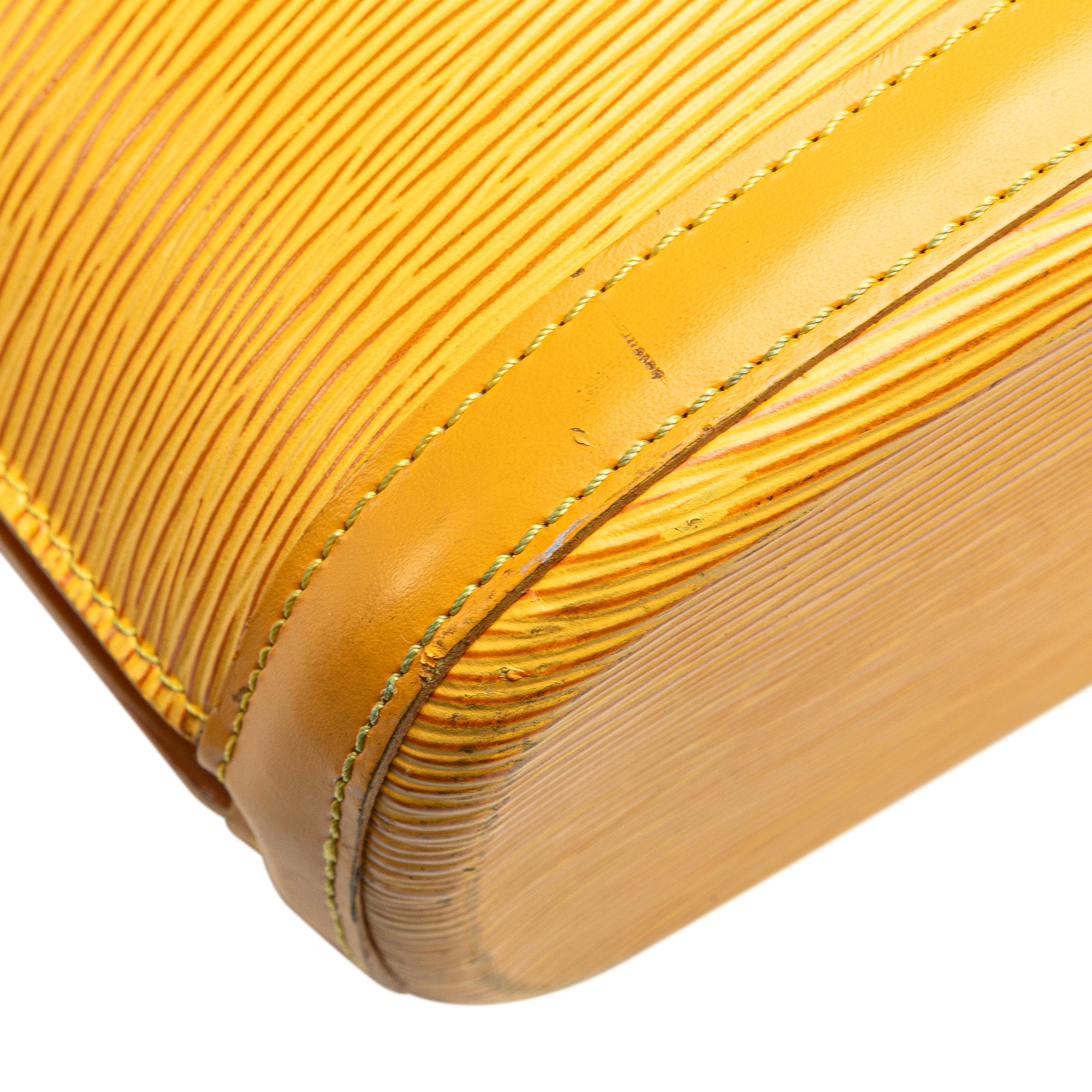 Product Details: Yellow Louis Vuitton Epi Lussac Shoulder Bag. The Lussac features an epi leather body, flat leather straps, a top zip closure, and interior zip and slip pockets. 12" L x 14.6" W x 4.7" D. Serial number AS1020.