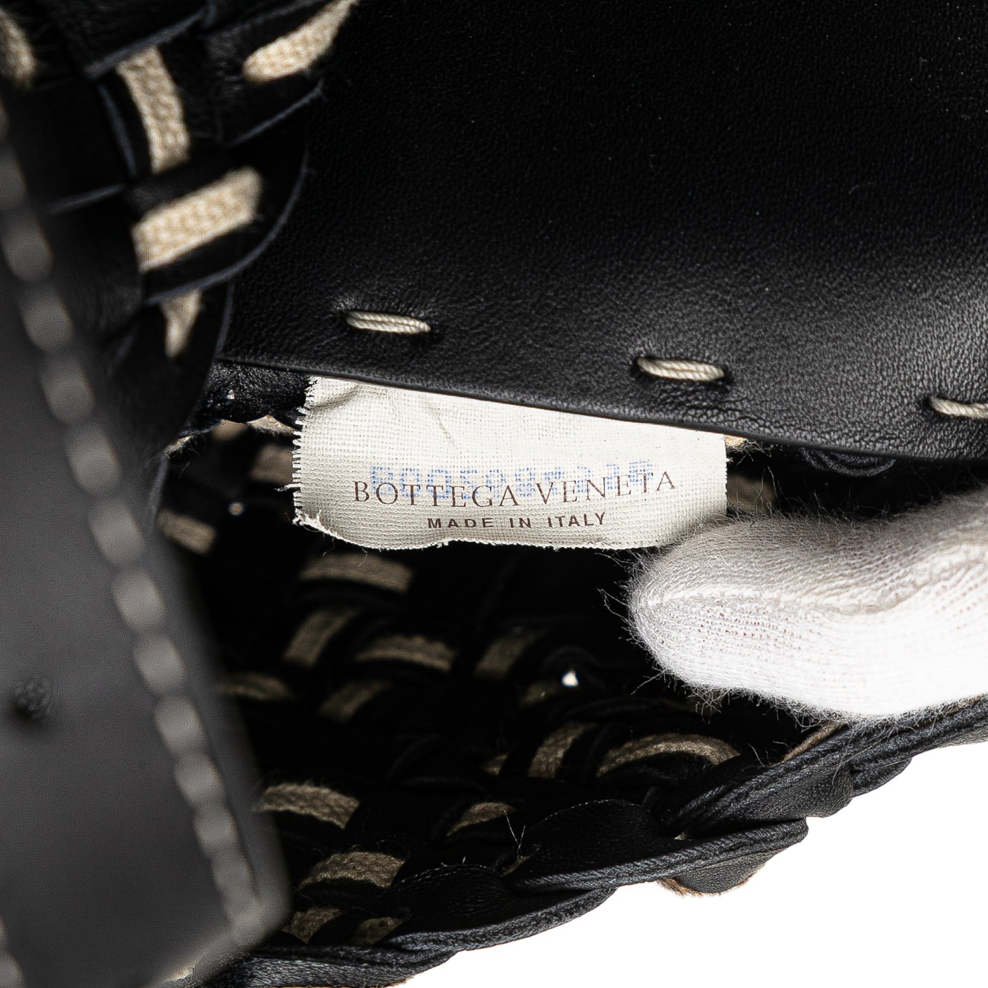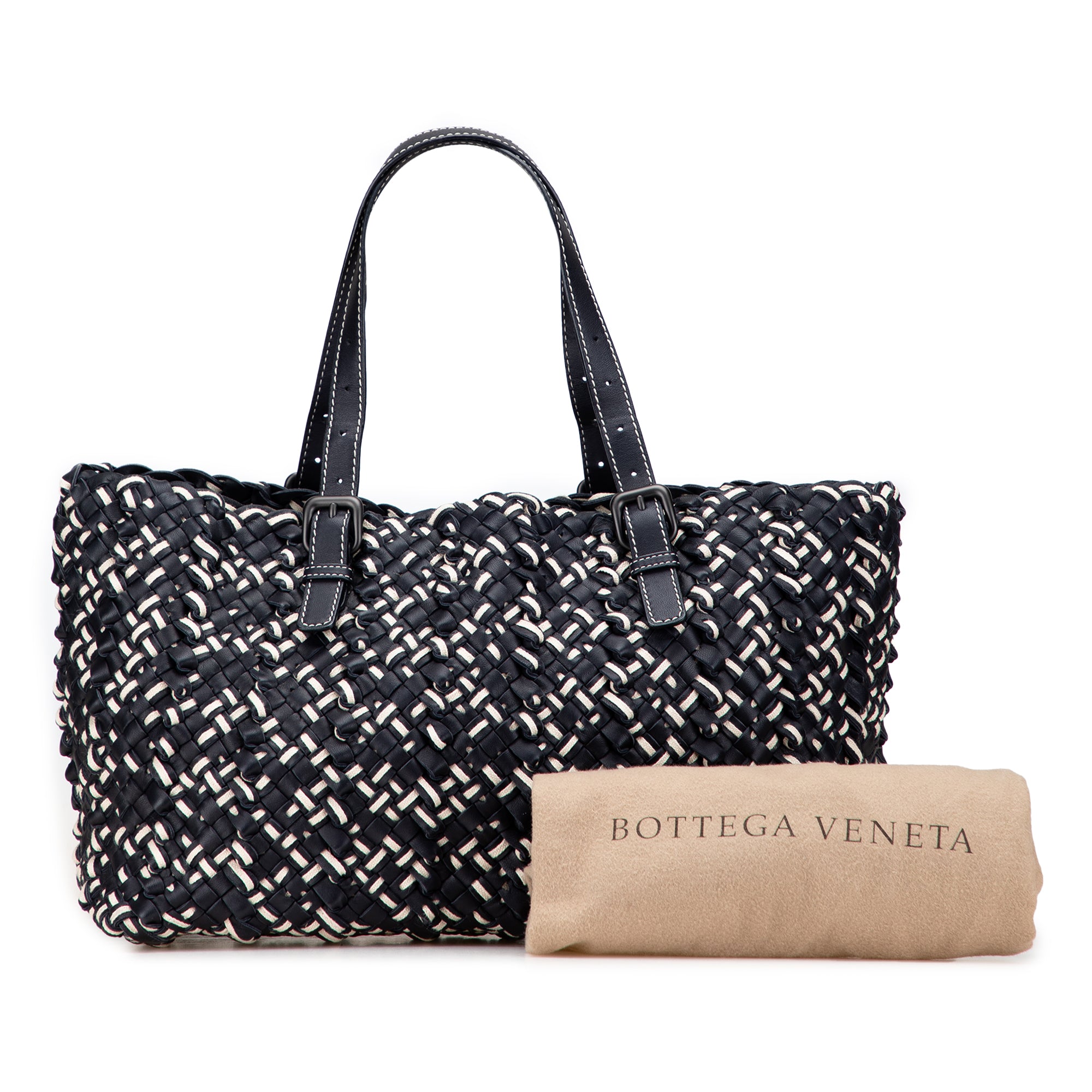 Product Details: Black Bottega Veneta Large Leather Intrecciato Lido Tote. The Lido tote bag features a woven leather body, adjustable flat leather straps, and an open top. 9.1" L x 13.8" W x 6.7" D. Serial number B00268455B.