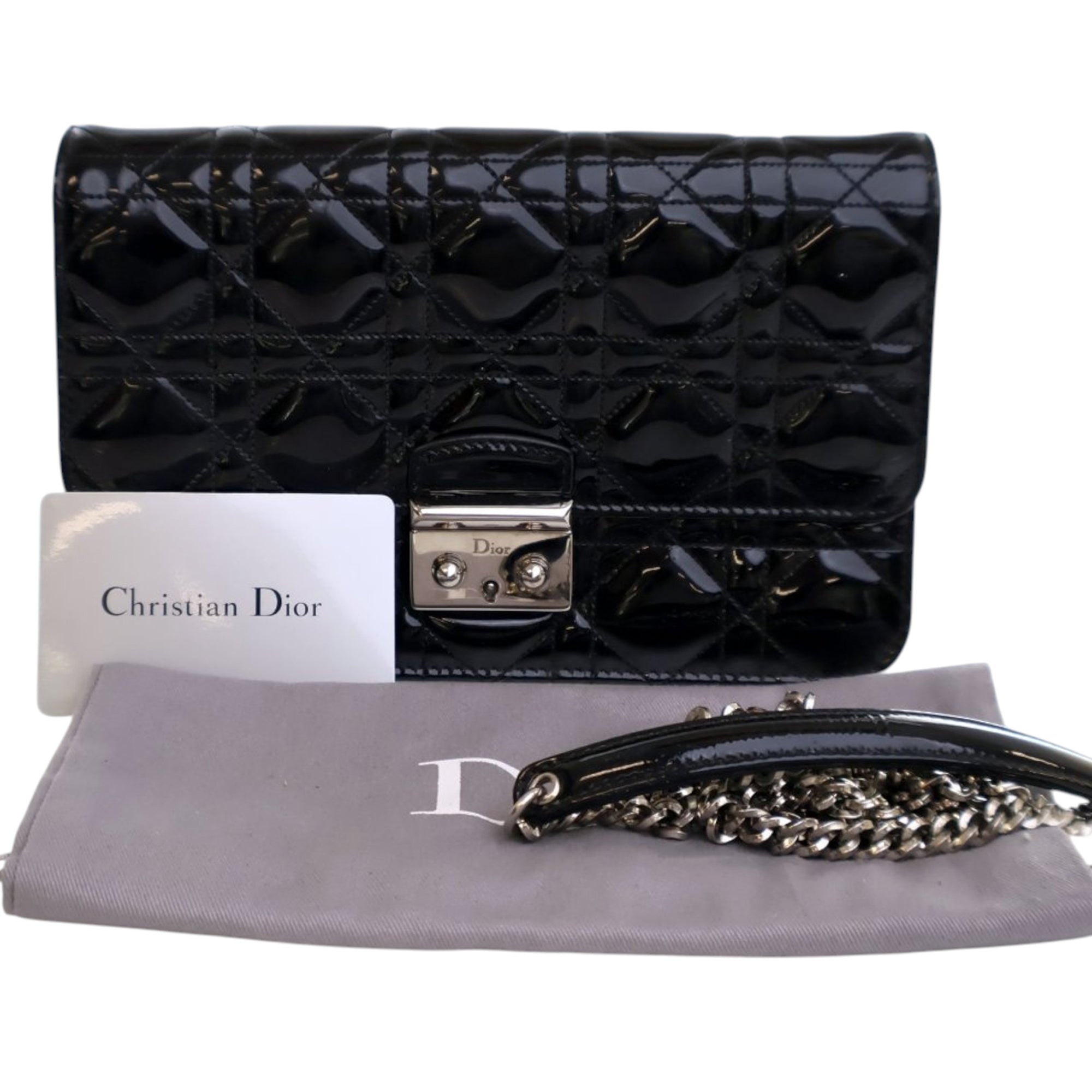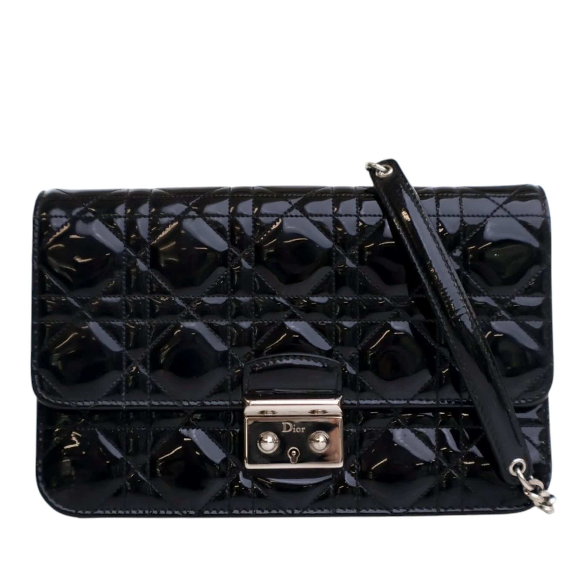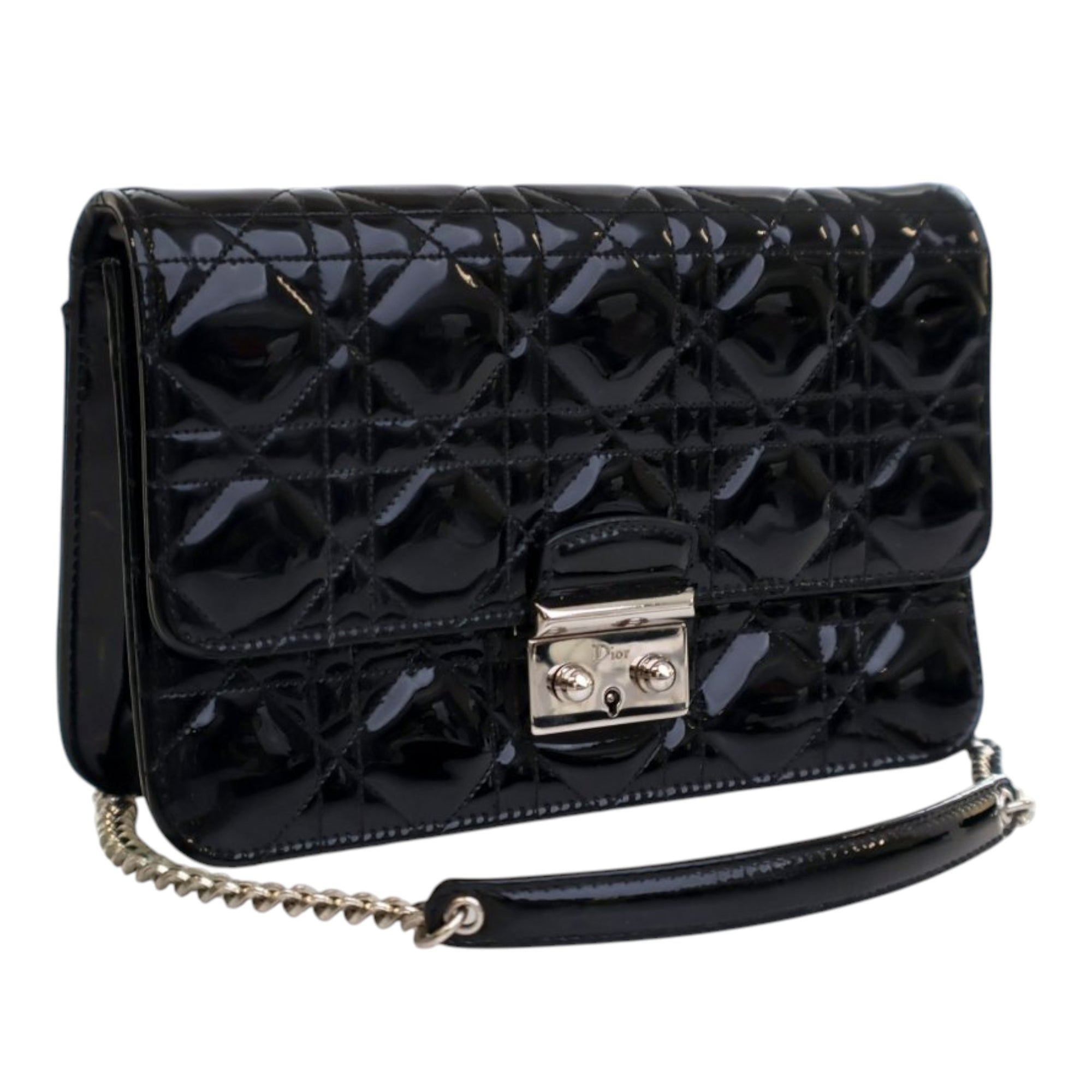 Product Details: Black Dior Patent Cannage Miss Dior Promenade Crossbody. The Miss Dior Promenade crossbody bag features a quilted patent leather body, a chain link strap with leather shoulder guard, a front flap with push lock closure, an interior zip compartment, and interior slip pockets. 5.2" L x 8" W x 2.3" D.