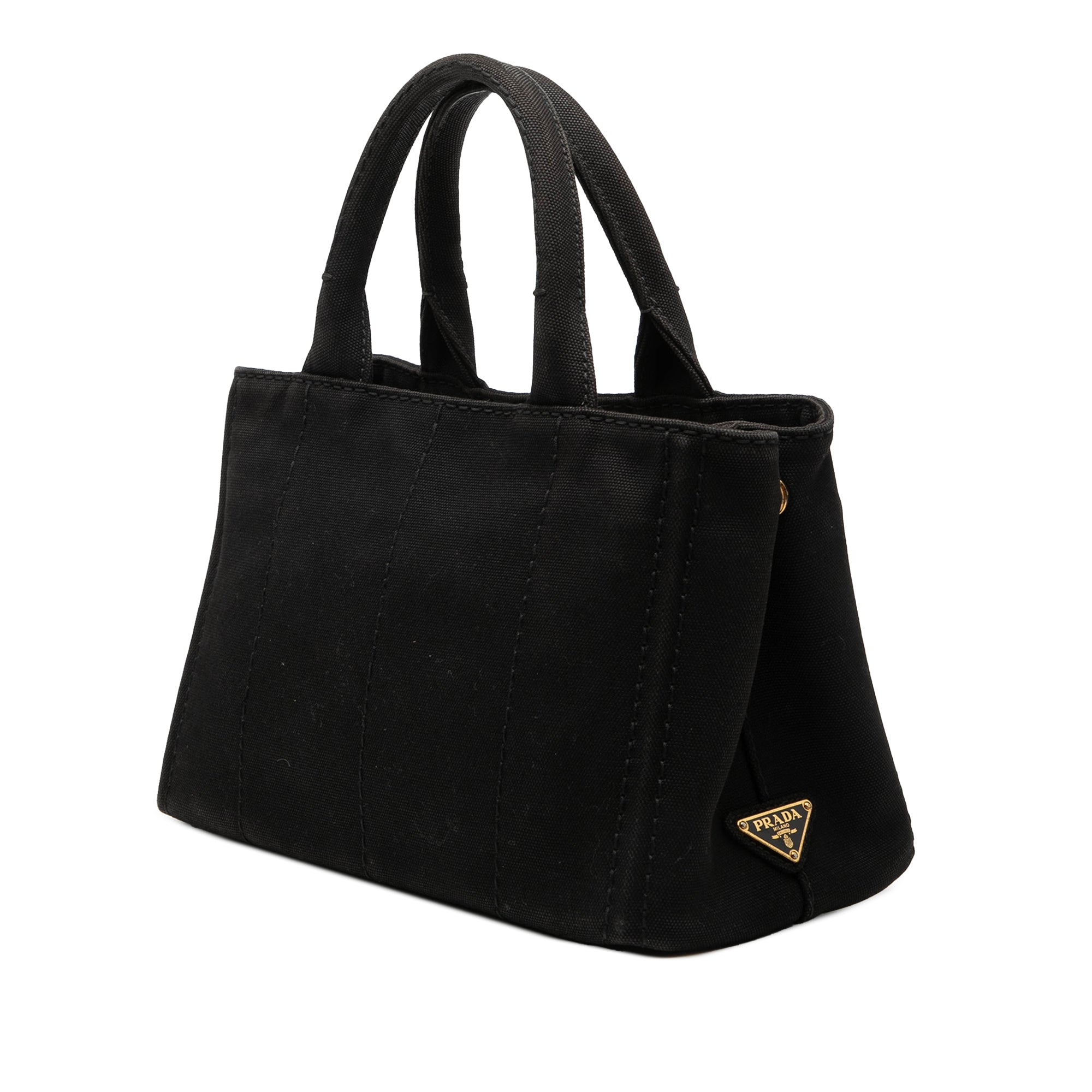 Product Details: Black Prada Small Canvas Canapa Logo Satchel. This satchel features a canvas body, rolled canvas handles, detachable flat strap, an open top with side snap closures, and interior zip and slip pockets. 7.1" L x 11" W x 5.9" D, 4.7" drop.