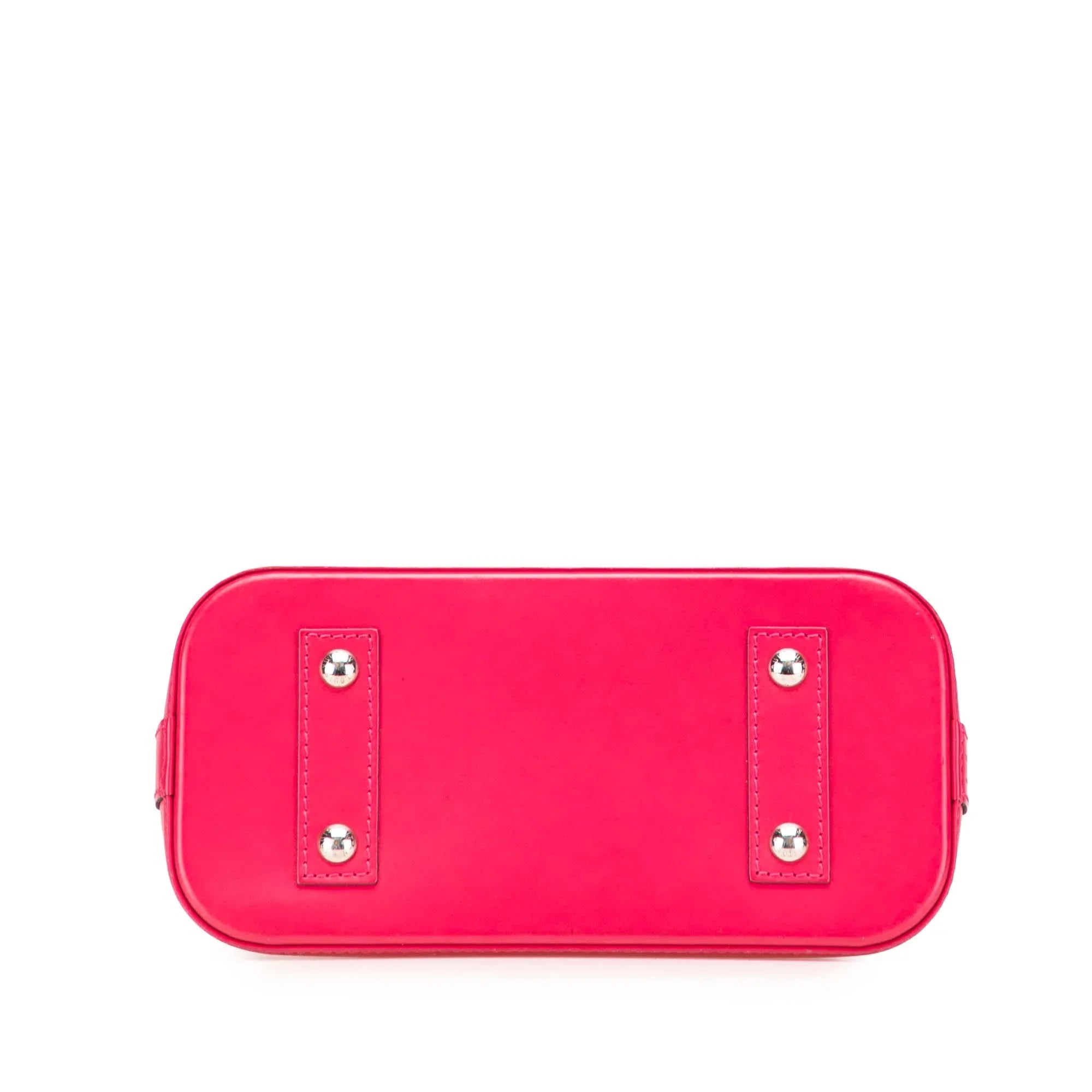 Product Details: Pink Louis Vuitton Epi Alma BB Satchel. The Alma BB features an epi leather body, rolled top handles, a top zip closure, and an interior slip pocket. 6.9" L x 9.1" W x 4.5" D, 3.9" drop. Serial number AA4167.