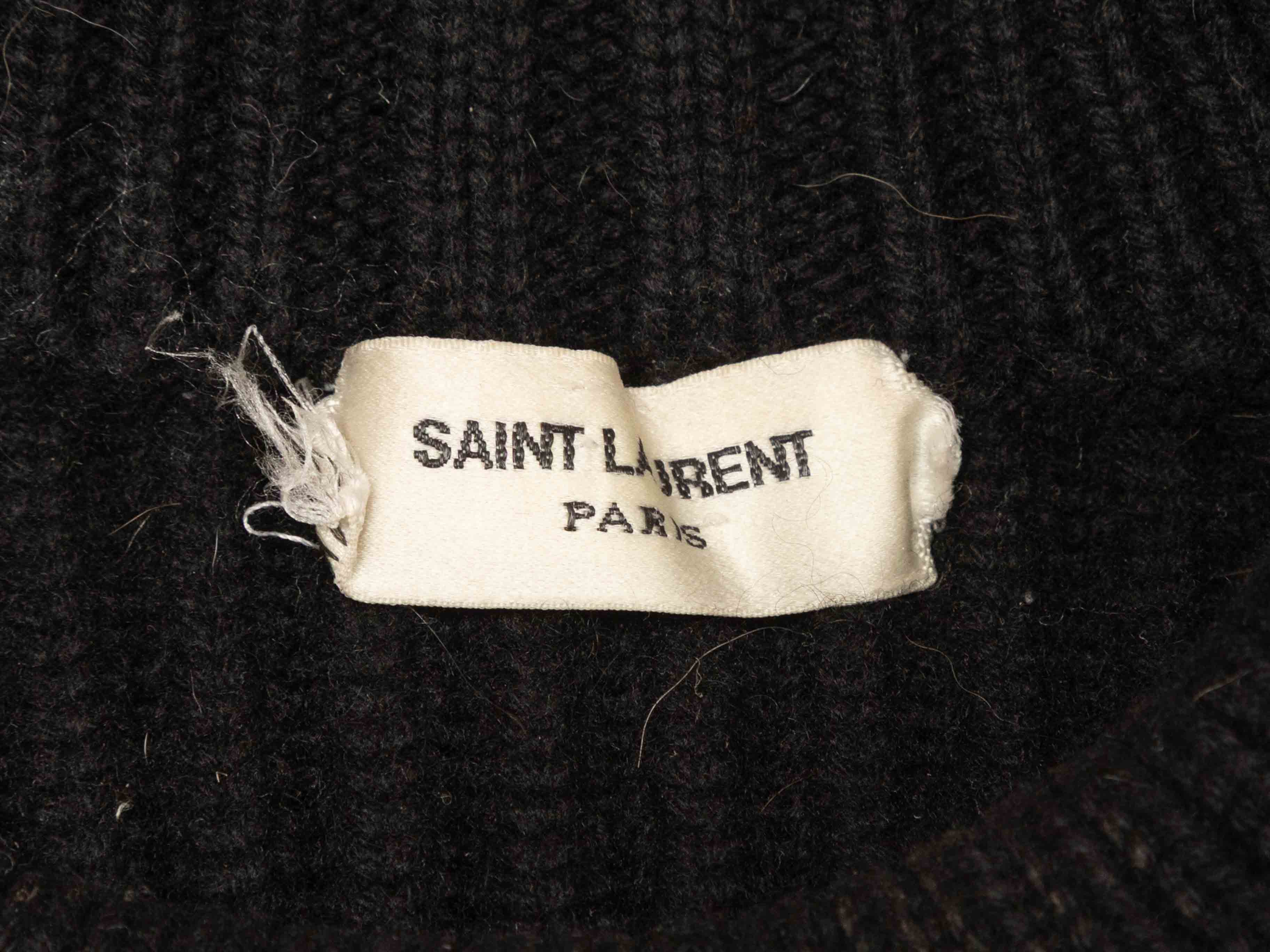 Product Details: Black wool and cashmere rib knit sweater by Saint Laurent. Crew neck. Long sleeves. 34" bust, 16" shoulder width, 23" length.