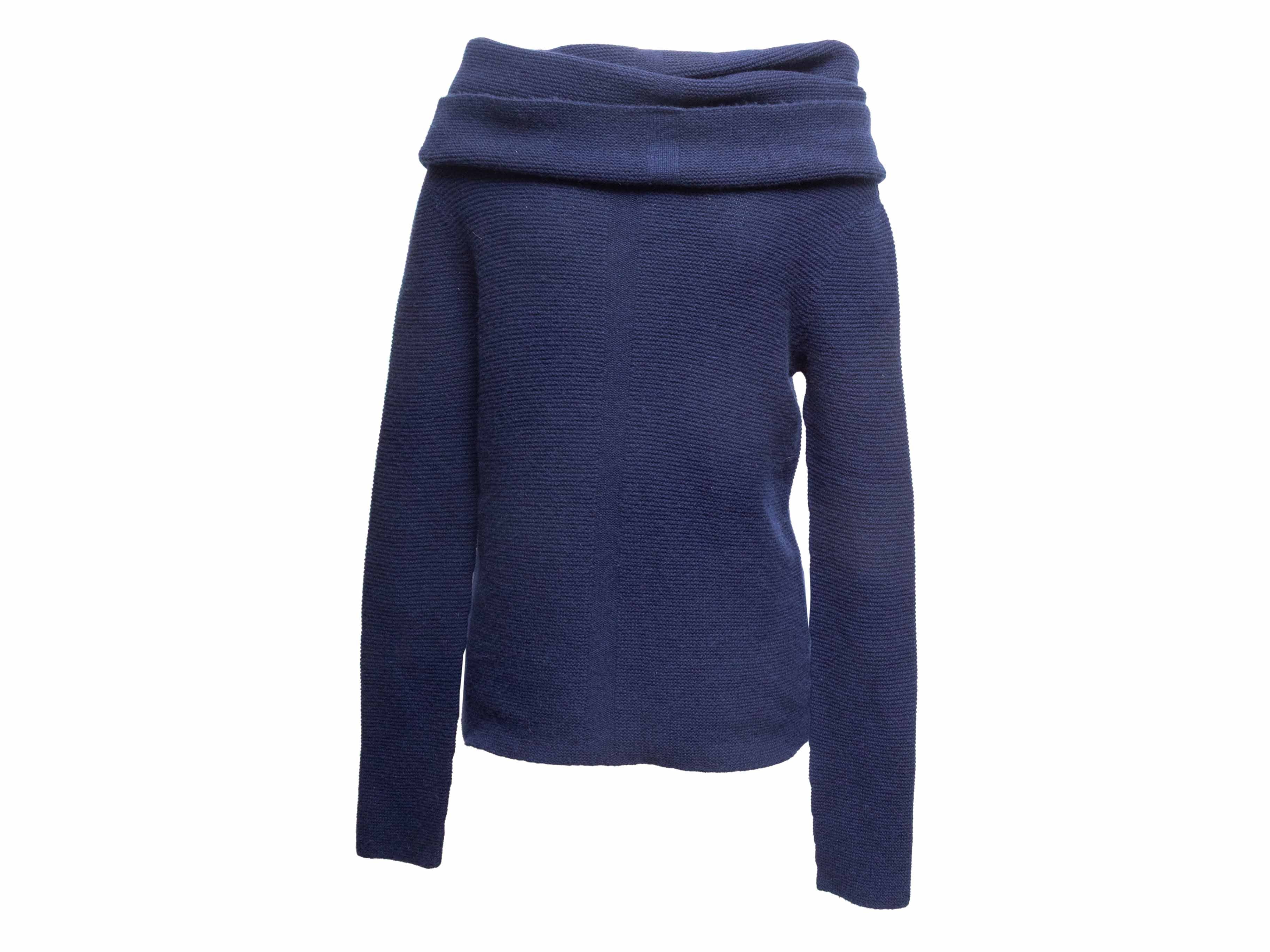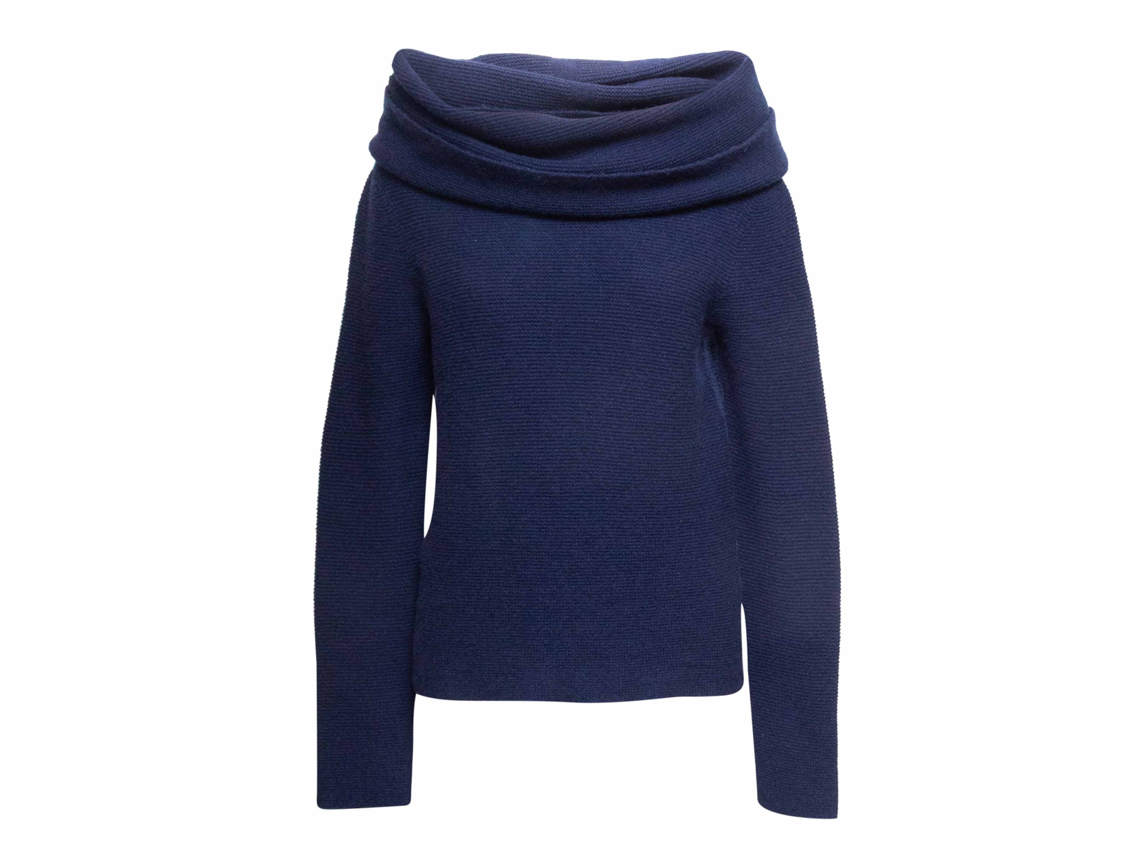 Product Details: Navy oversized cowl neck sweater by The Row. 36" bust, 16" shoulder width, 26.5" length.