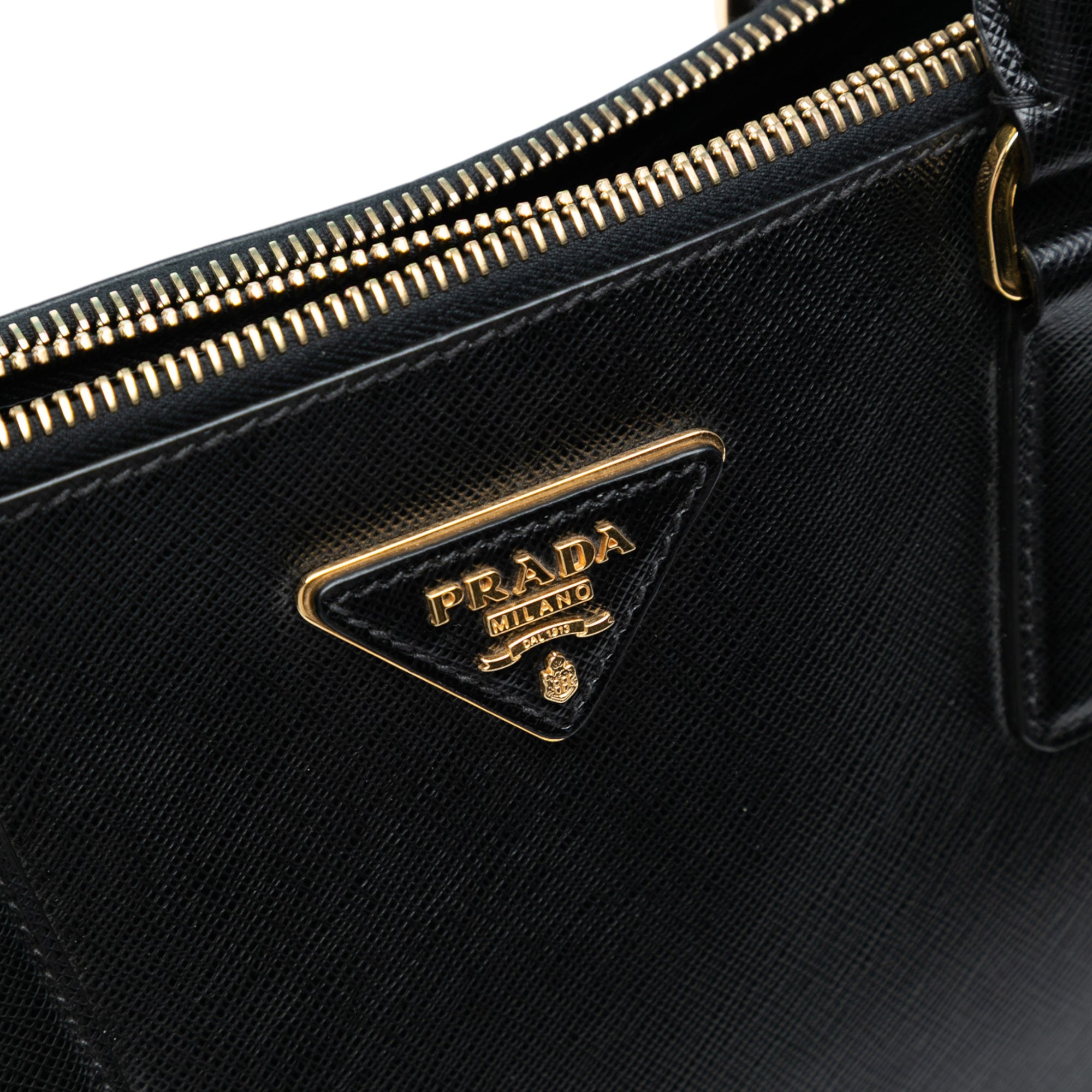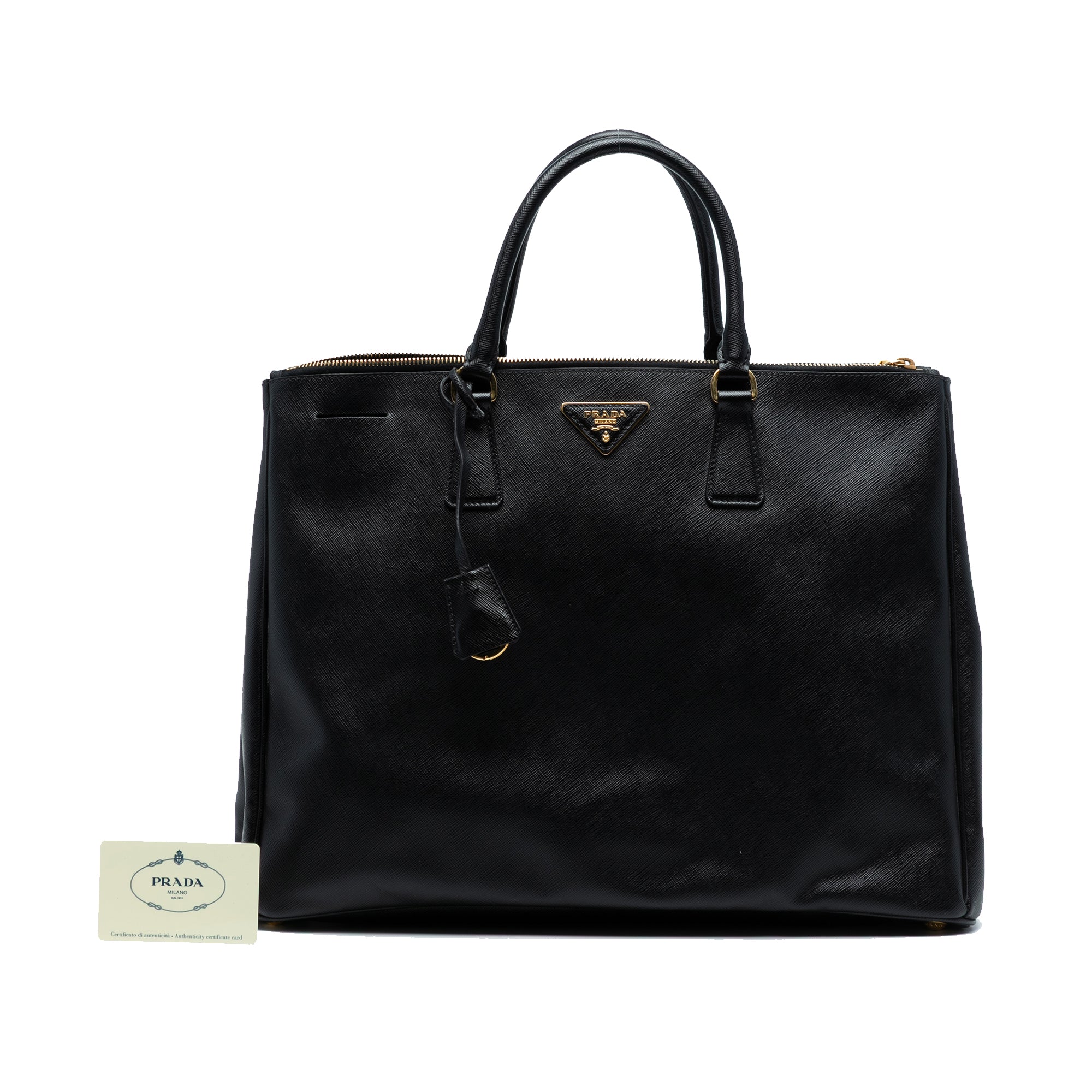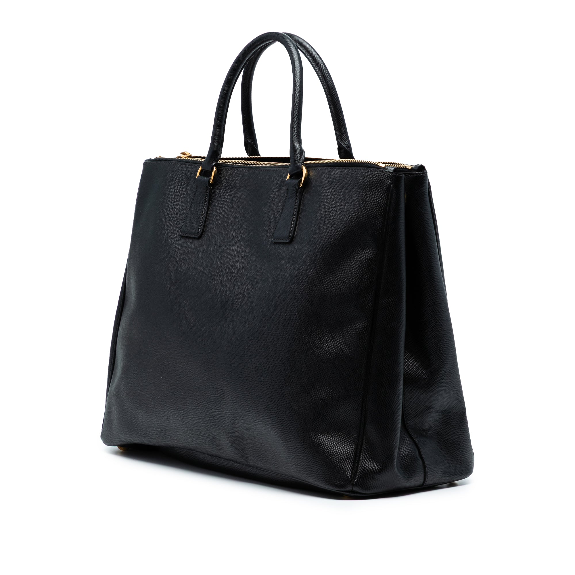 Product Details: Black Prada Extra Large Saffiano Lux Galleria Double Zip Tote. The Galleria features a saffiano leather body, rolled leather handles, an open top with magnetic snap button closure, dual zip compartments, and interior zip and slip pockets. Handles has been repainted. 11.8" L x 15.7" W x 6.7" D, 5.1" drop.