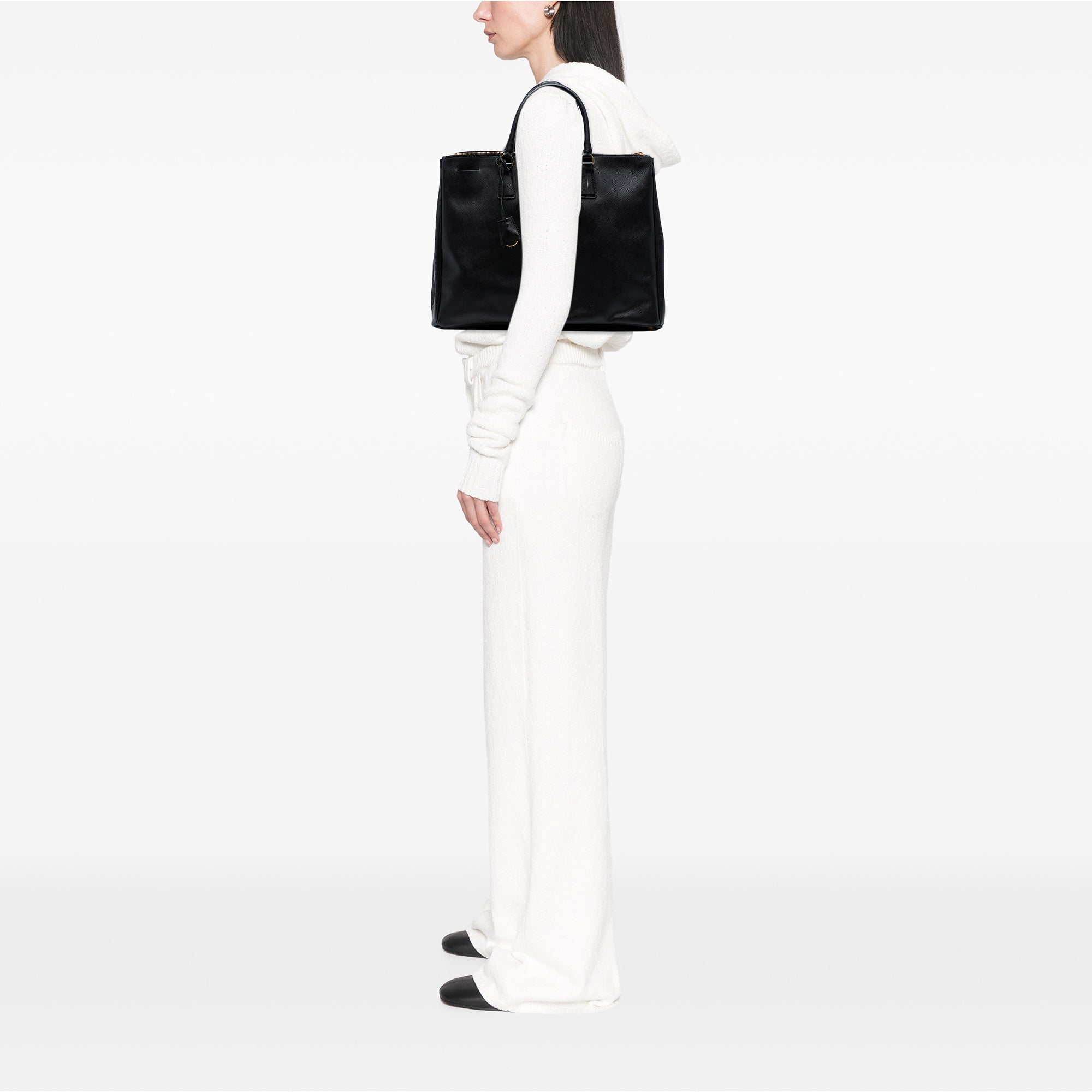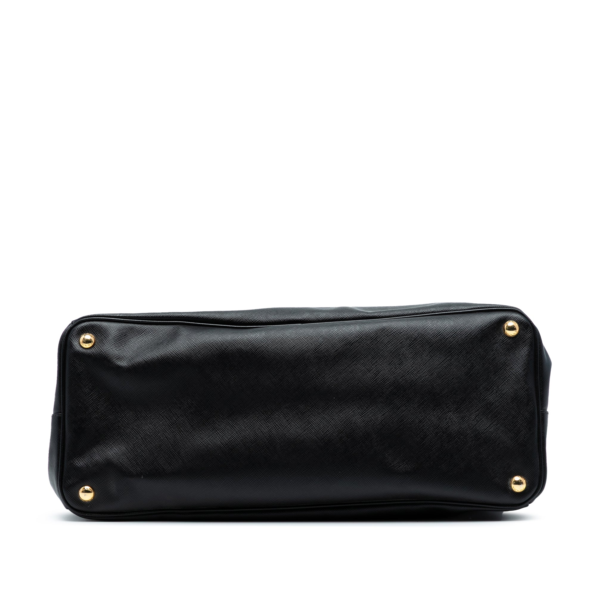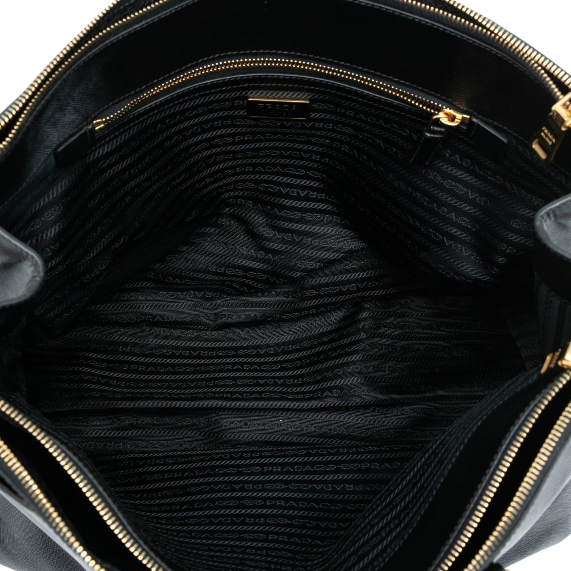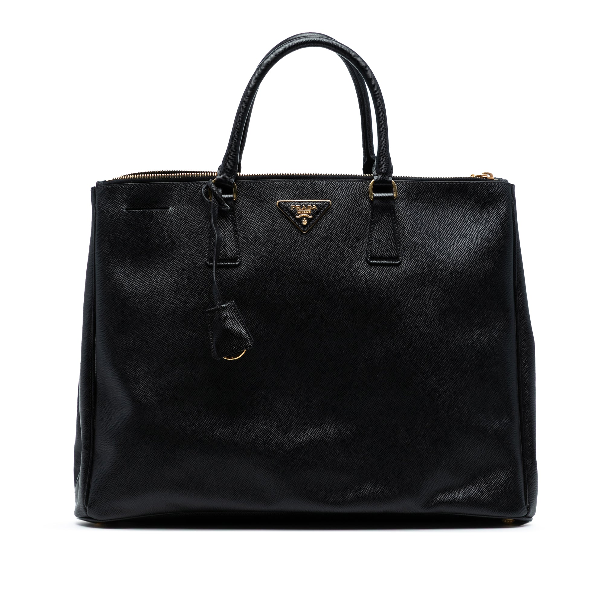 Product Details: Black Prada Extra Large Saffiano Lux Galleria Double Zip Tote. The Galleria features a saffiano leather body, rolled leather handles, an open top with magnetic snap button closure, dual zip compartments, and interior zip and slip pockets. Handles has been repainted. 11.8" L x 15.7" W x 6.7" D, 5.1" drop.