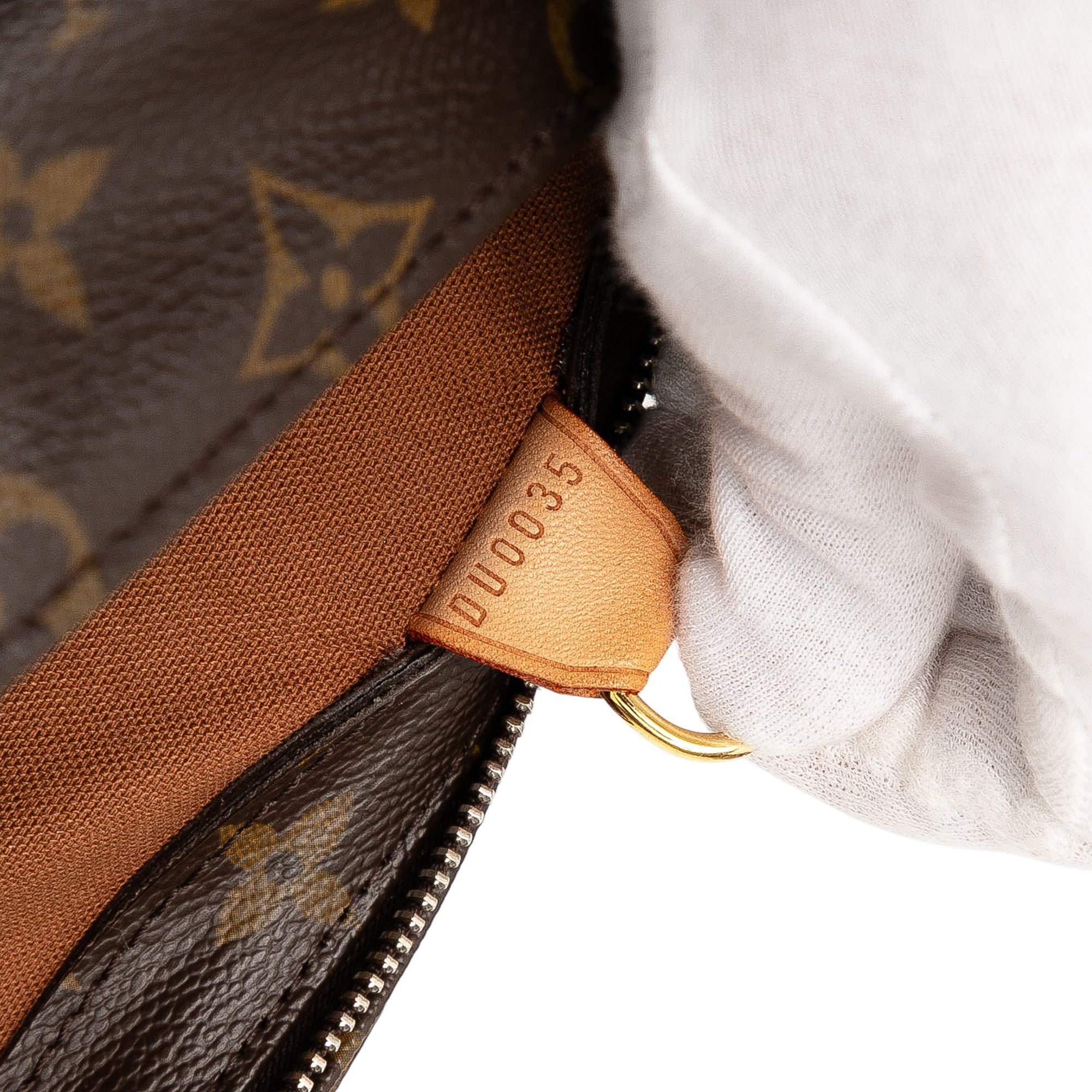 Product Details: Brown Louis Vuitton Monogram Cabas Piano Tote Bag. The Cabas Piano features a monogram canvas body, flat vachetta leather handles, a top zip closure, and an interior slip pocket. 9.1" L x 10.8" W x 4.7" D, 8.9" drop. Serial number DU0035.