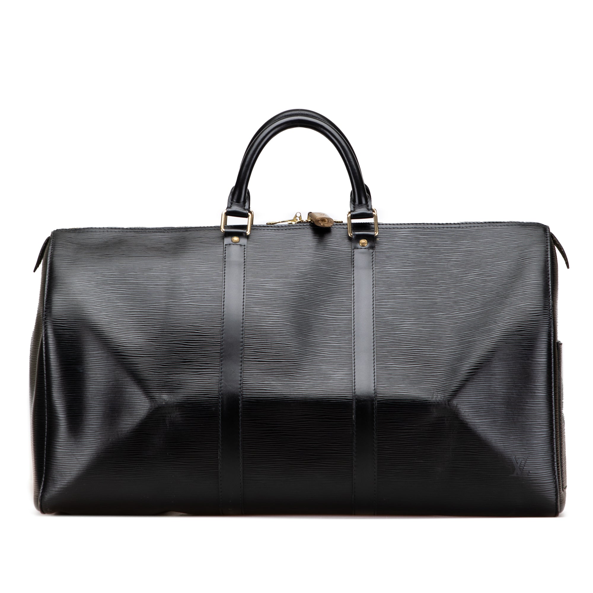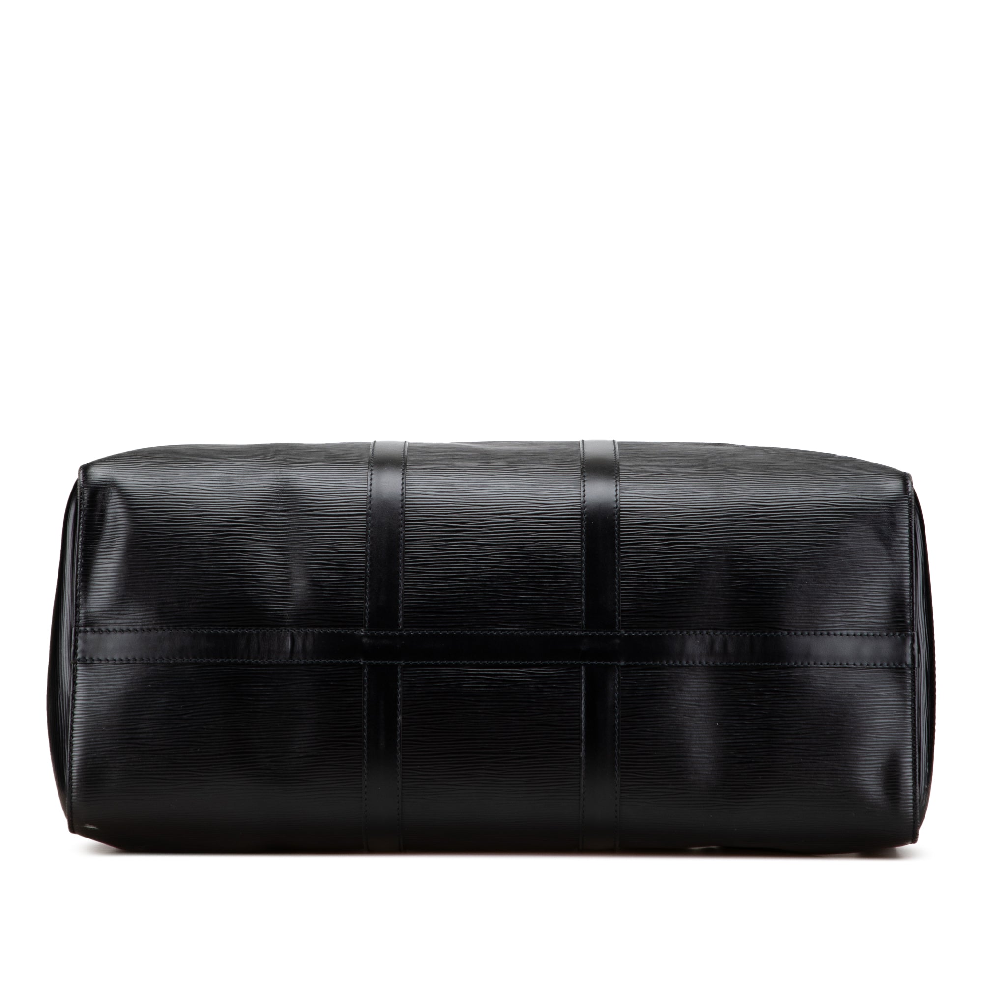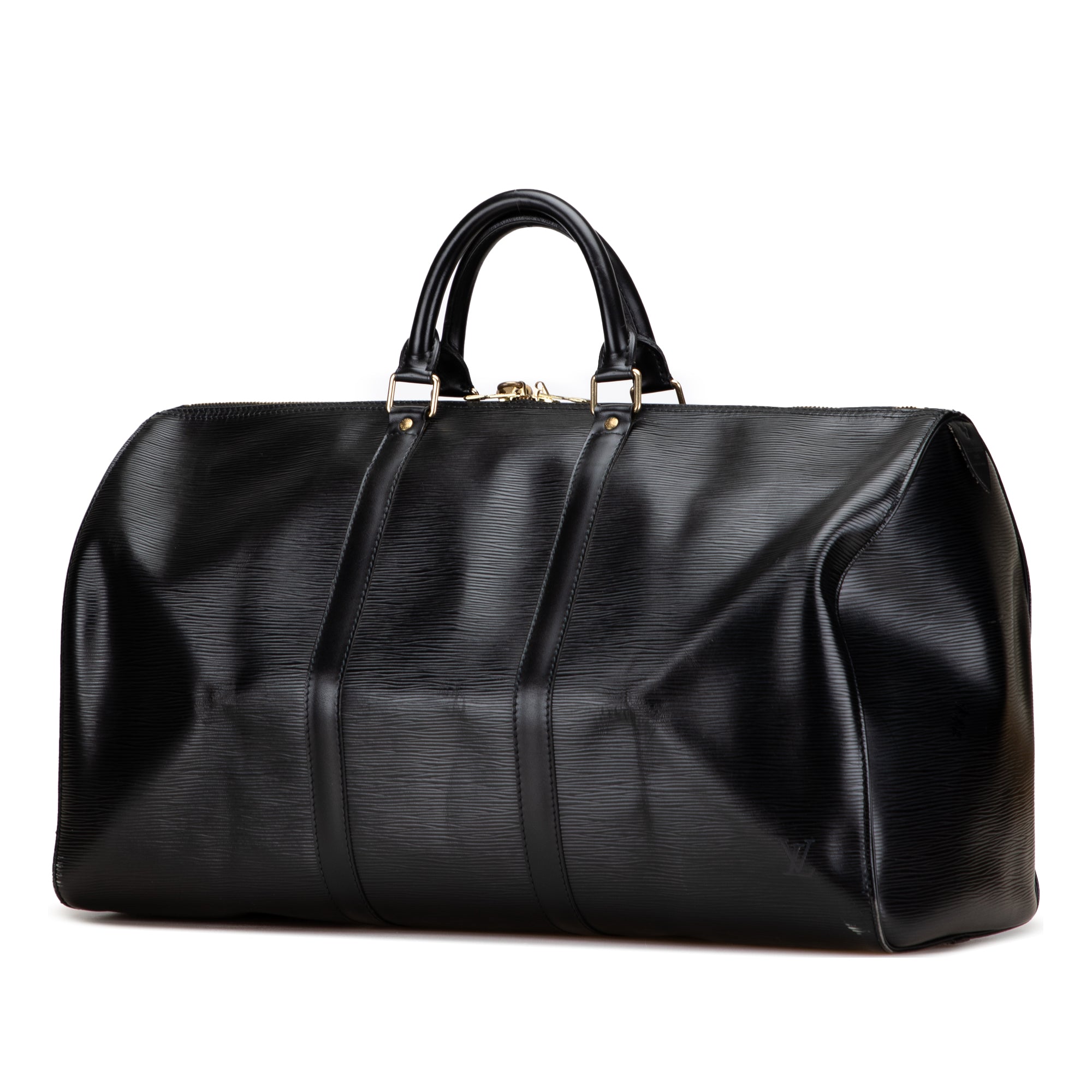 Product Details: Black Louis Vuitton Epi Keepall 50 Travel Bag. The Keepall 50 features an epi leather body, rolled handles, a top zip closure, and an exterior side slip pocket. 11.4" L x 20.3" W x 8.9" D, 4.7" drop. Serial number VI1905.