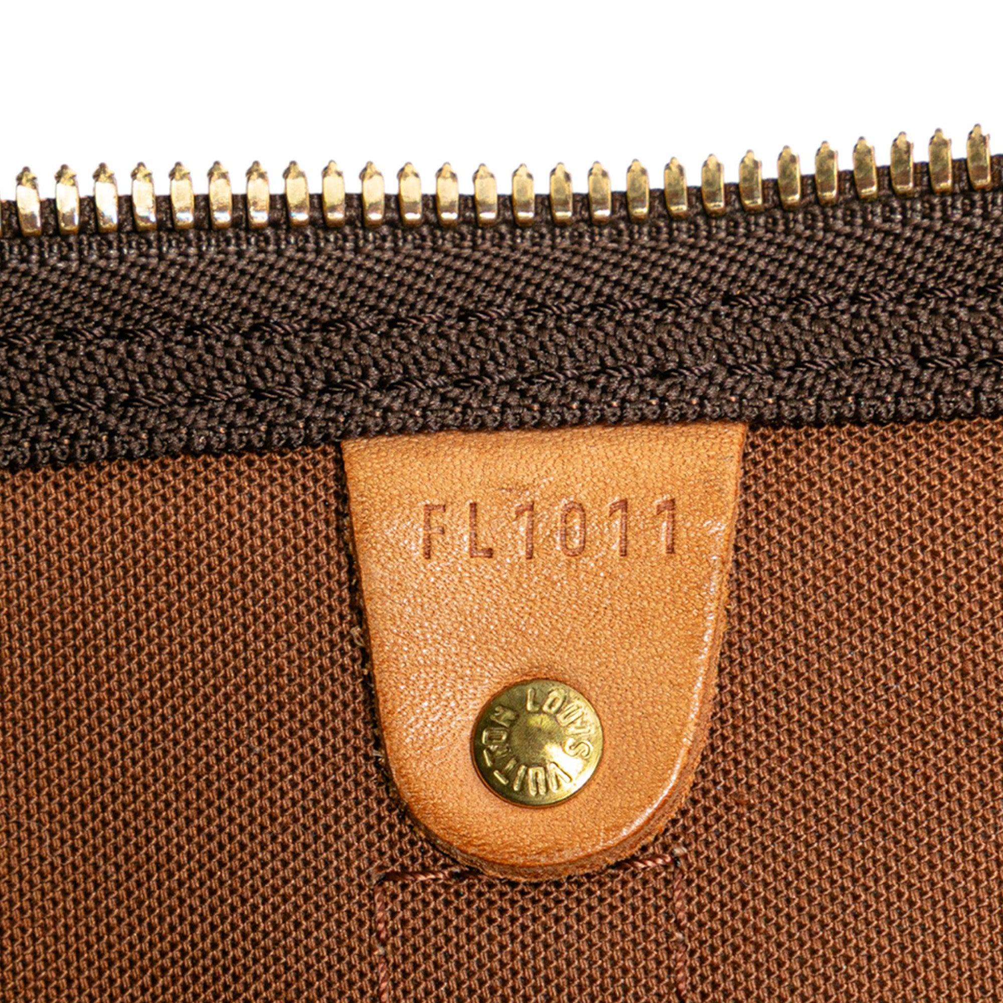 Product Details: Brown Louis Vuitton Monogram Keepall 55 Travel Bag. The Keepall 55 features a monogram canvas body with vachetta leather trim, rolled vachetta leather handles and a top zip closure. 12.2" L x 22" W x 9.4" D, 4.7" drop. Serial number FL1011.