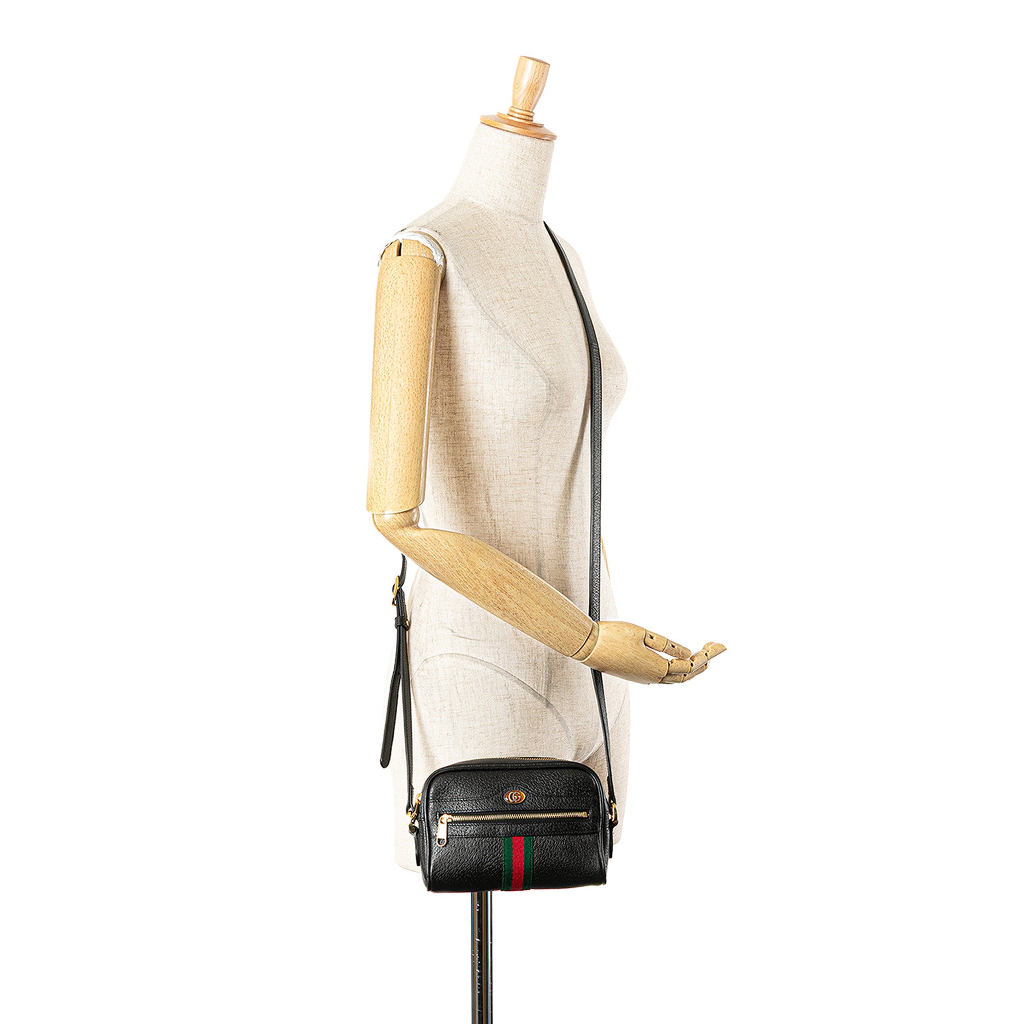 Product Details: Black Gucci Mini Leather Ophidia Crossbody. The Ophidia crossbody bag features a leather body, an adjustable flat leather shoulder strap, a top zip closure, an exterior zip pocket, and an interior slip pocket. 5.1" L x 7.1" W x 2" D. Serial number 517350 0416.