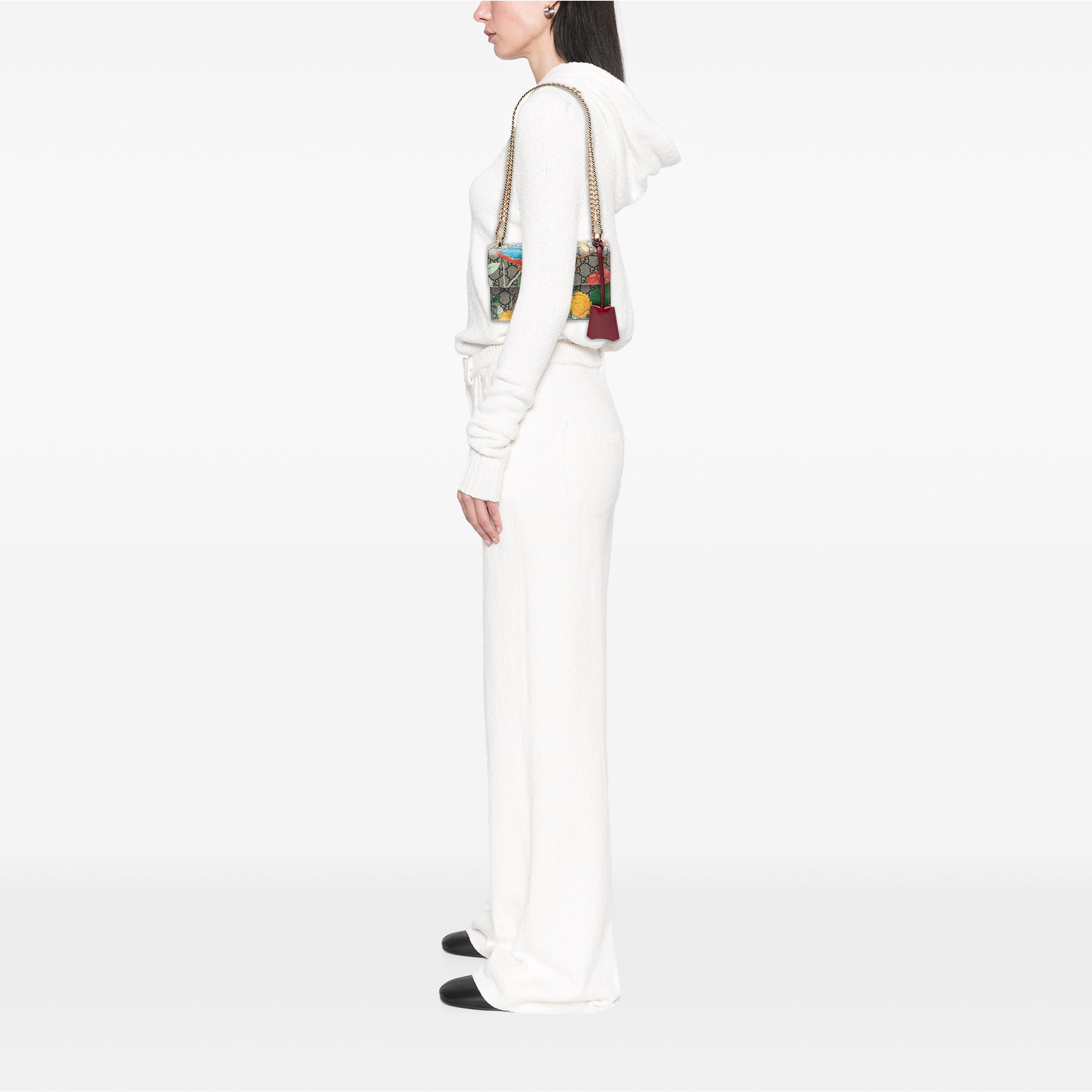 Product Details: Brown Gucci Small GG Supreme Tian Padlock Crossbody. The Tian crossbody bag features a coated canvas body, a gold-tone chain strap, a front flap with a S-lock closure, and an interior slip pocket. 5.1" L x 7.9" W x 1.8" D. Serial number 409487 213317.