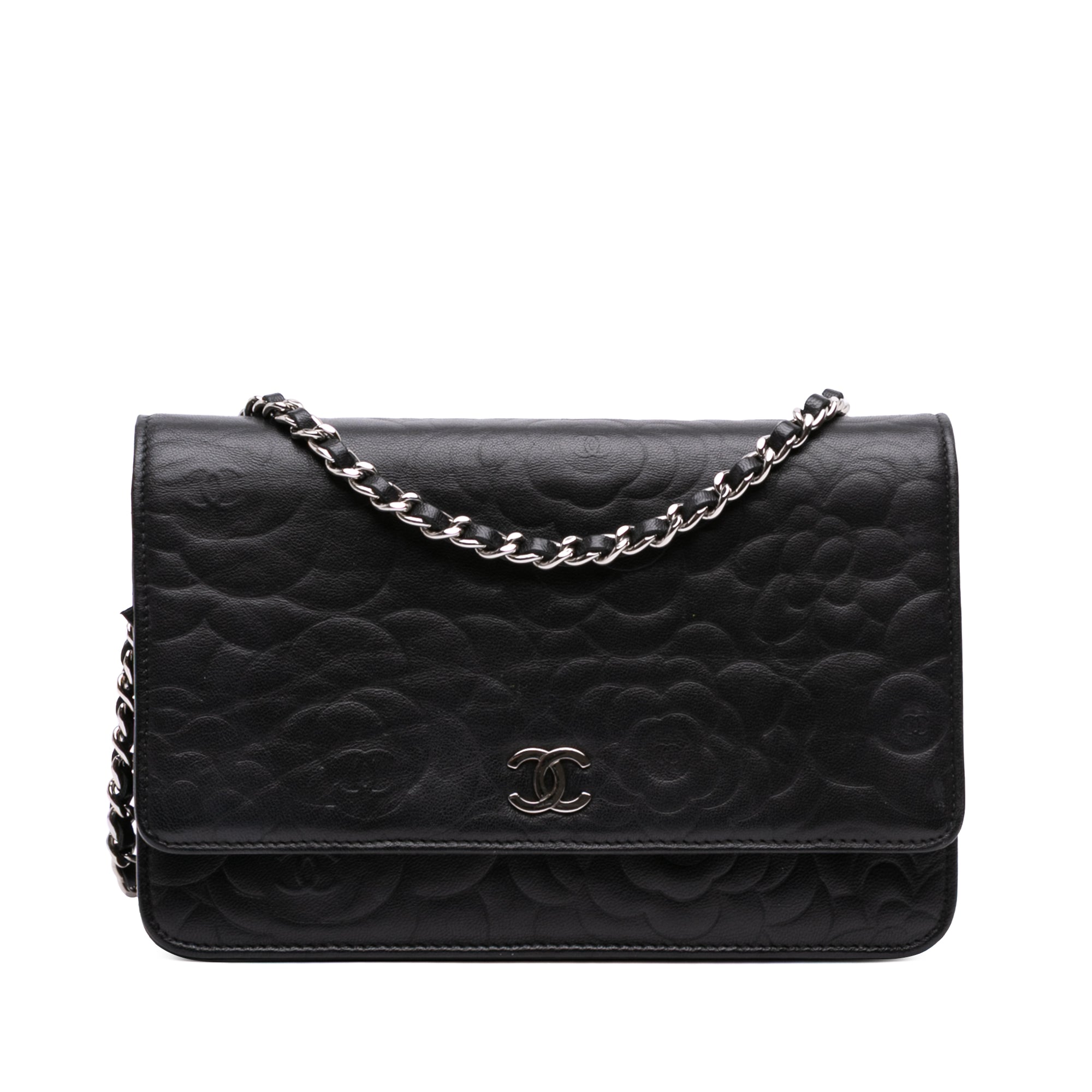 Black Chanel Camellia Embossed Lambskin Wallet On Chain Crossbody Bag