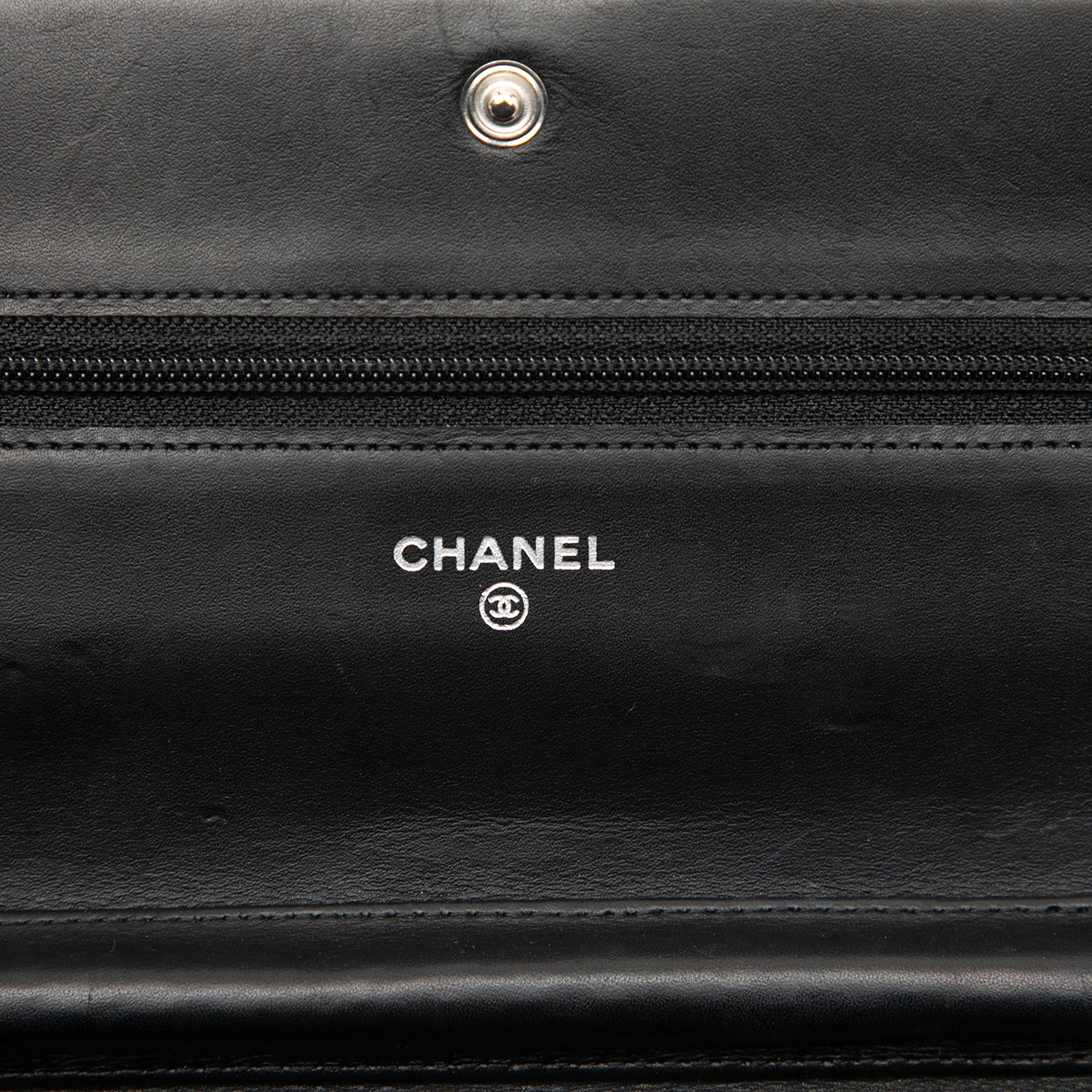 Product Details: Black Chanel Lambskin Cambon Ligne Wallet On Chain Crossbody Bag. This wallet on chain features a quilted lambskin leather body, a leather woven chain strap, a top flap with snap button closure, and interior zip and slip compartments. 4.7" L x 7.5" W x 1.6" D. Serial number 16425860.