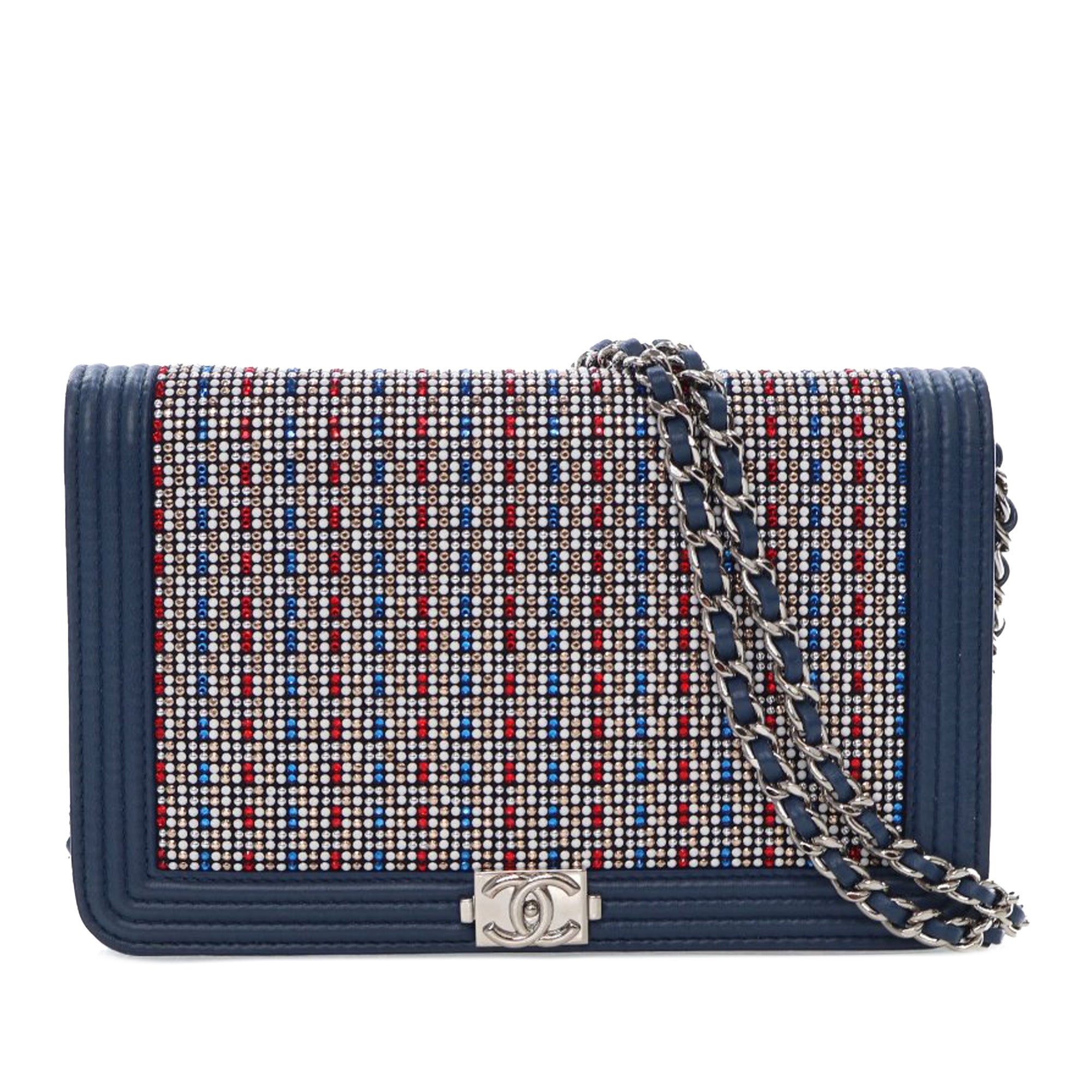 Blue Chanel Crystal Embellished Lambskin Boy Wallet On Chain Crossbody Bag - Designer Revival Blue Chanel Crystal Embellished Lambskin Boy Wallet On Chain Crossbody Bag - Designer Revival