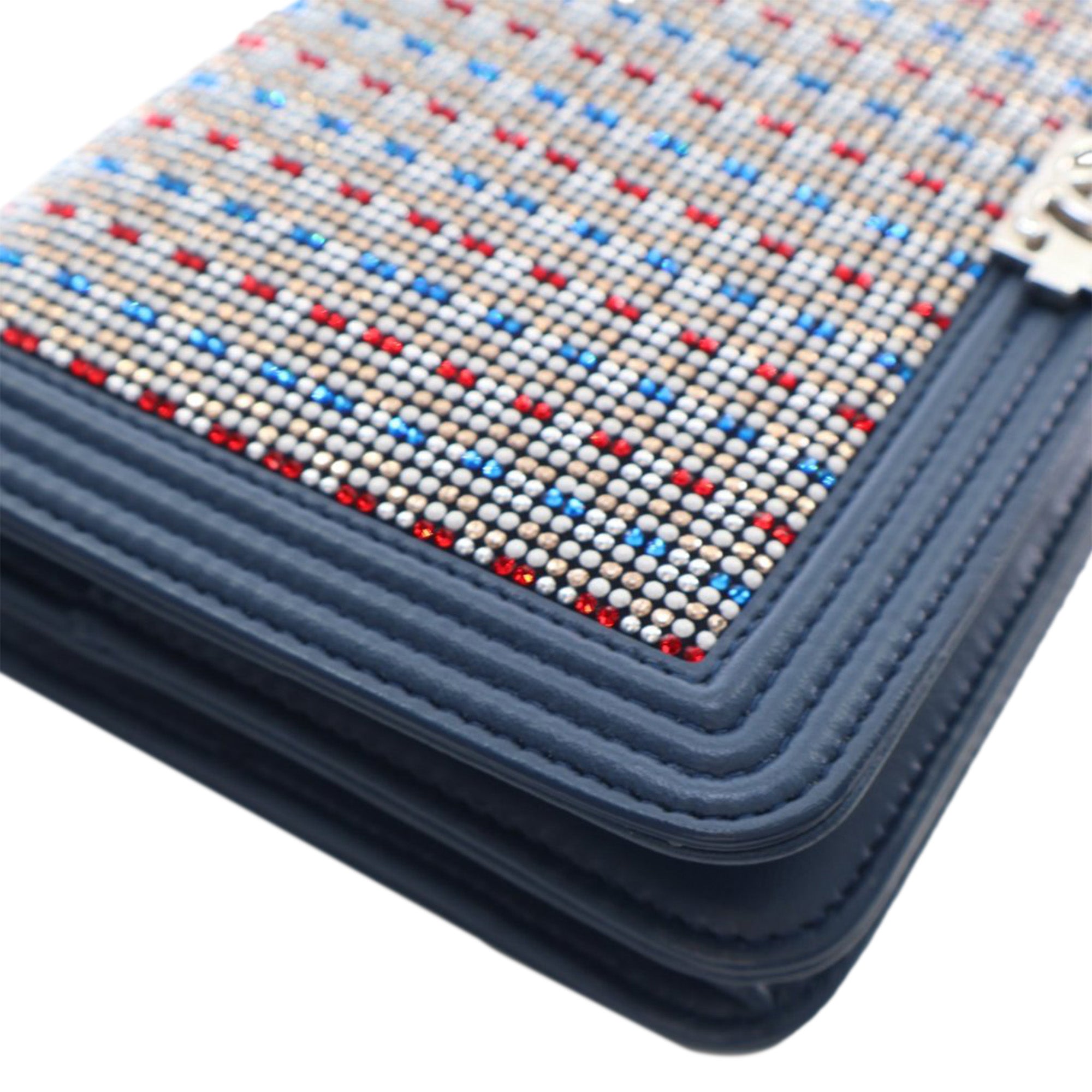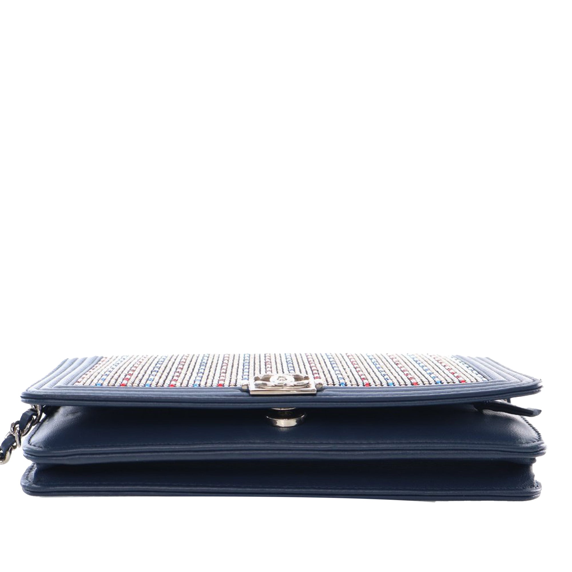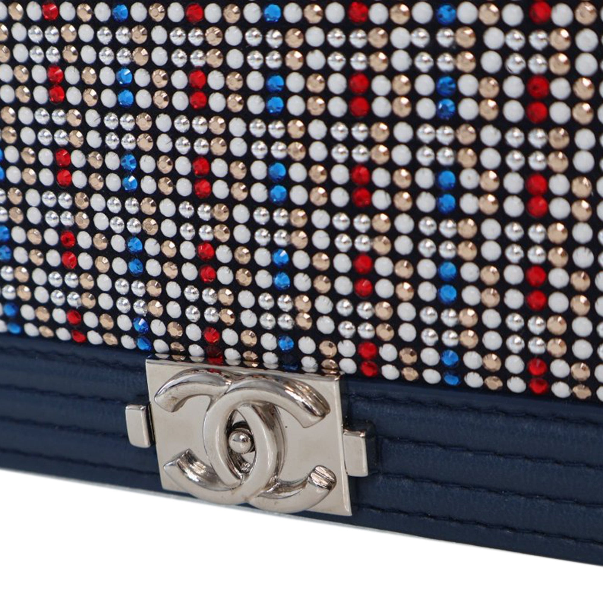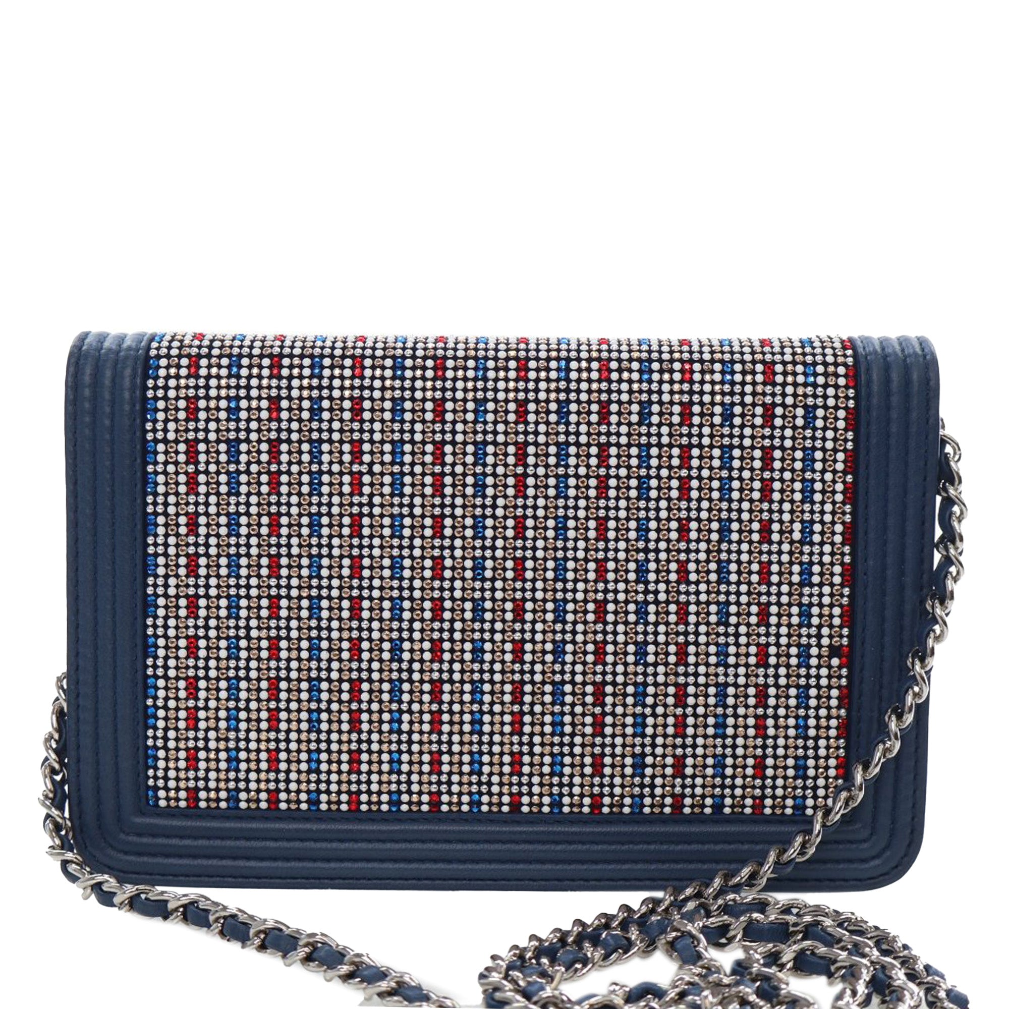 Product Details: Blue Chanel Crystal Embellished Lambskin Boy Wallet On Chain Crossbody Bag. The Boy wallet on chain features a lambskin leather body with crystal embellishments, leather woven chain straps, a front flap with magnetic closure, and interior zip and slip pockets. 5.1" L x 7.5" W x 1.6" D.
