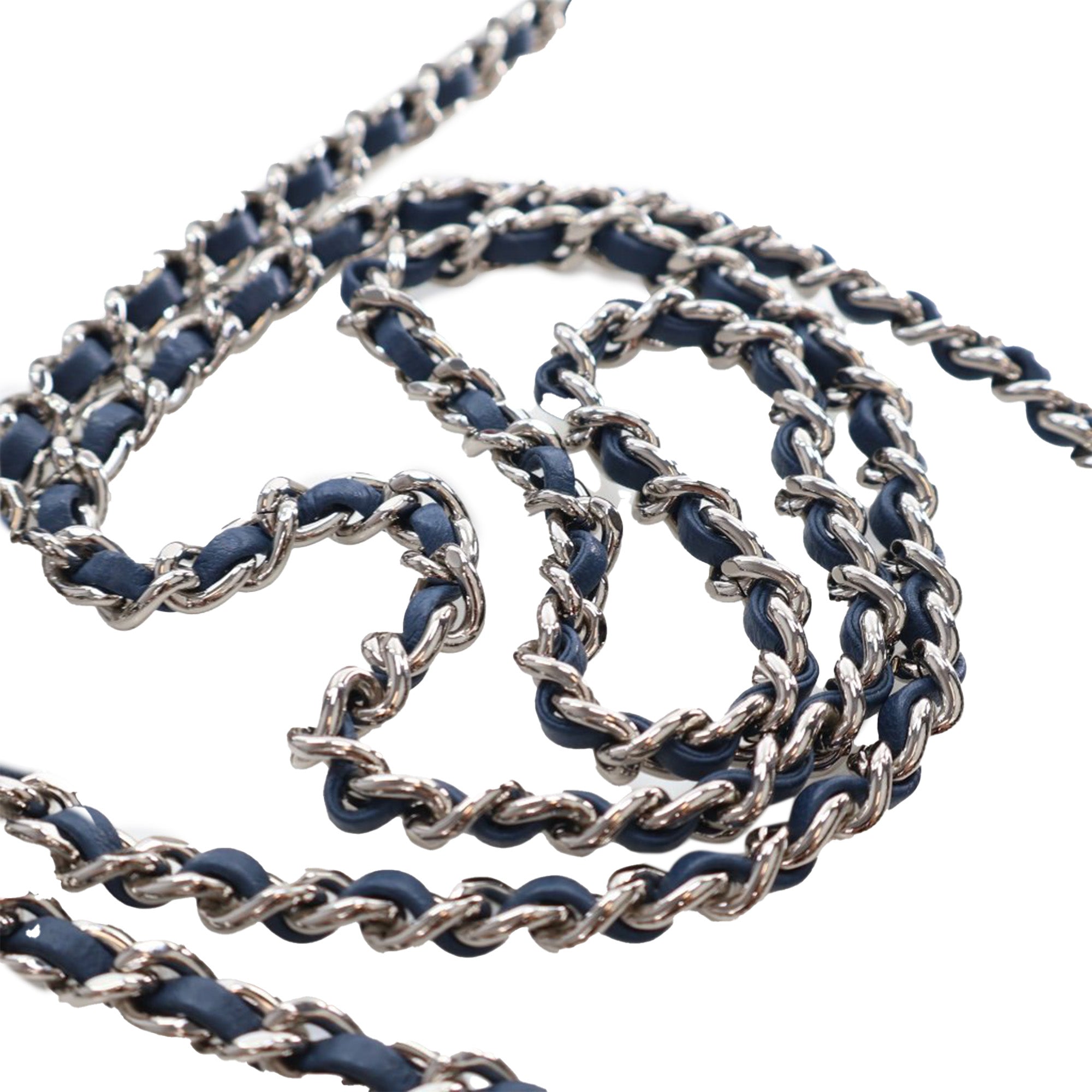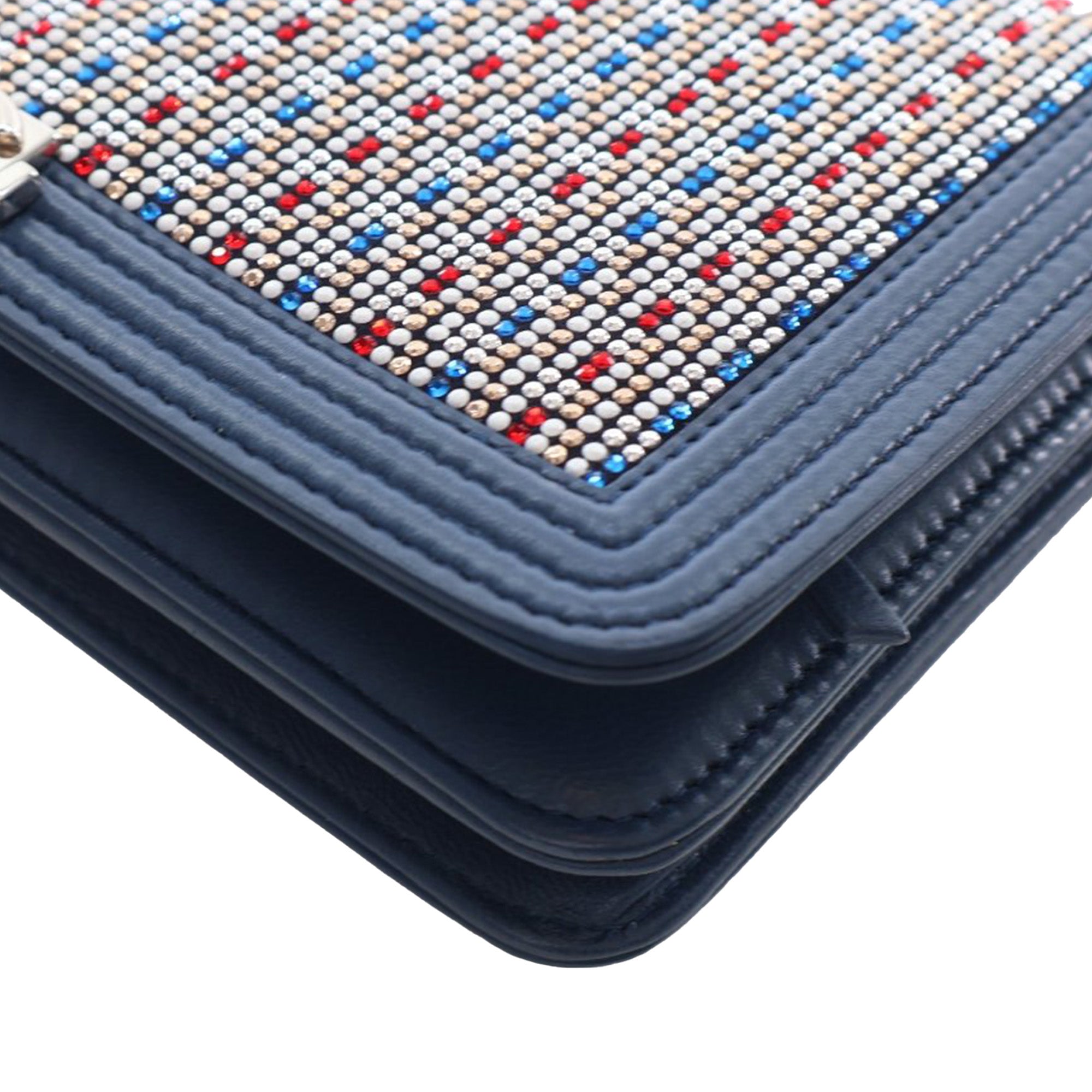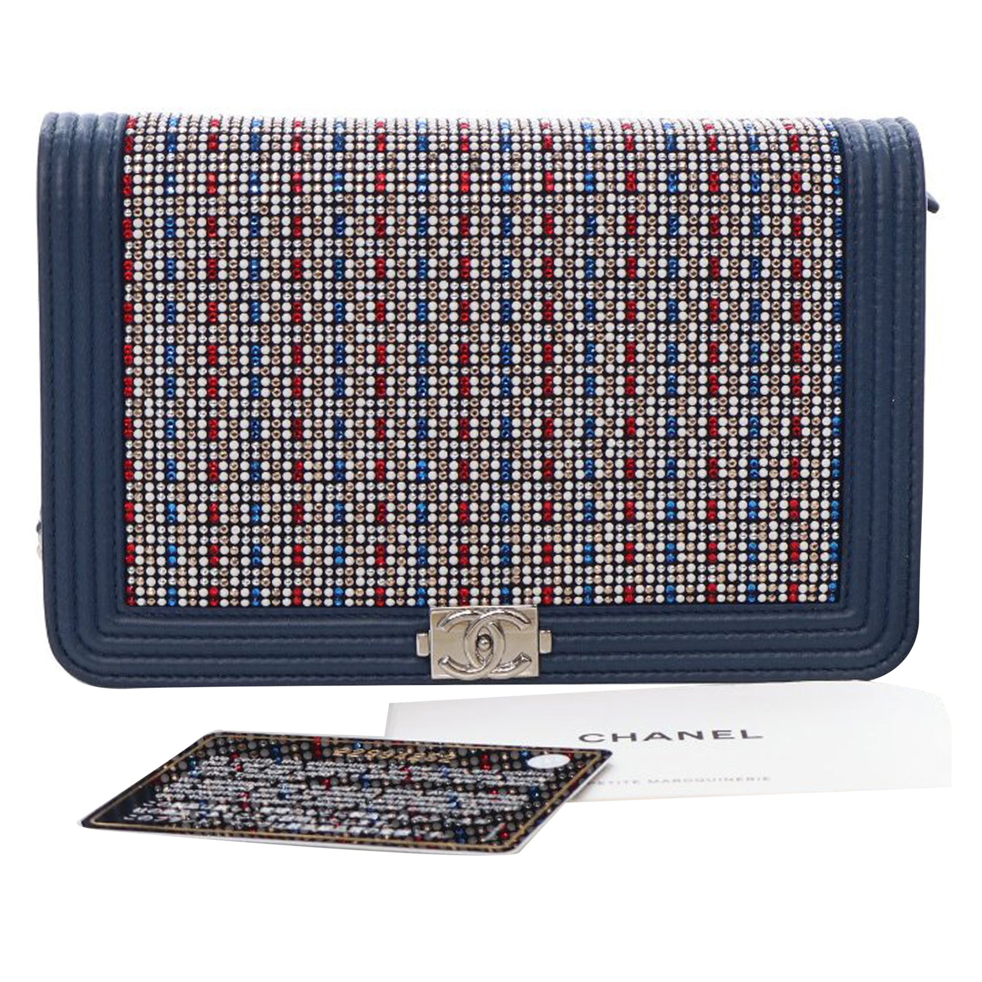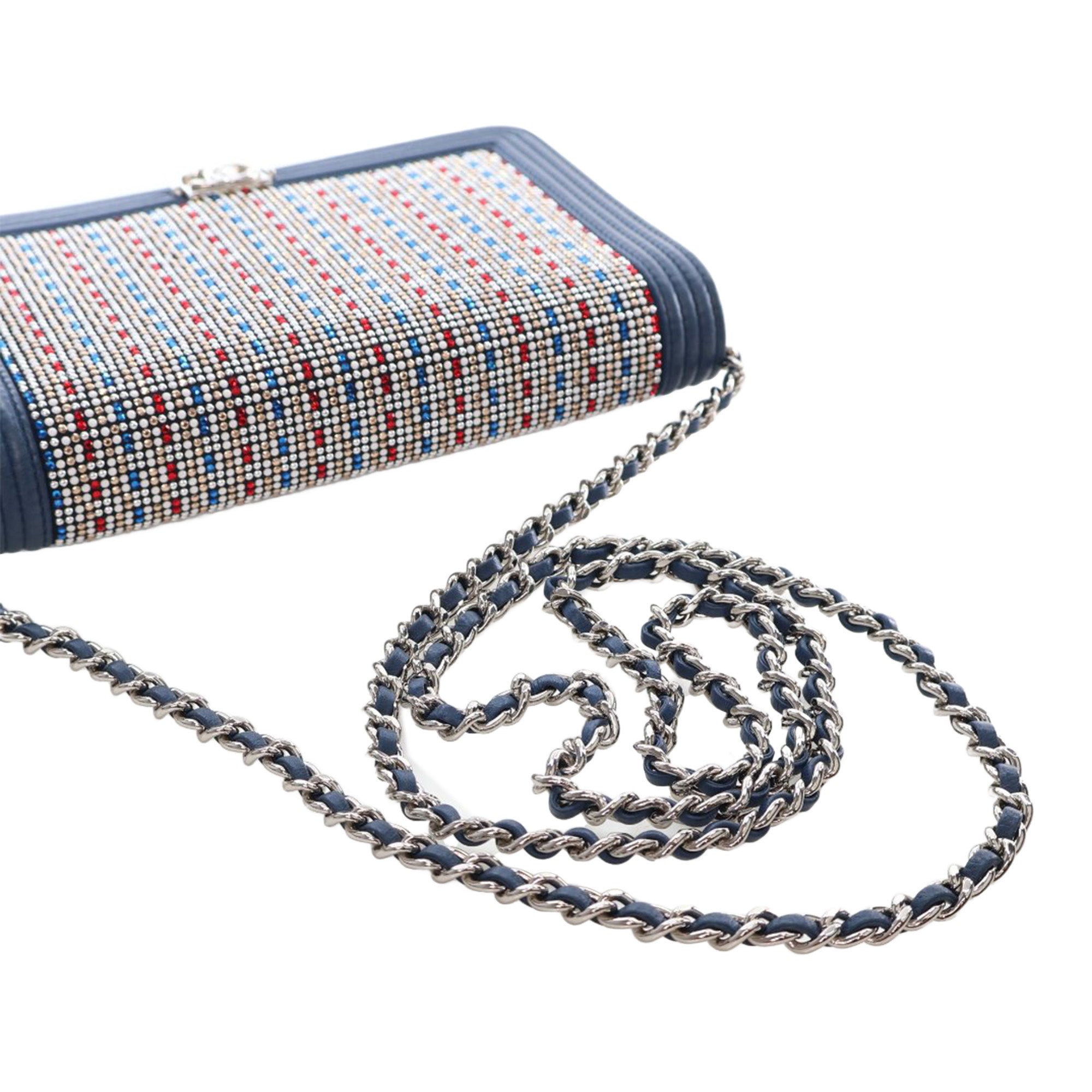 Product Details: Blue Chanel Crystal Embellished Lambskin Boy Wallet On Chain Crossbody Bag. The Boy wallet on chain features a lambskin leather body with crystal embellishments, leather woven chain straps, a front flap with magnetic closure, and interior zip and slip pockets. 5.1" L x 7.5" W x 1.6" D.