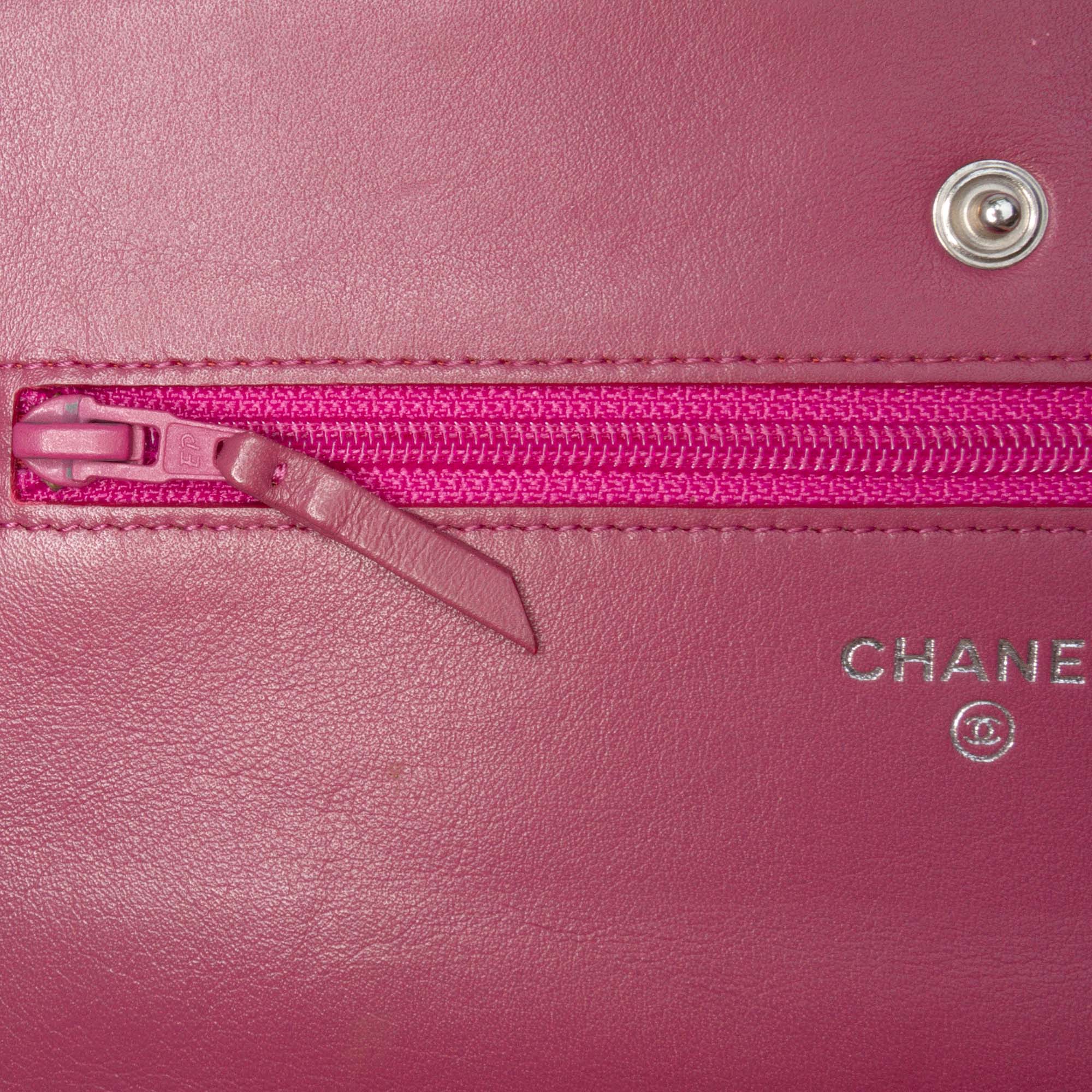 Product Details: Pink Chanel Patent CC Lipstick Wallet On Chain Crossbody Bag. The Lipstick WOC features a patent leather body, a fabric woven chain link strap, front flap with magnetic closure, and interior zip and slip pockets. 4.7" L x 7.5" W x 1.6" D. Serial number 16075477.