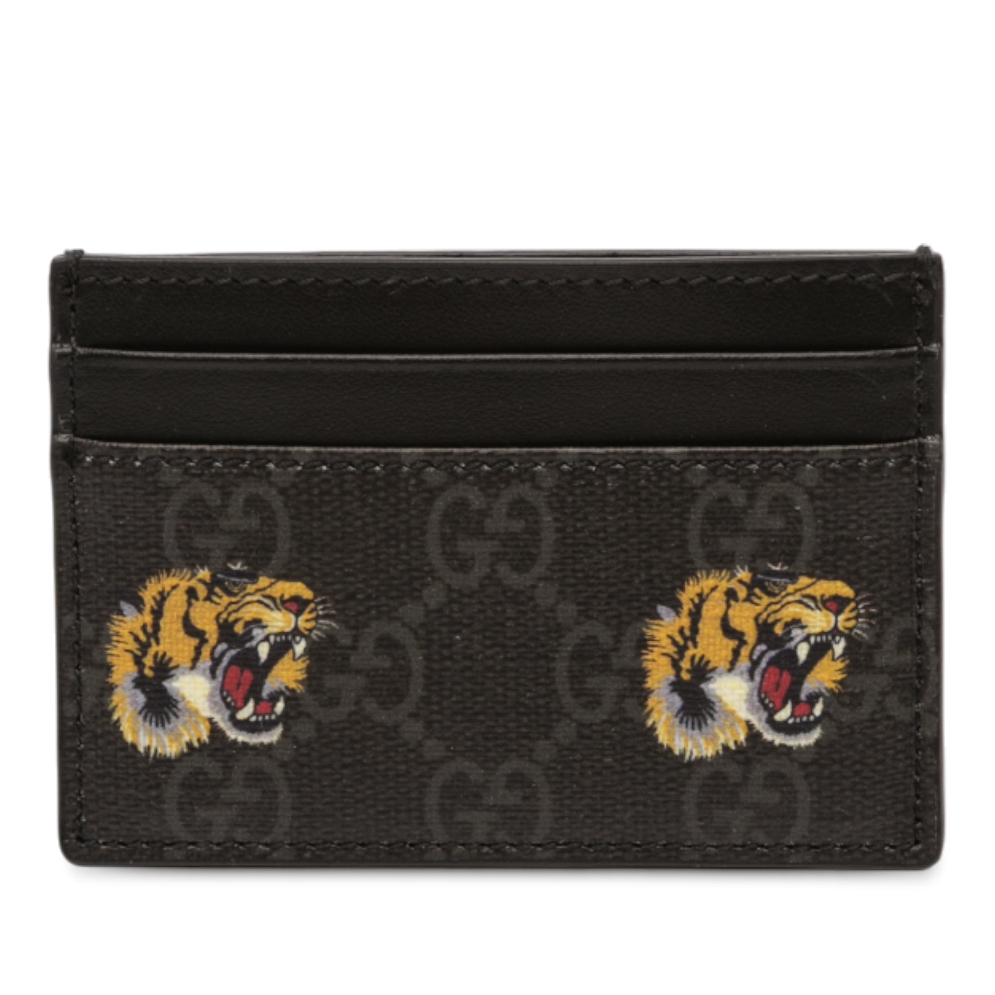 Product Details: Black Gucci GG Supreme Tiger Card Holder. This card holder features a coated canvas body and slip compartments. 2.8" L x 3.9" W x 0" D. Serial number 233166 525040.
