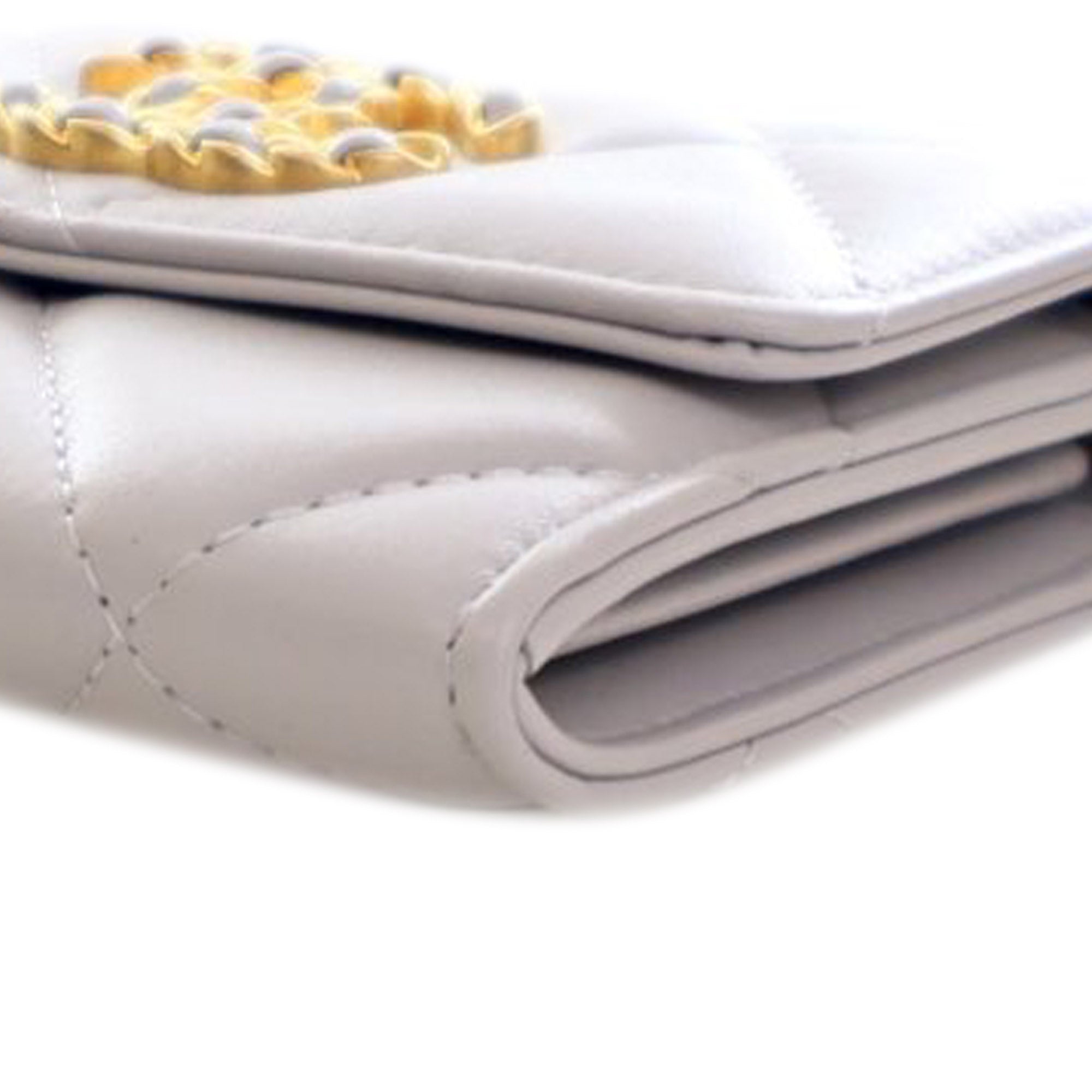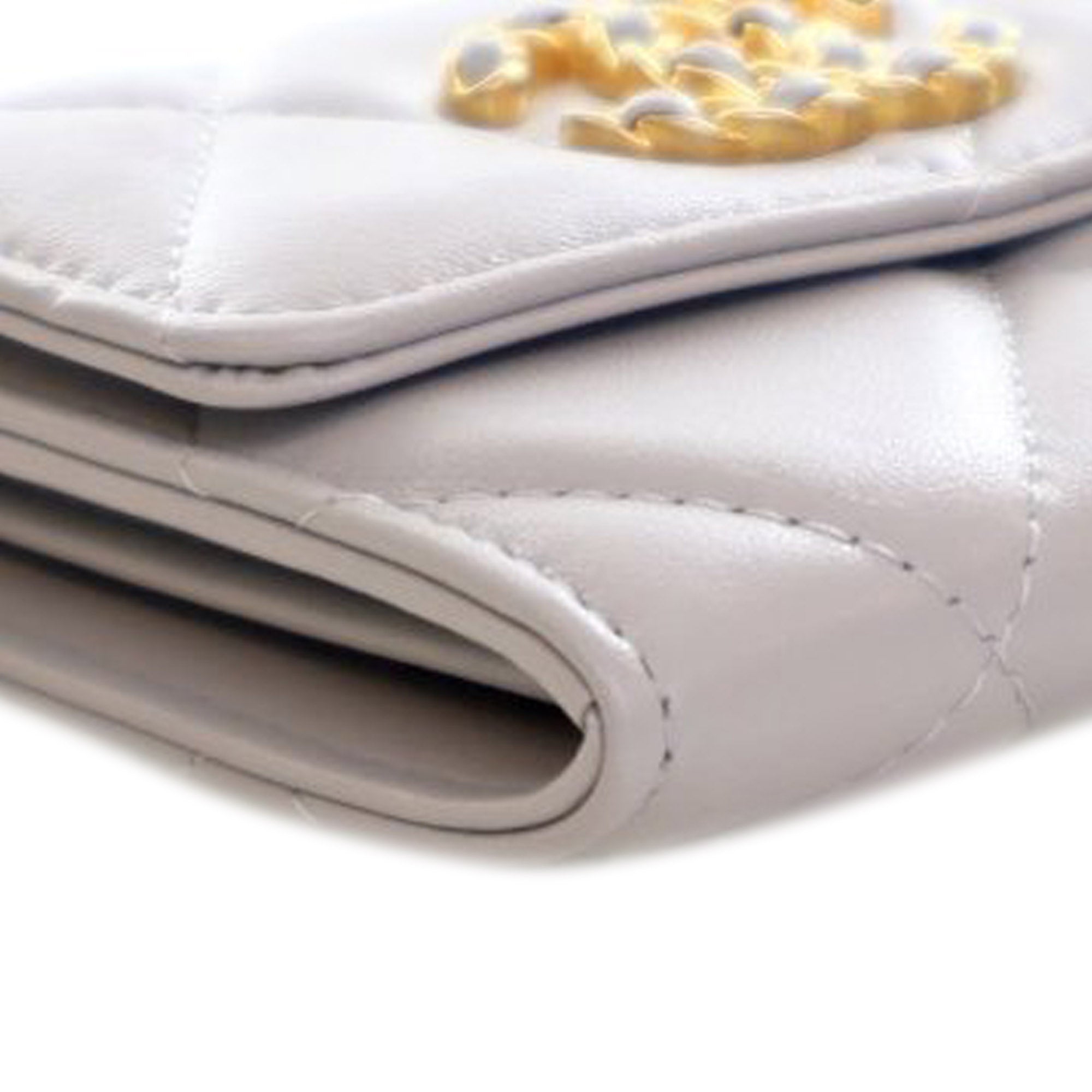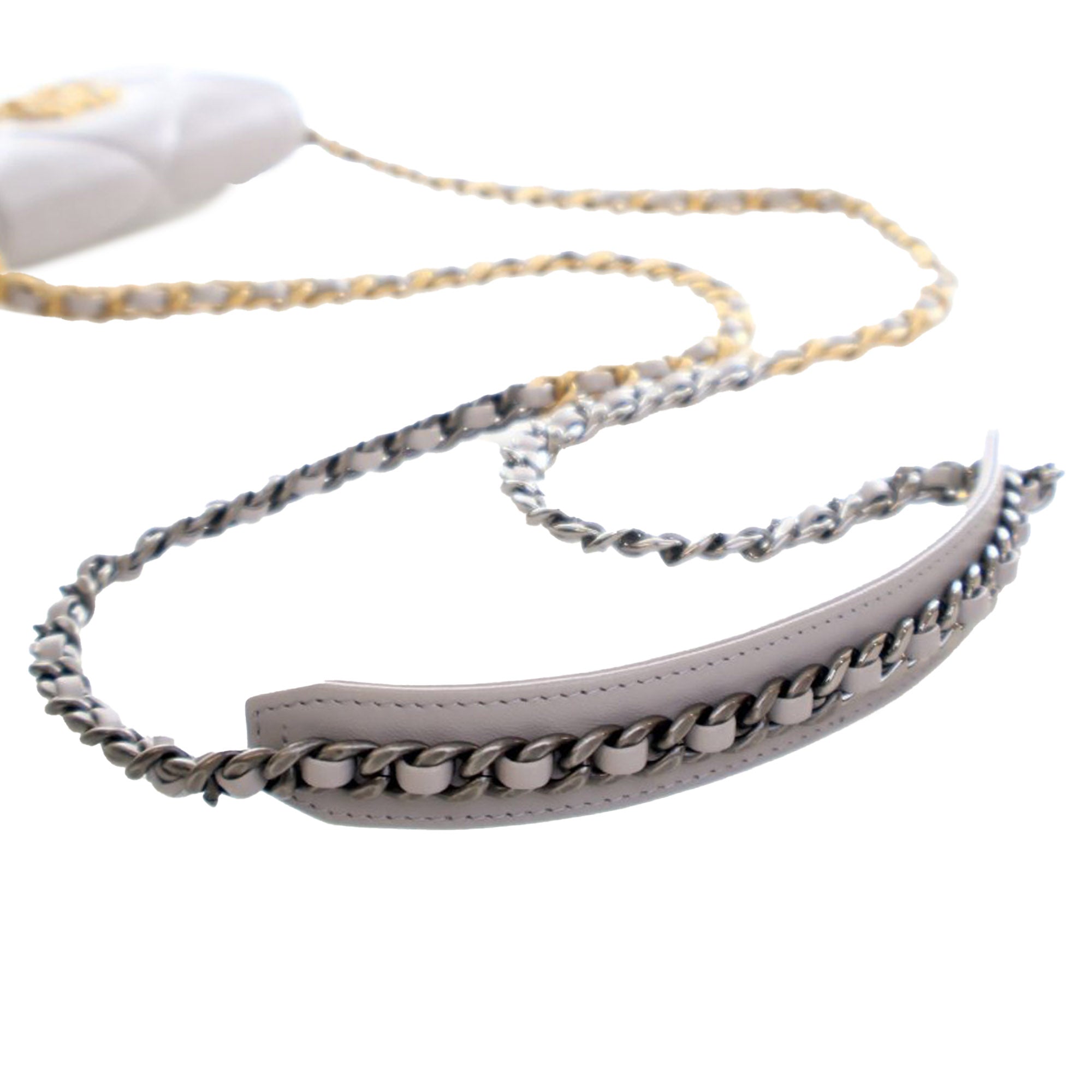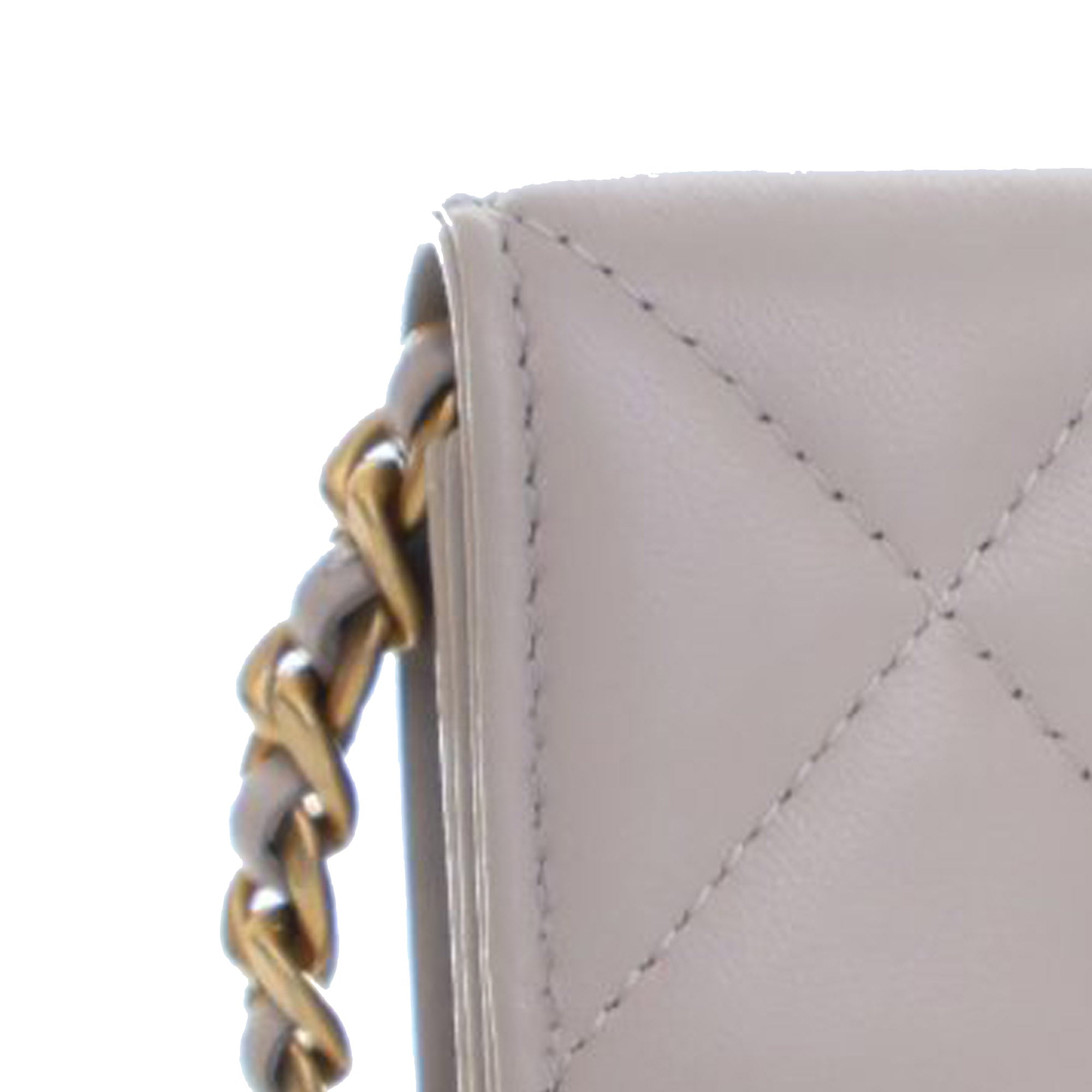 Product Details: Gray Chanel Quilted Lambskin 19 Flap Coin Purse With Chain Crossbody Bag. This crossbody bag features a quilted lambskin leather body, a leather-woven chain strap with leather shoulder guard, and a flap with snap button closure. 3.5" L x 4.3" W x 1" D.