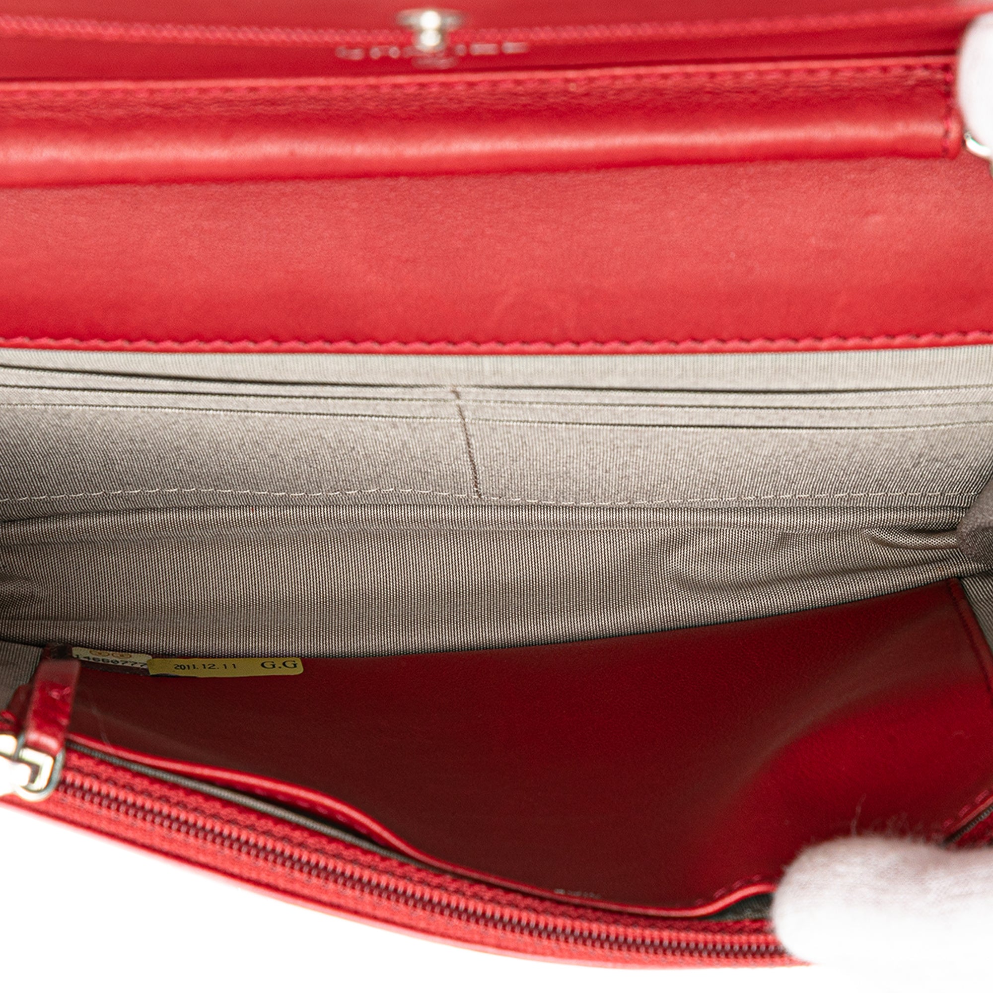 Product Details: Red Chanel CC Calfskin Wallet On Chain Crossbody Bag. This wallet on chain features a caviar leather body, a leather woven chain link strap, a top flap with a magnetic closure, an interior zip compartment, and interior zip and slip pockets. 5.1" L x 7.5" W x 1.2" D. Serial number 14660777.