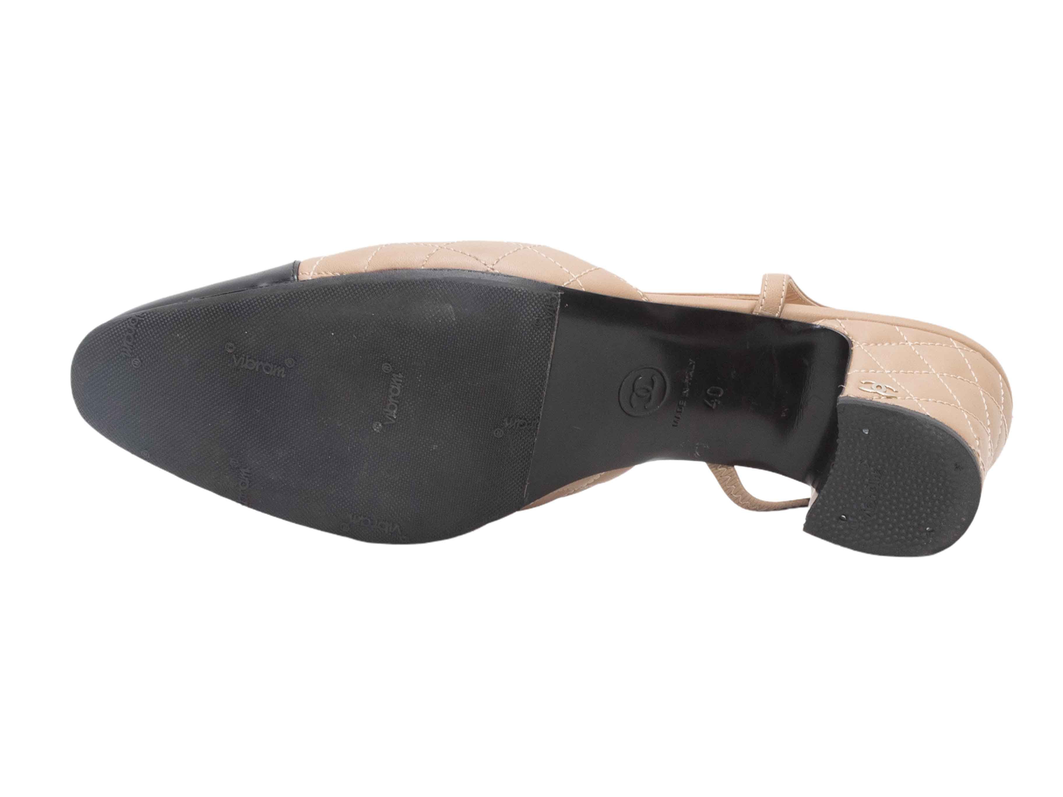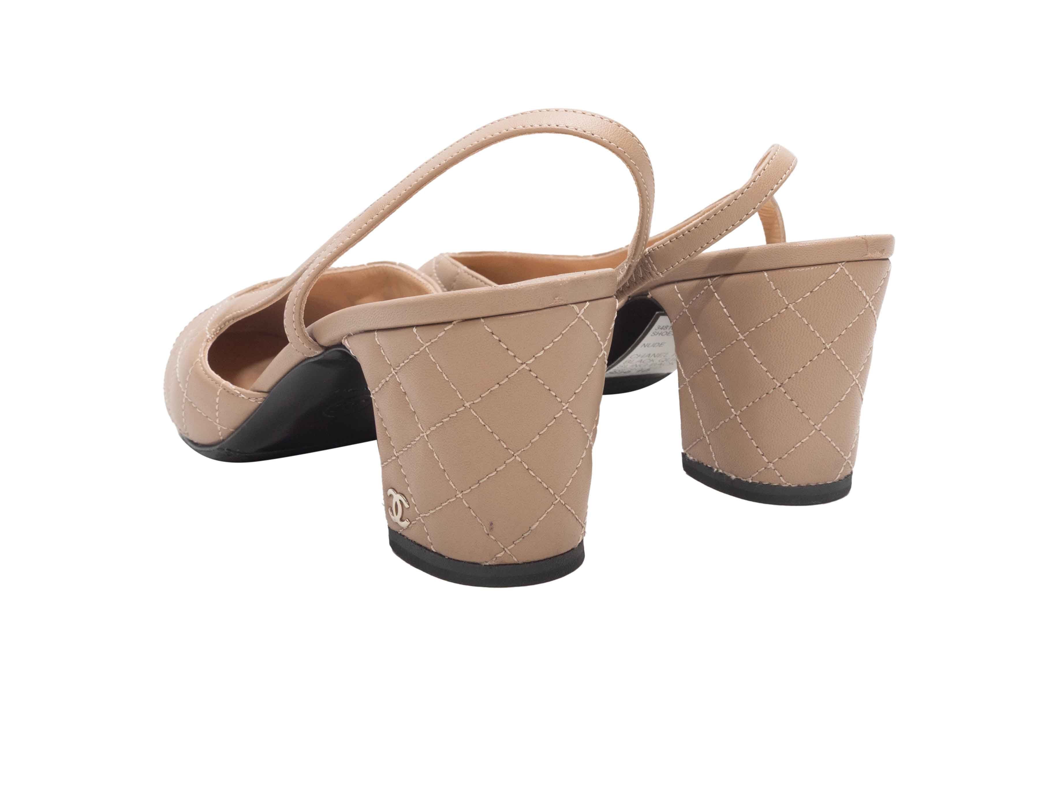 Product Details: Beige quilted leather and black patent leather cap-toe slingback heels by Chanel. Block heels. 2.5" heel height.