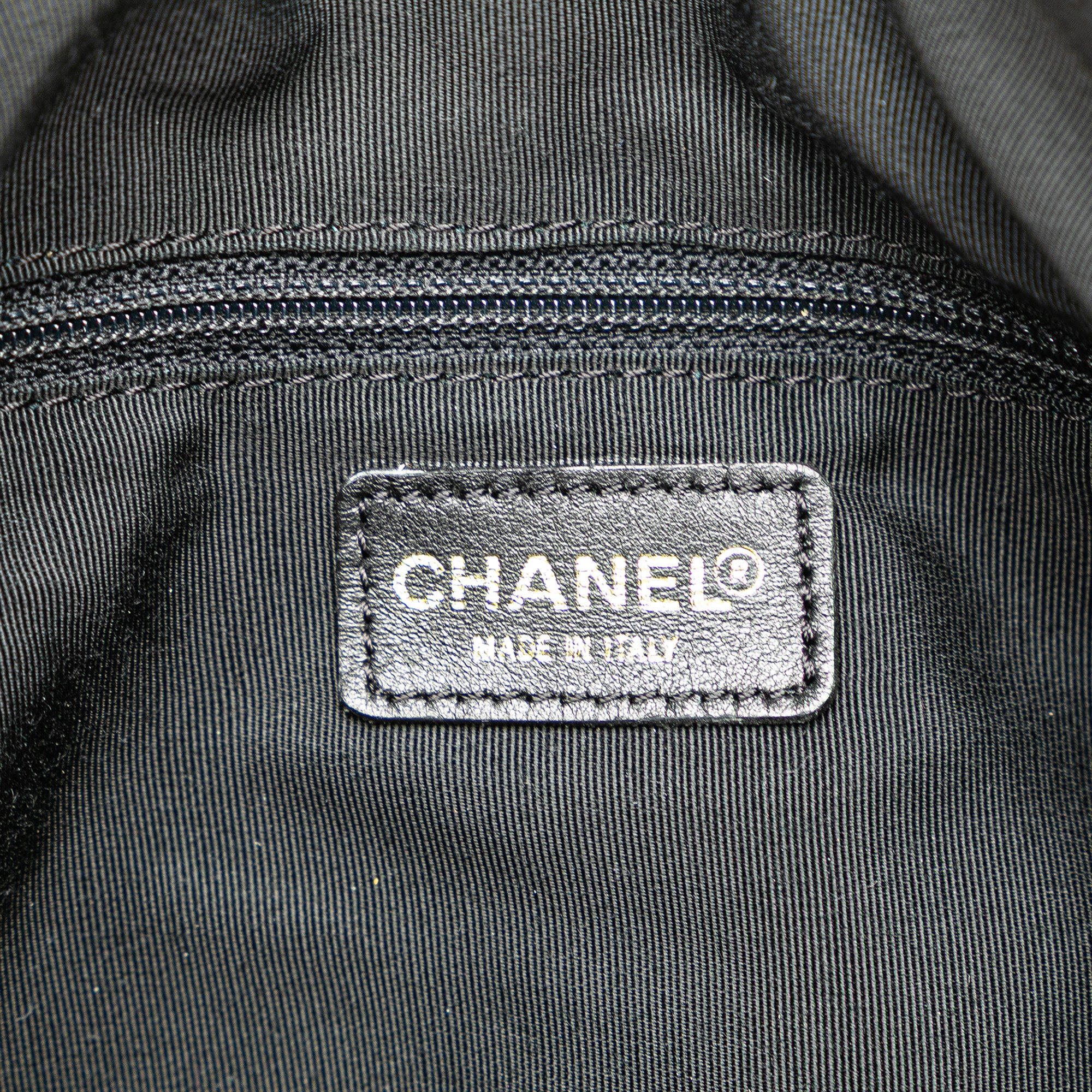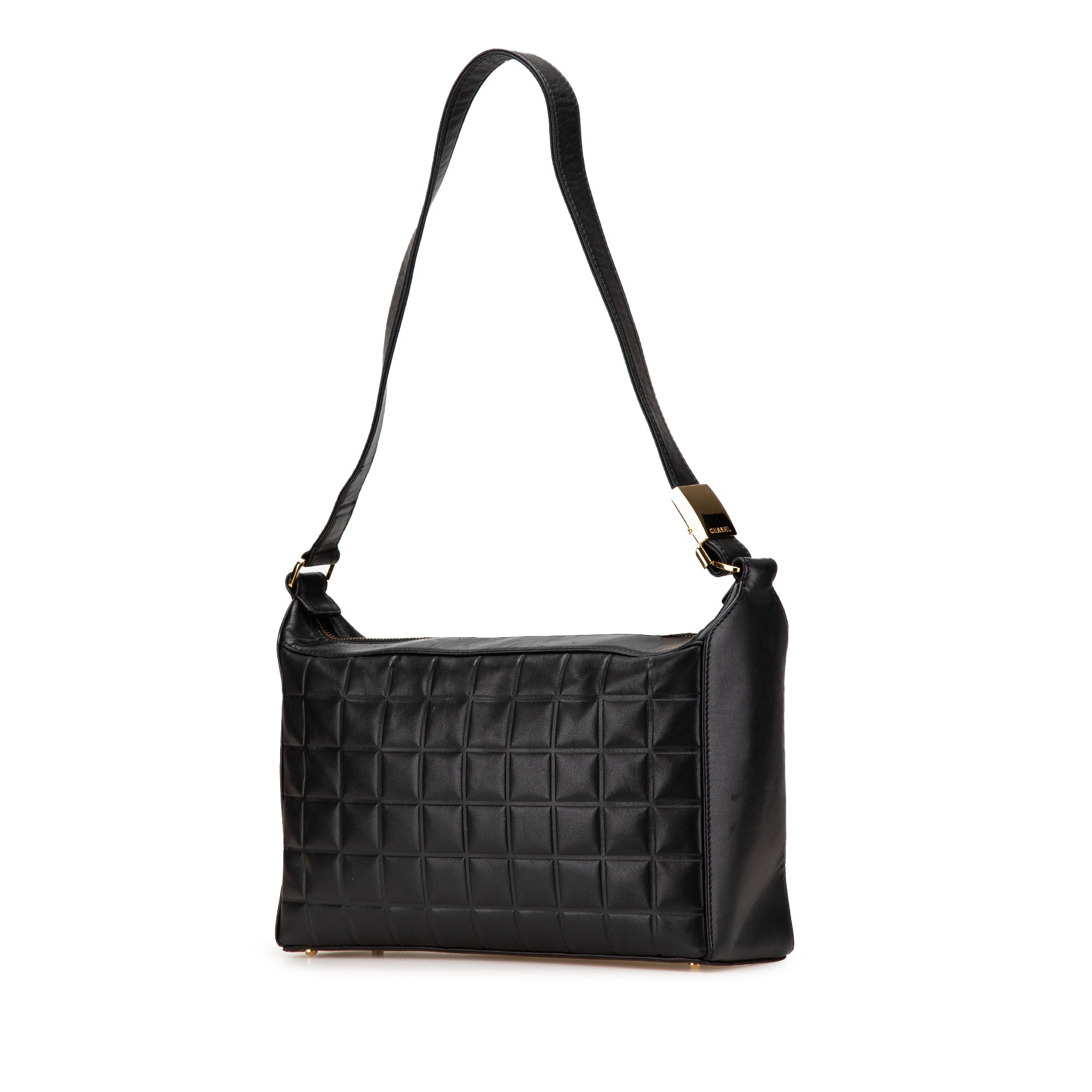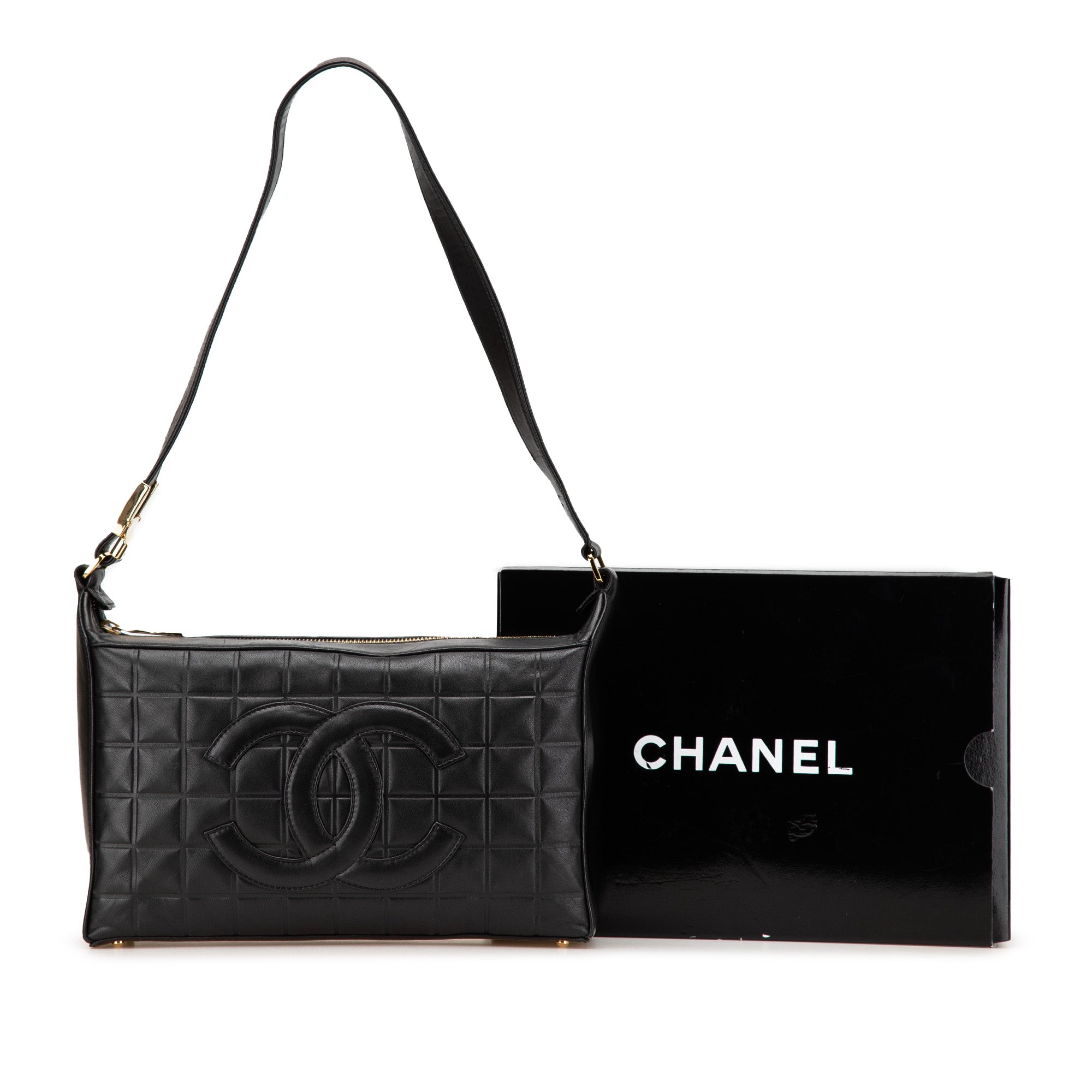 Product Details: Black Chanel CC Choco Bar Lambskin Shoulder Bag. This shoulder bag features a quilted lambskin leather body, a flat leather strap, a top zip closure, and interior zip and slip pockets. 6.3" L x 10.8" W x 3.1" D. Serial number 6911339.