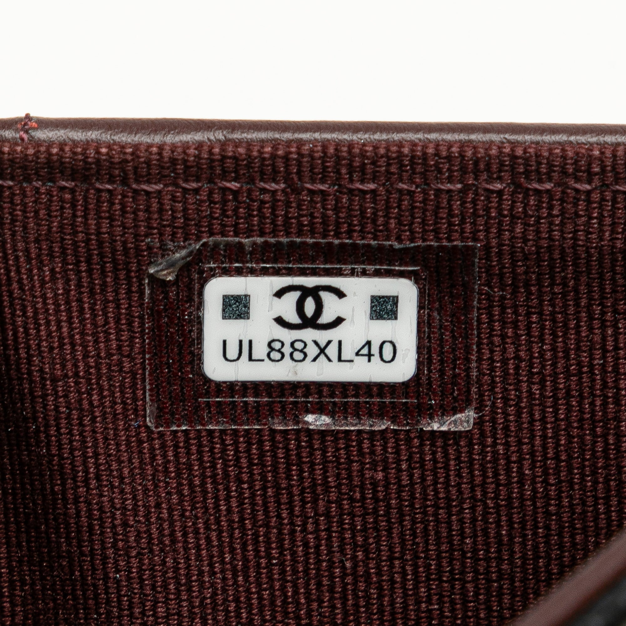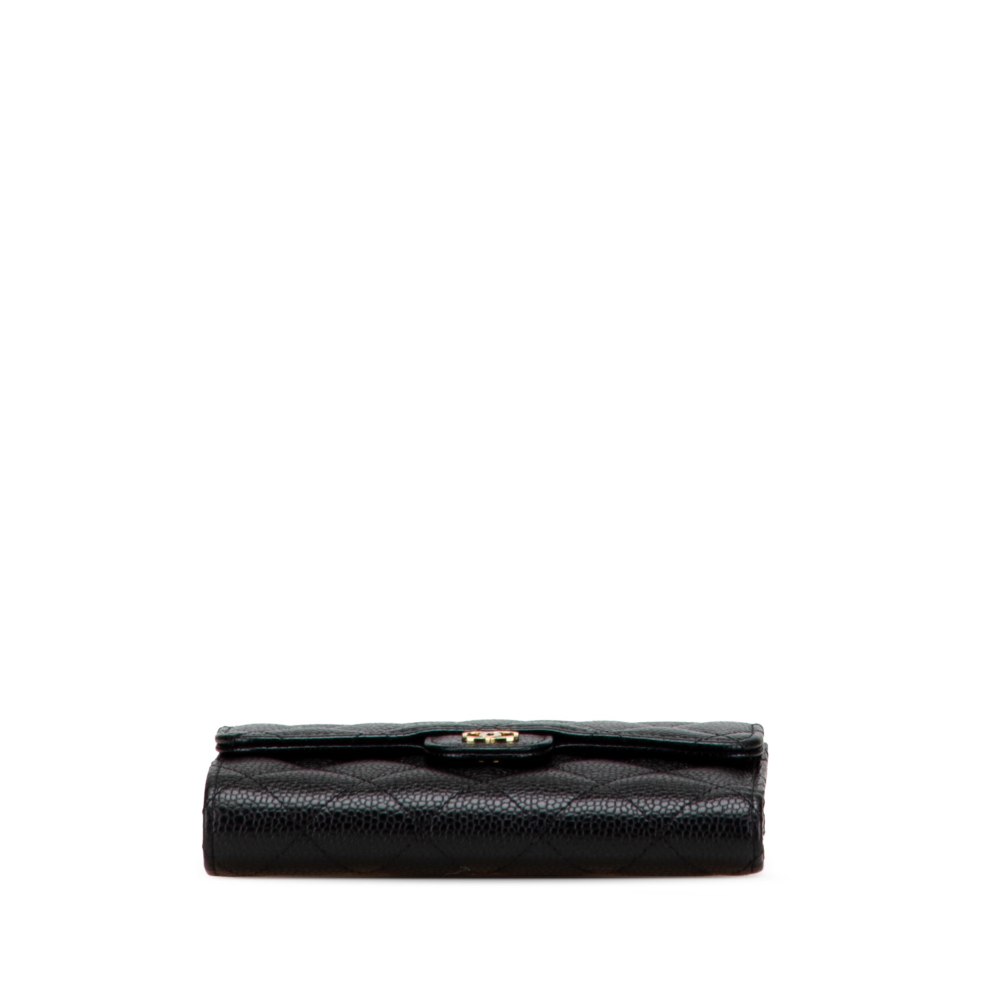 Product Details: Black Chanel CC Quilted Caviar Trifold Flap Wallet. This wallet features a quilted caviar leather body, a flap with snap button closure, an exterior back slip pocket, and interior zip and slip pockets. 2.6" L x 5.9" W x 1.4" D. Serial number UL88XL40.