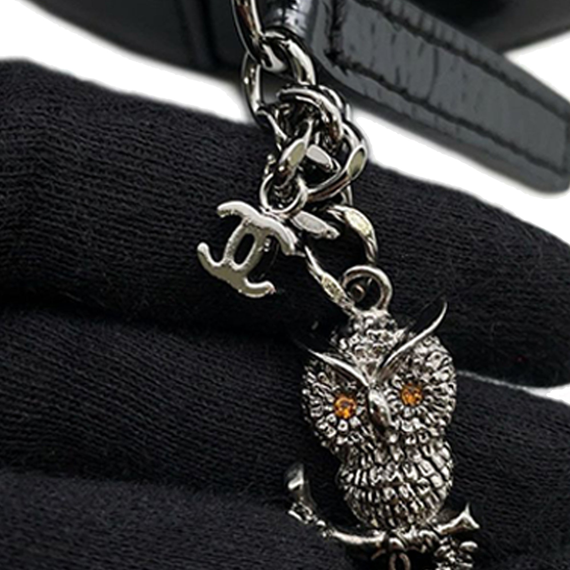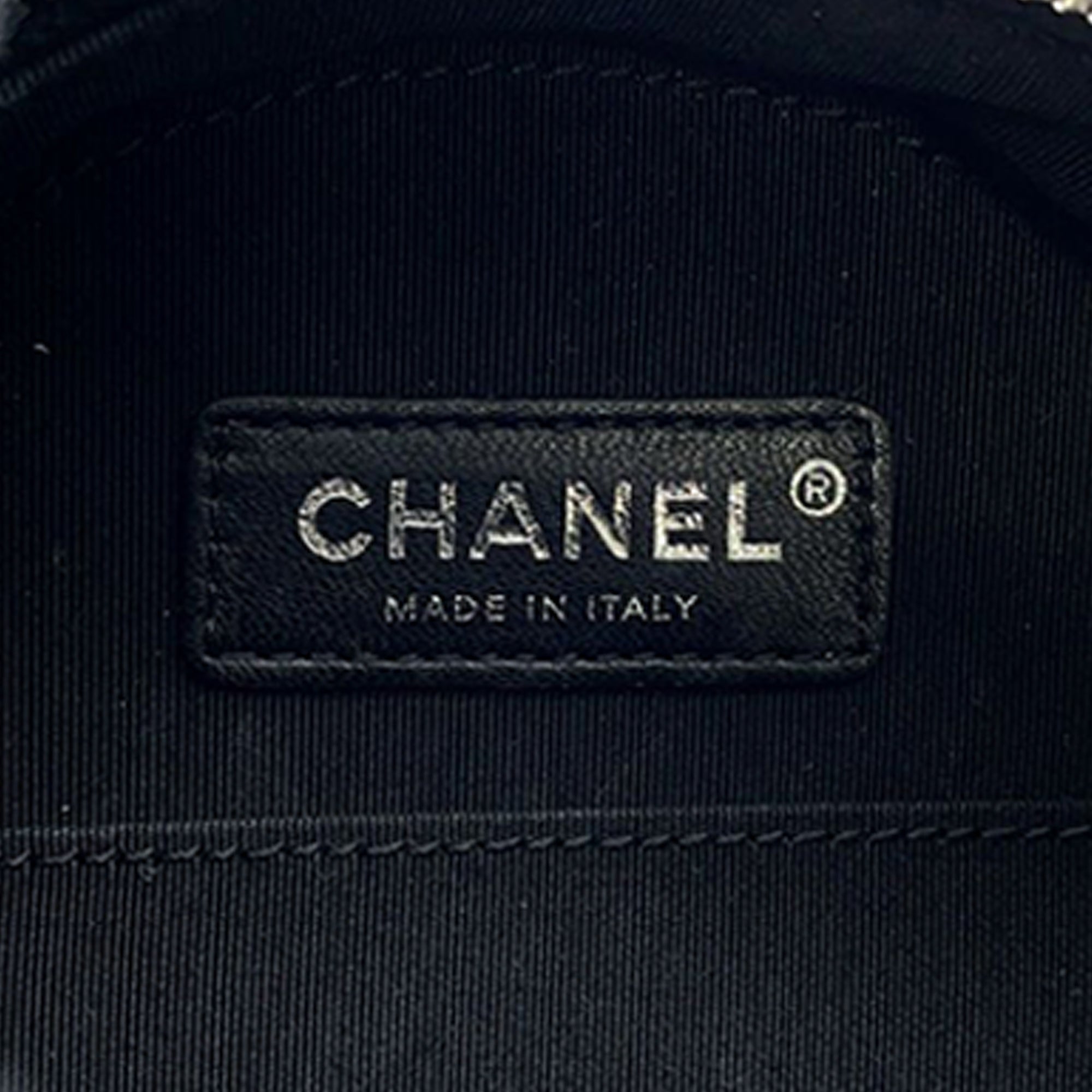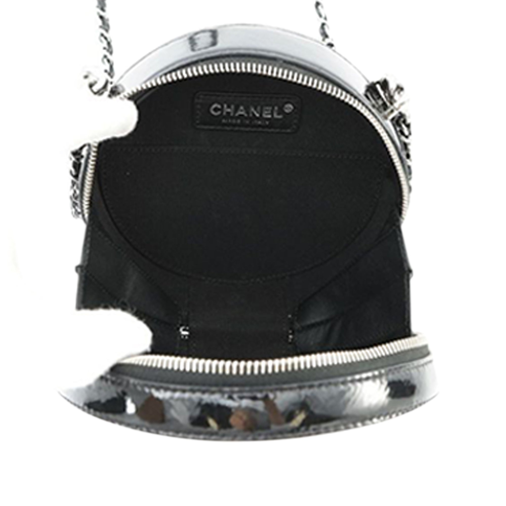 Product Details: Black Chanel Patent Round As Earth Bag Satchel. This satchel features a patent leather body, a chain link handle, a leather woven chain shoulder strap with leather guard, a top zip closure, and an interior slip pocket. 6.1" L x 6.3" W x 2.8" D, 2" drop.