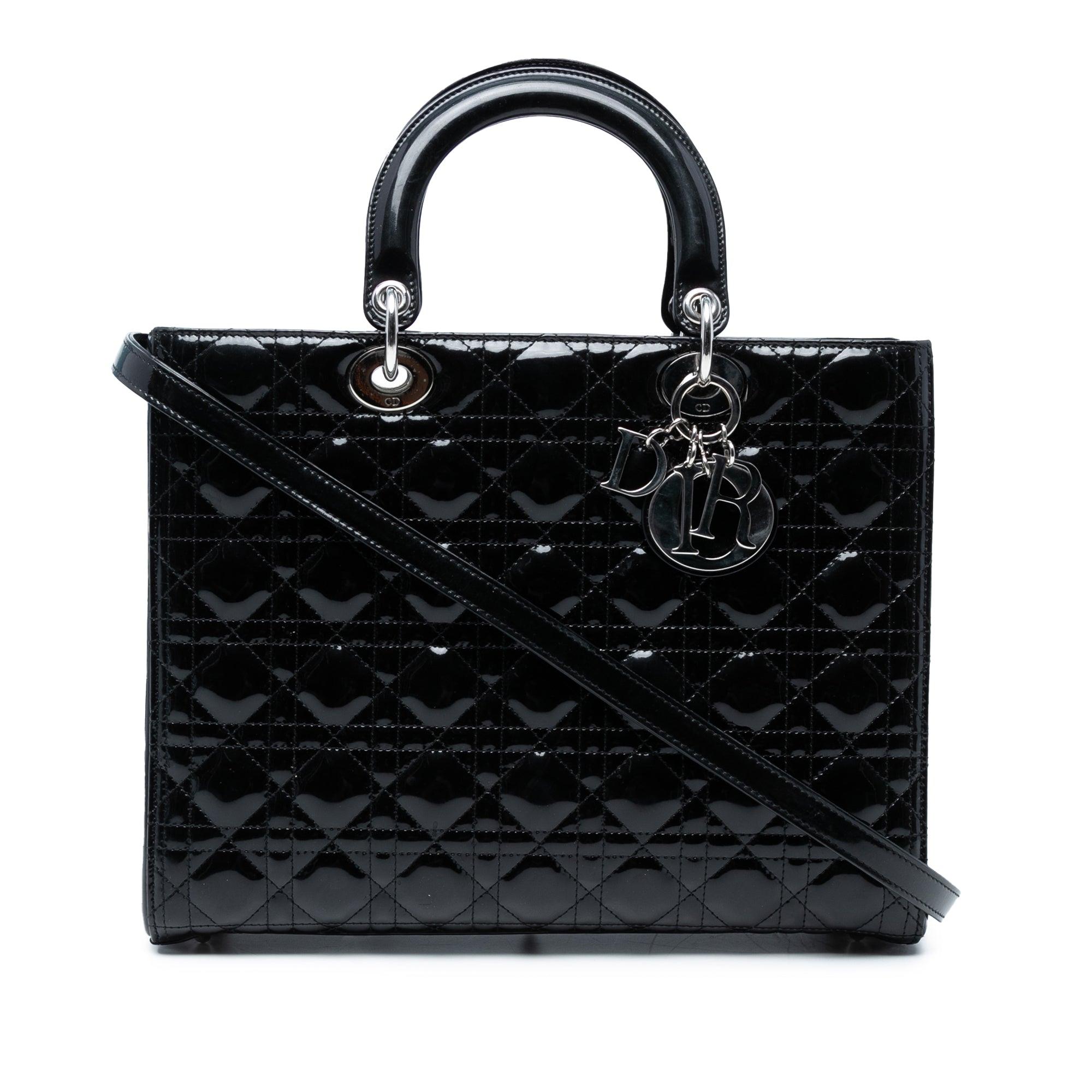 Product Details: Black Dior Large Patent Cannage Lady Dior Satchel. The Lady Dior features a quilted patent leather body, flat leather top handles, a detachable flat strap, a top zip closure, and an interior zip pocket. 10.2" L x 12.6" W x 3.5" D, 3.9" drop. Serial number 16-BO-0114.