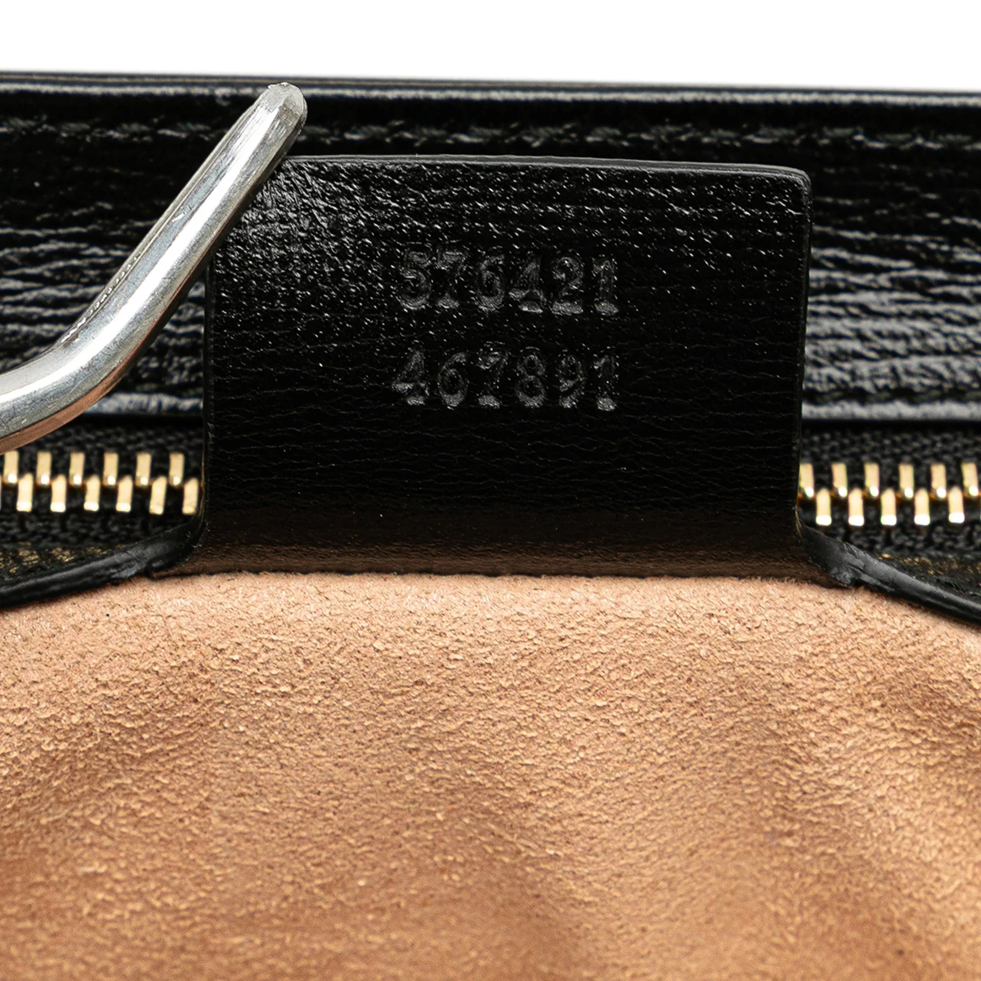Product Details: Black Gucci Small Leather Marina Chain Shoulder Bag. The Marina features a leather body, a chain-link strap, a top flap with magnetic snap closure, and an interior zip pocket. 7.1" L x 9.4" W x 1.6" D. Serial number 576421 467891.