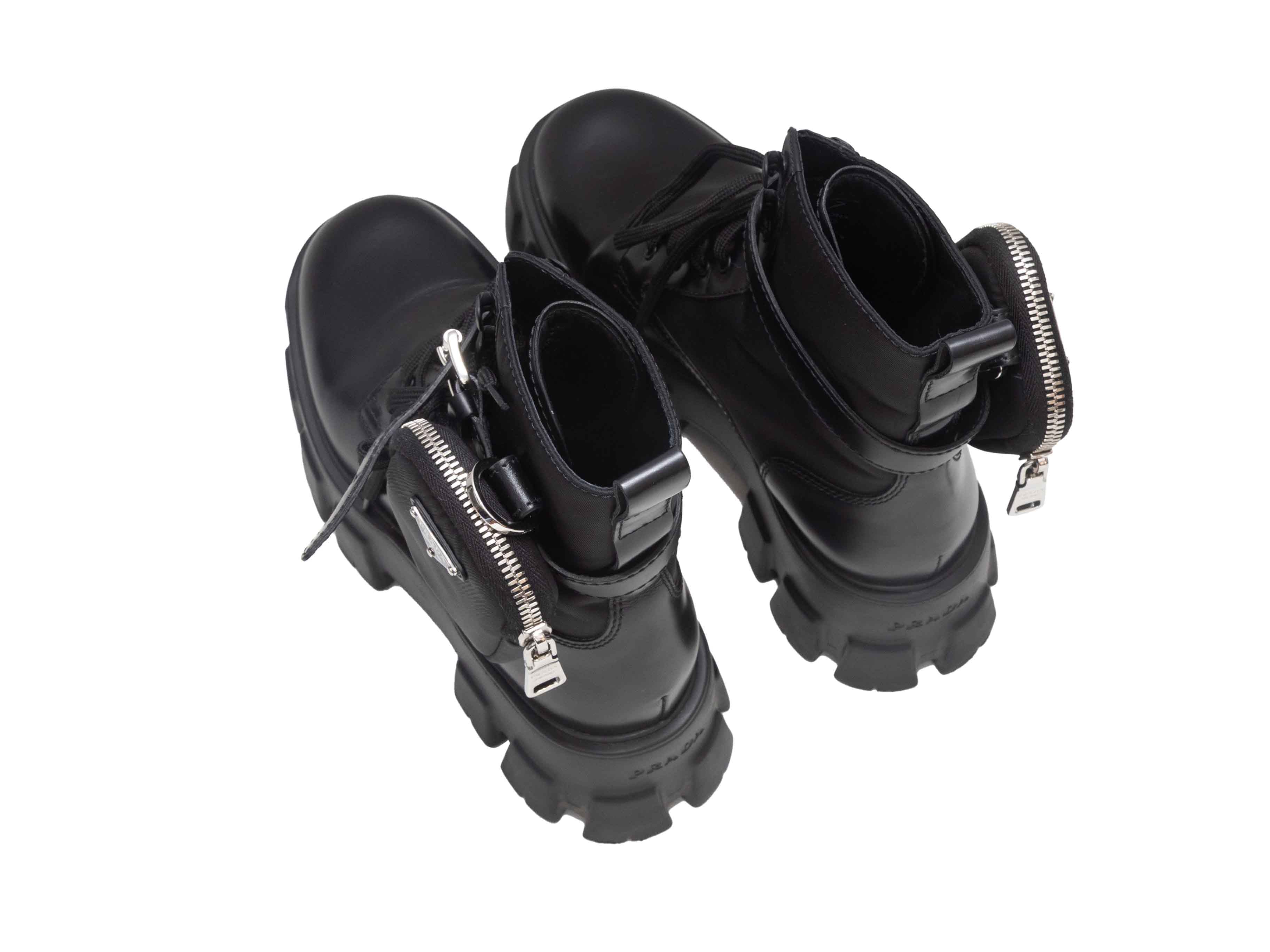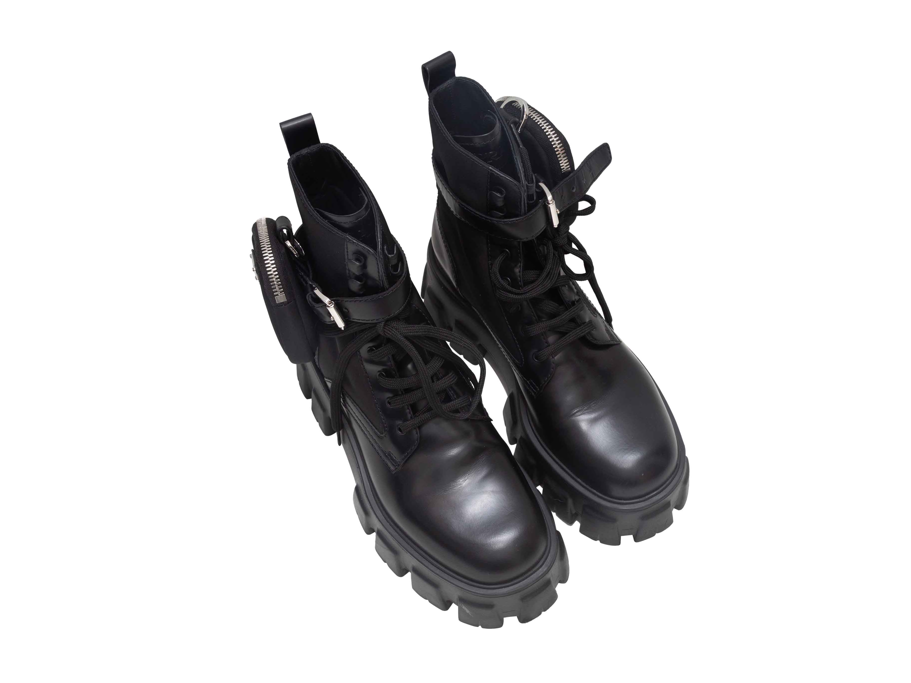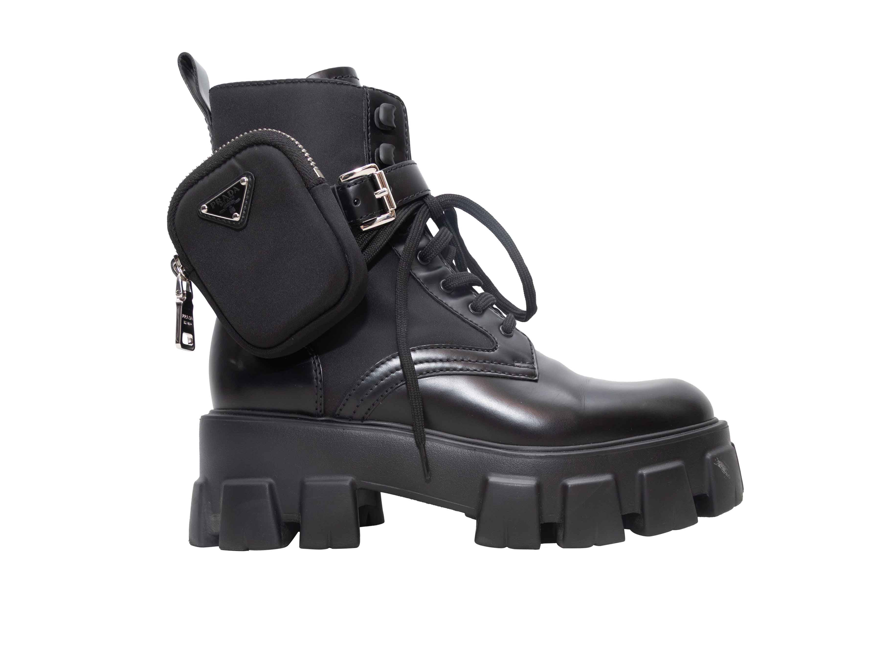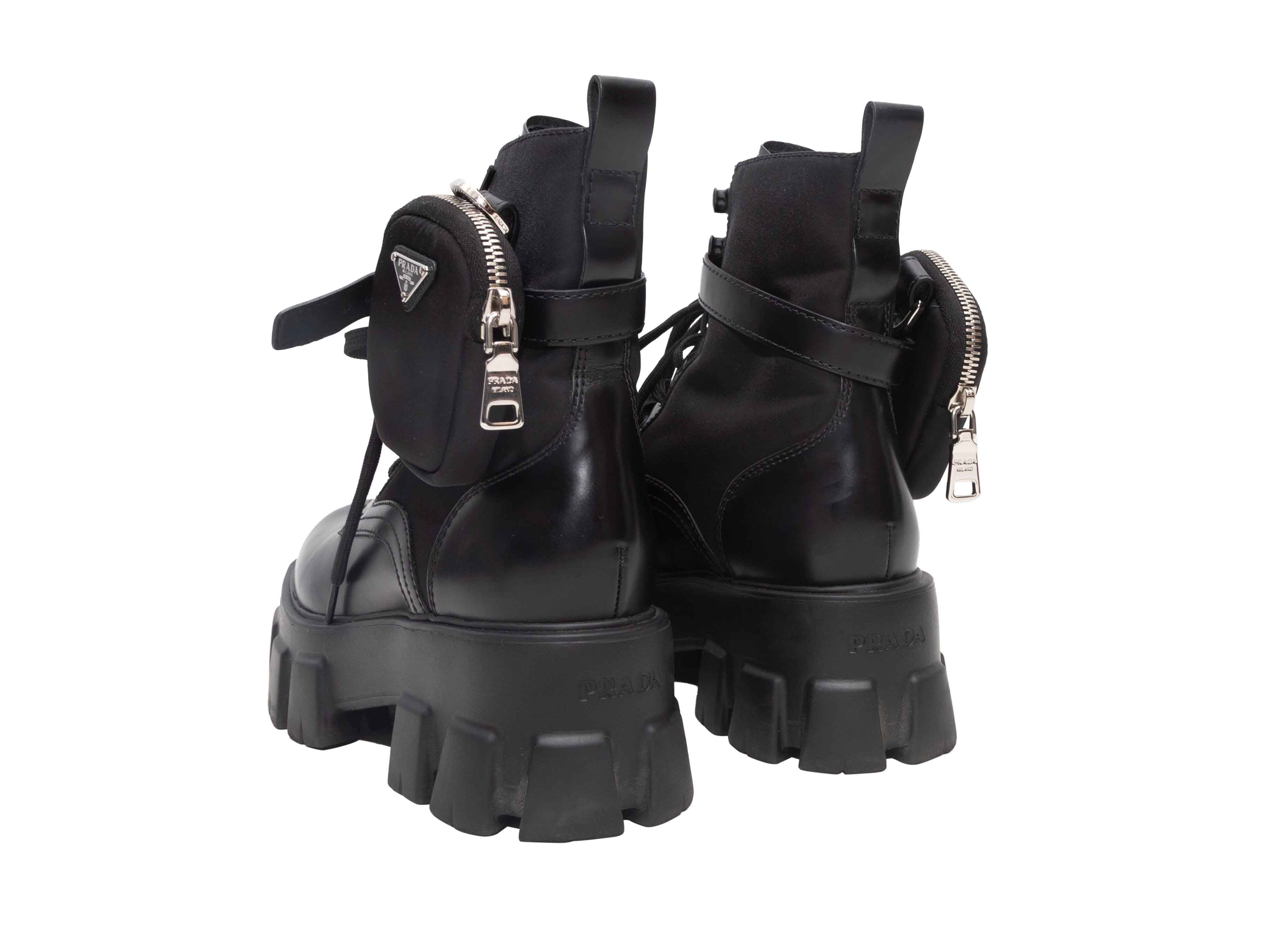 Product Details: Black leather and Tessuto nylon combat boots by Prada. Lug soles. Detachable zip pouches at ankles. Lace-up tie closures at tops. 6" shaft height, 2" platform height, 2" heel height.