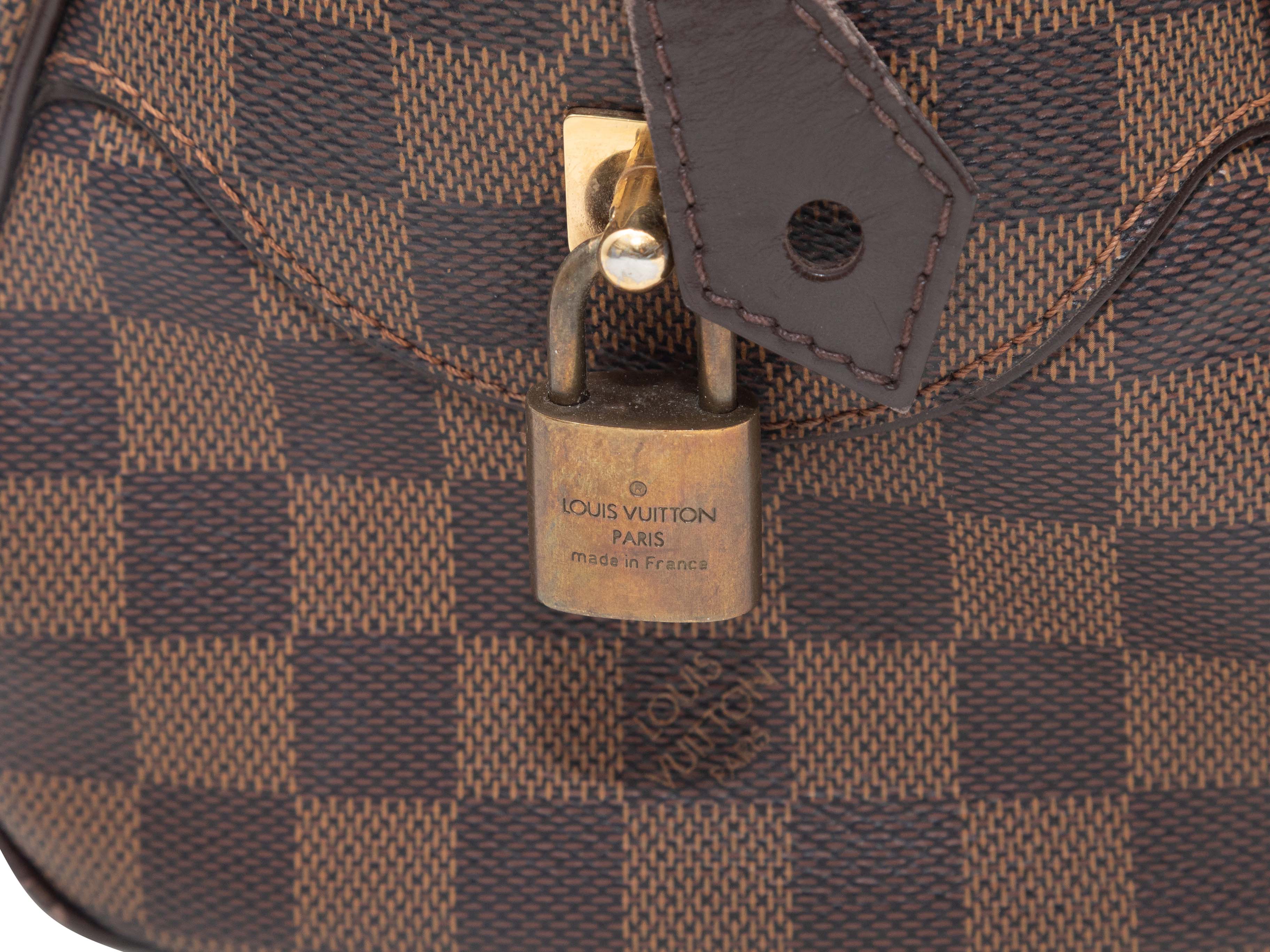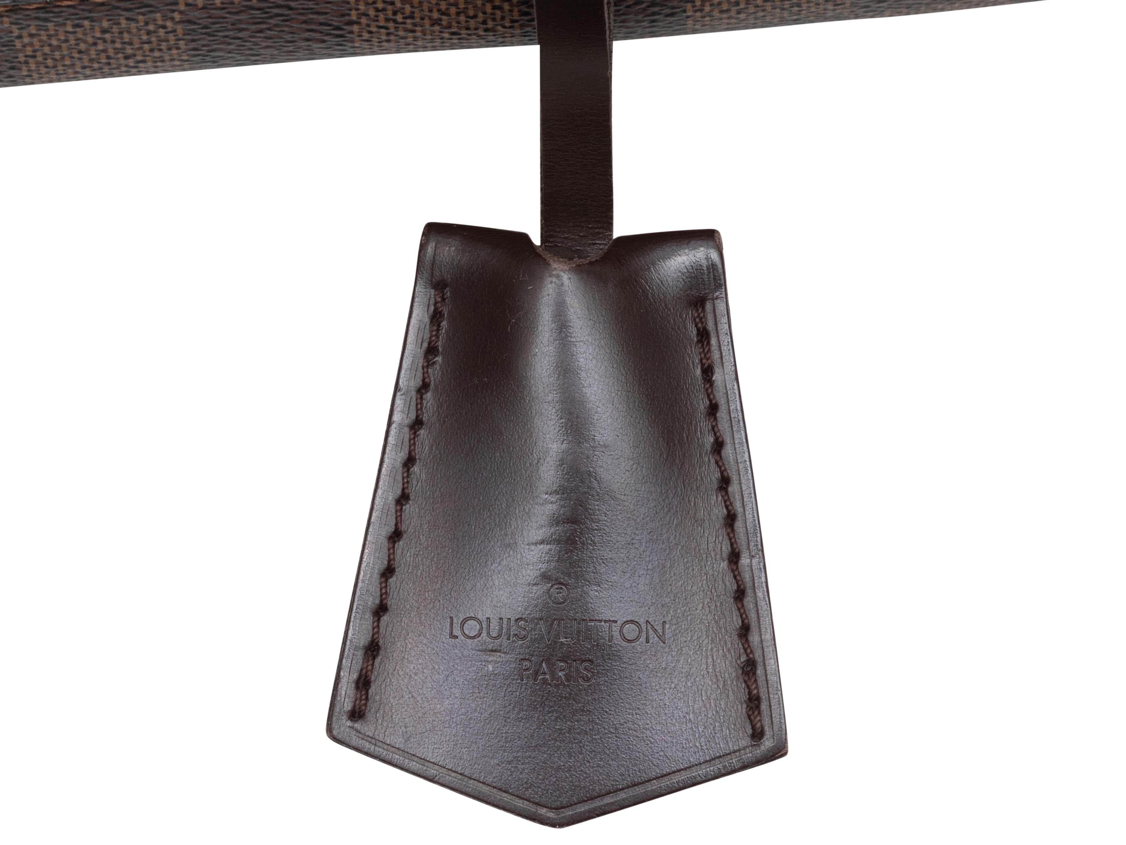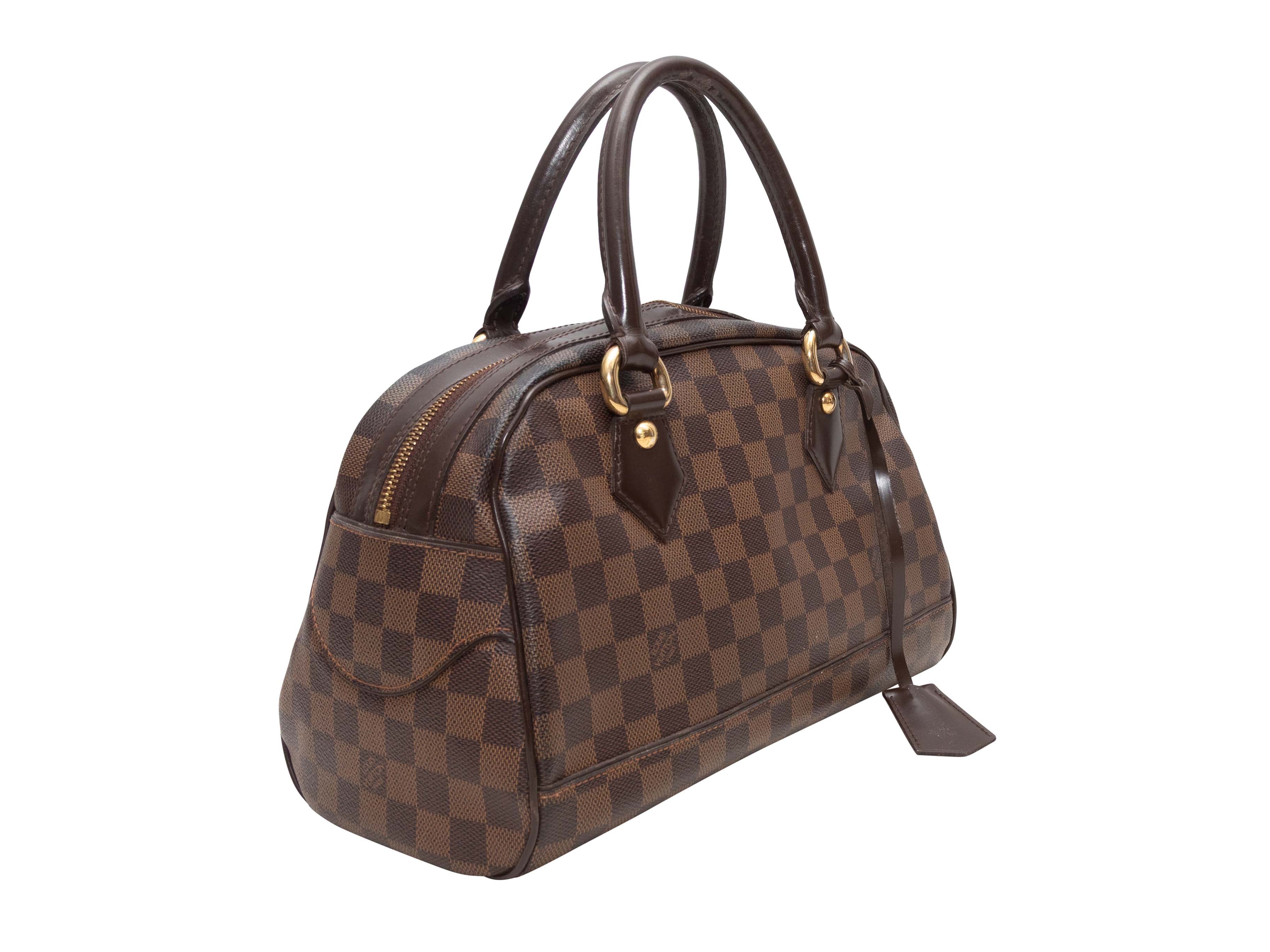Product Details: Brown Louis Vuitton Damier Ebene Duomo Bag. The Duomo Bag features a Damier Ebene body, gold-tone hardware, leather trim, dual rolled top handles, and a top zip closure. 11" L x 8" H x 5" D, 5" handle drop.