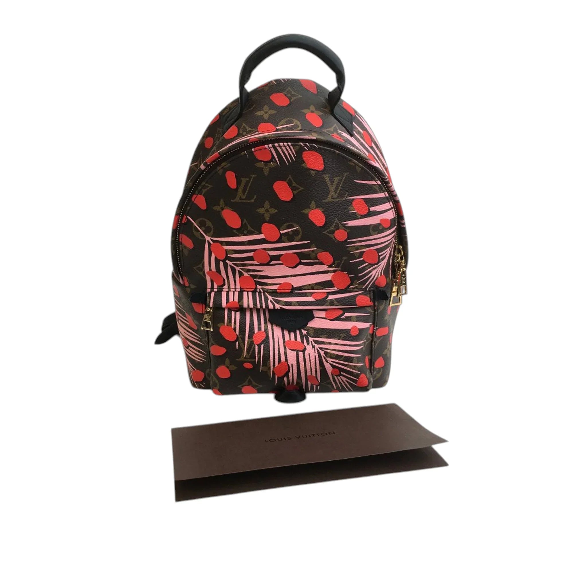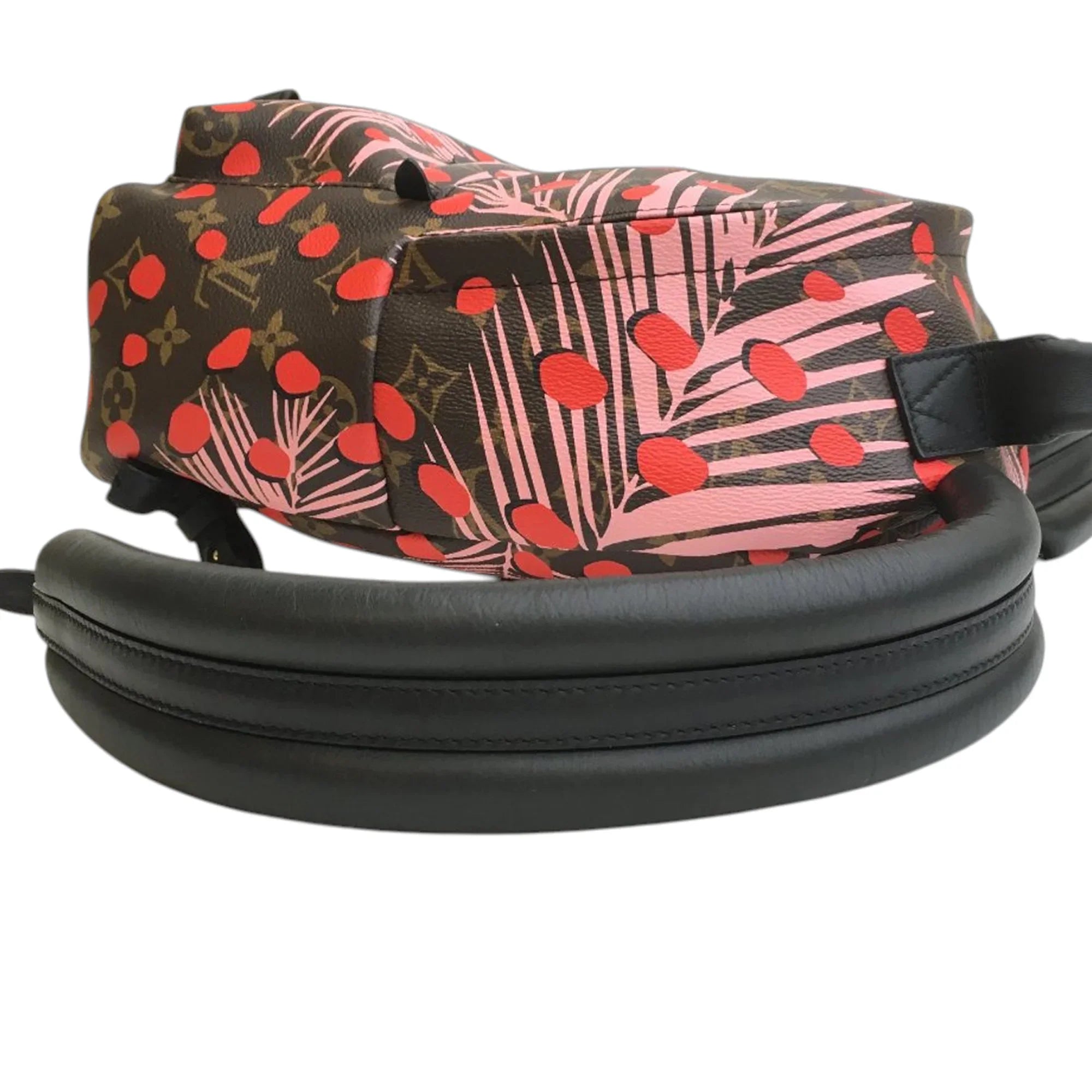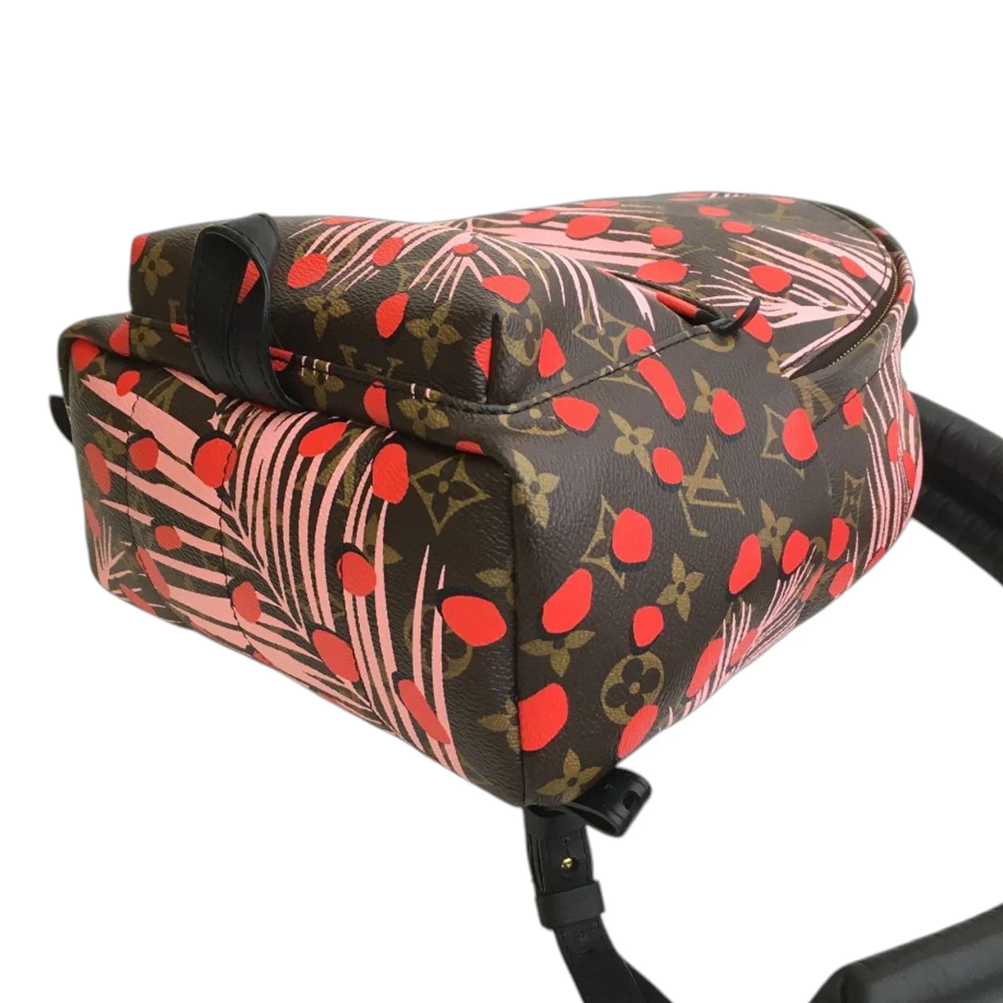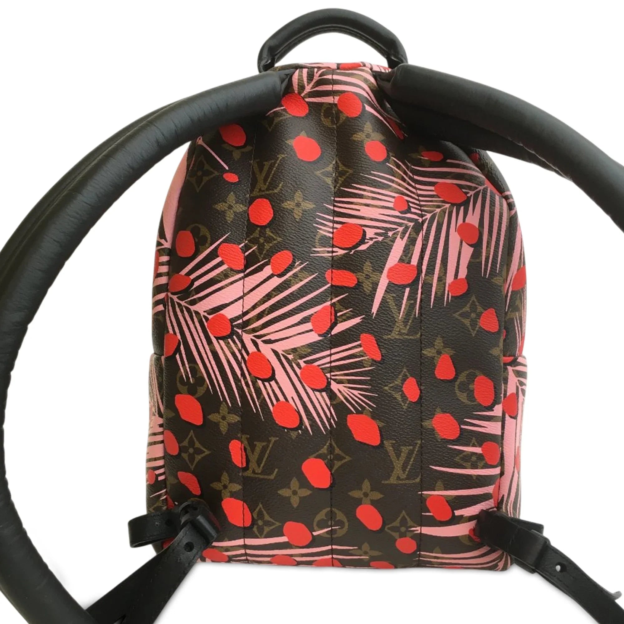Product Details: Brown Louis Vuitton Monogram Jungle Dots Palm Springs PM Backpack. The Palm Springs PM features a monogram canvas body, a flat leather top handle, adjustable flat back straps, a top zip closure, an exterior front zip pocket, and an interior slip pocket. 11.5" L x 8" W x 5.5" D, 2.4" drop. Serial number FL1116.