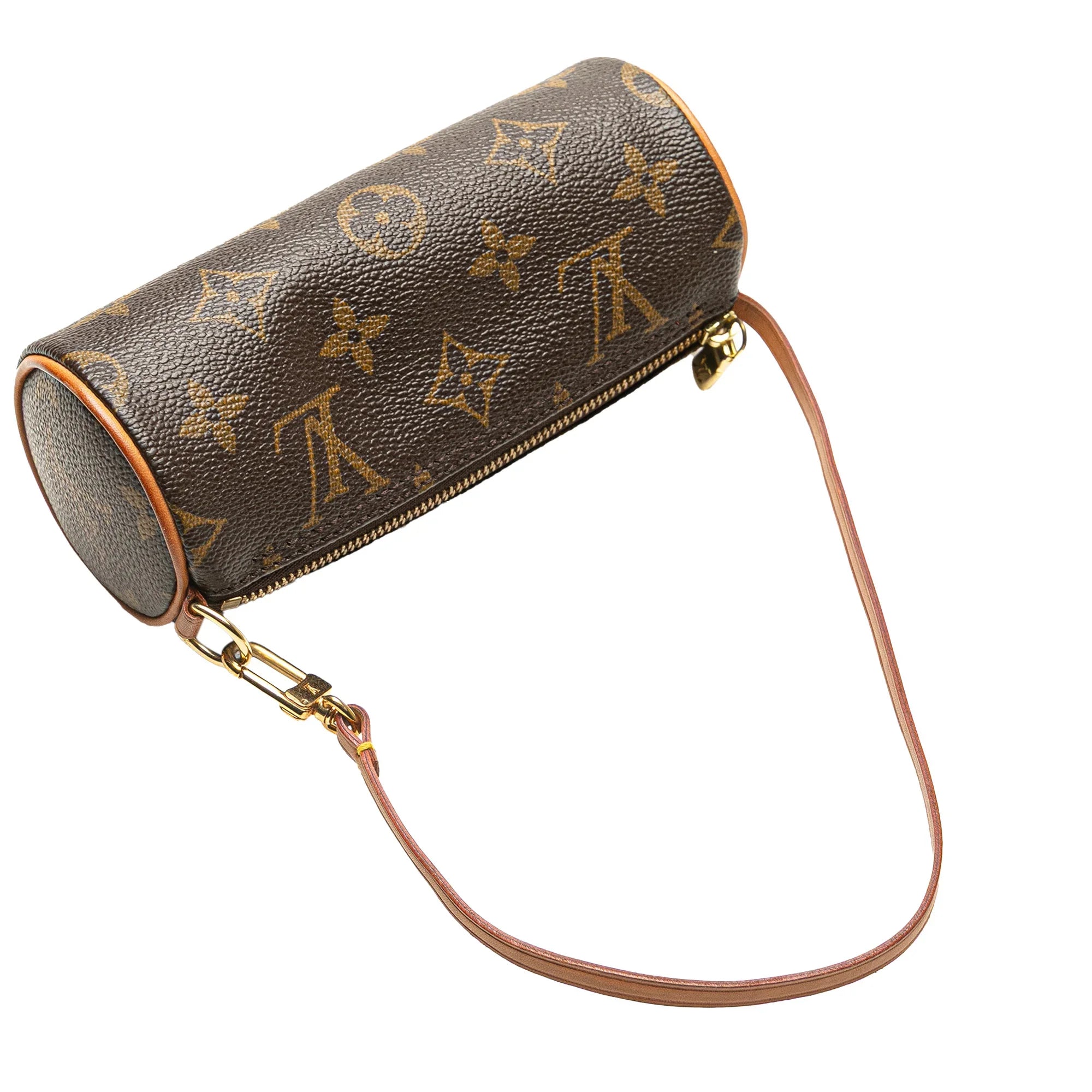 Product Details: Brown Louis Vuitton Monogram Papillon Pochette Handbag. The Papillon Pochette features a monogram canvas body with vachetta leather trim, a flat vachetta leather strap, and a top zip closure. 2.6" L x 6.1" W x 2.4" D, 6.3" drop.