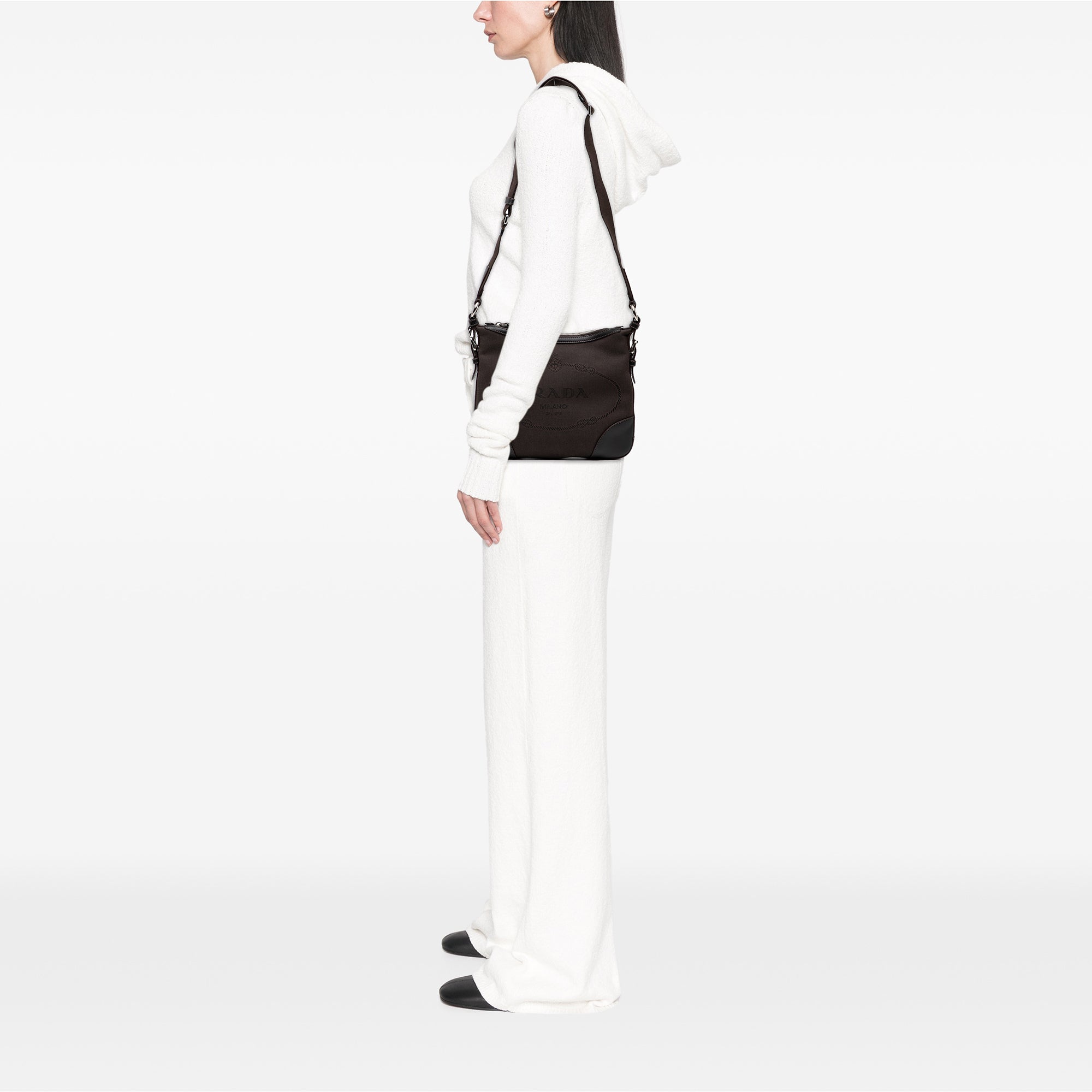 Product Details: Brown Prada Canvas Canapa Logo Crossbody. This crossbody bag features a canvas body with leather trim, an adjustable flat strap, a top zip closure, and an interior zip pocket. 9.3" L x 11" W x 0.8" D.