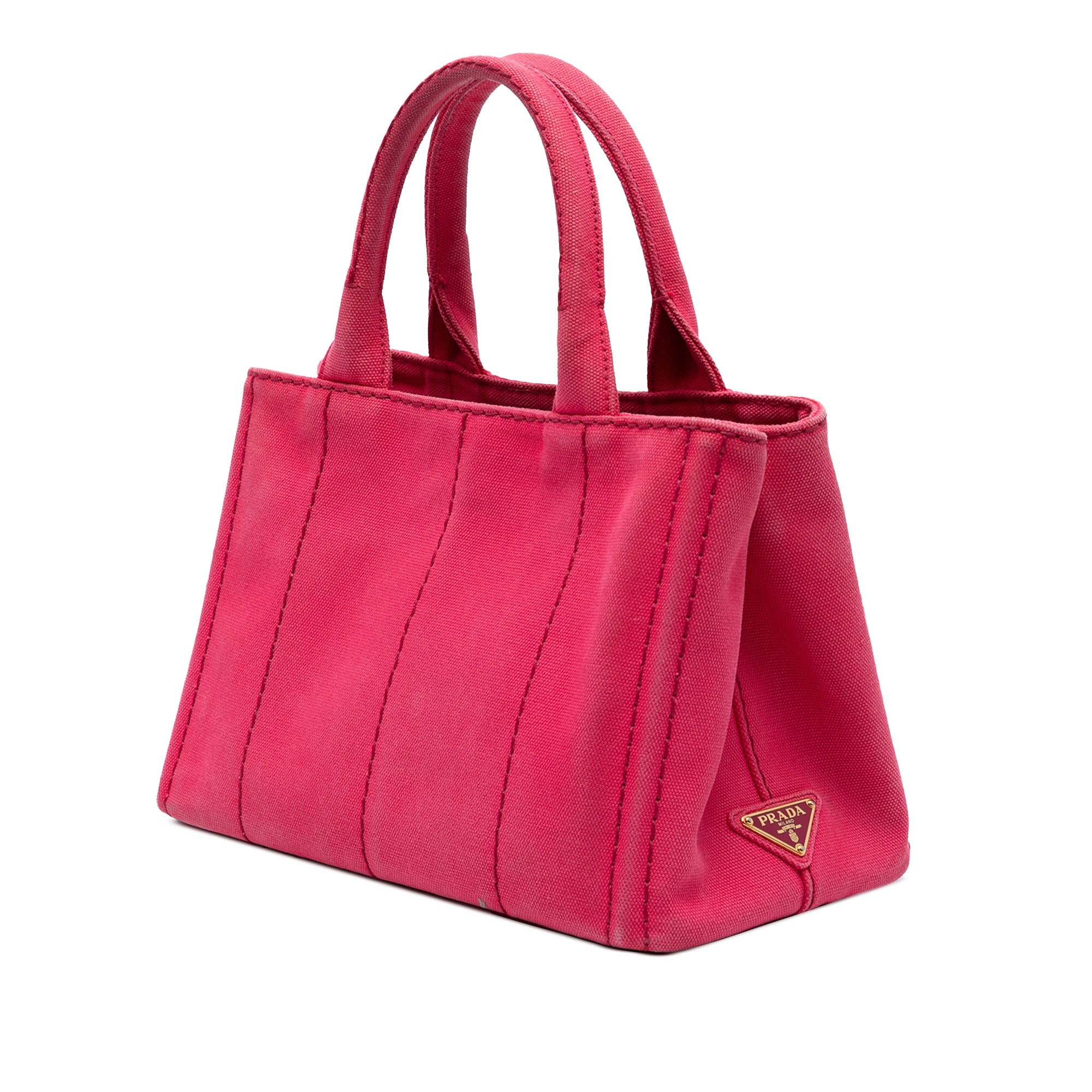 Product Details: Pink Prada Small Canvas Canapa Logo Satchel. This satchel features a canvas body, rolled canvas handles, an open top with side snap closures, and interior zip and slip pockets. 7.5" L x 10.6" W x 5.7" D, 4.9" drop.