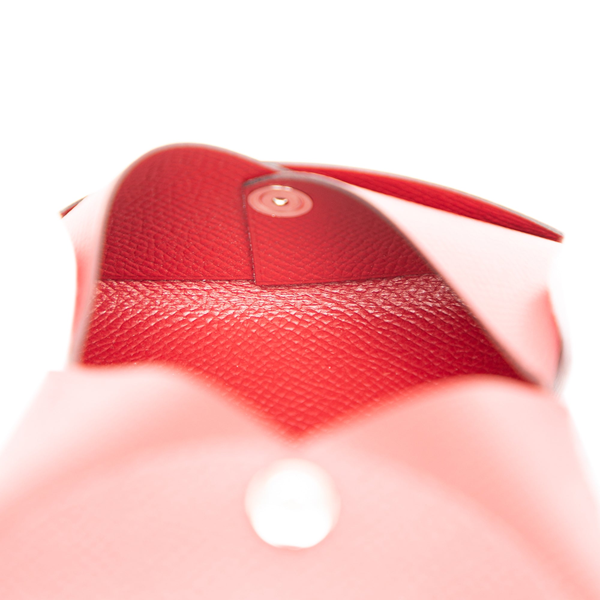 Product Details: Red Hermès Epsom Calvi Card Holder. This Calvi features an Epsom leather body in Rouge Garance color, a snap button closure, and interior slip pockets. 2.8" L x 4.1" W x 0.8" D. Serial number A.