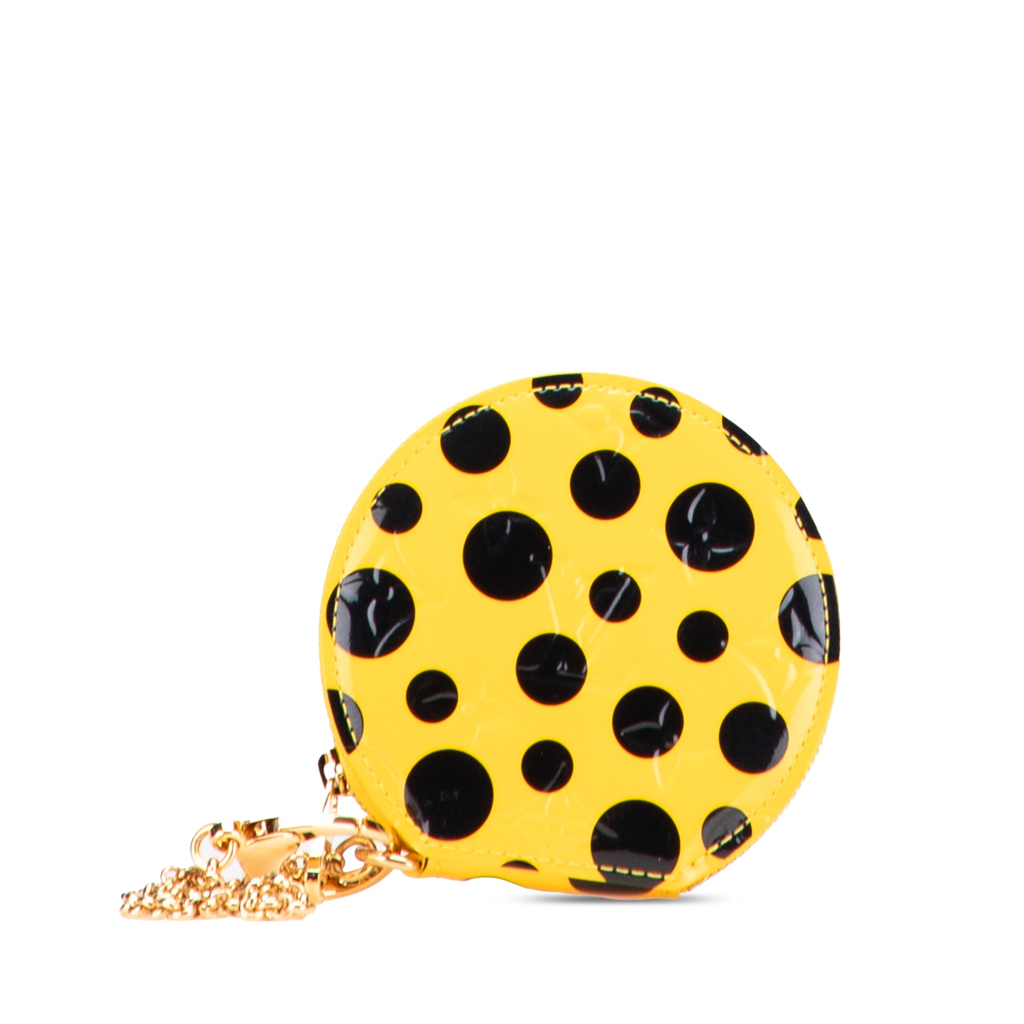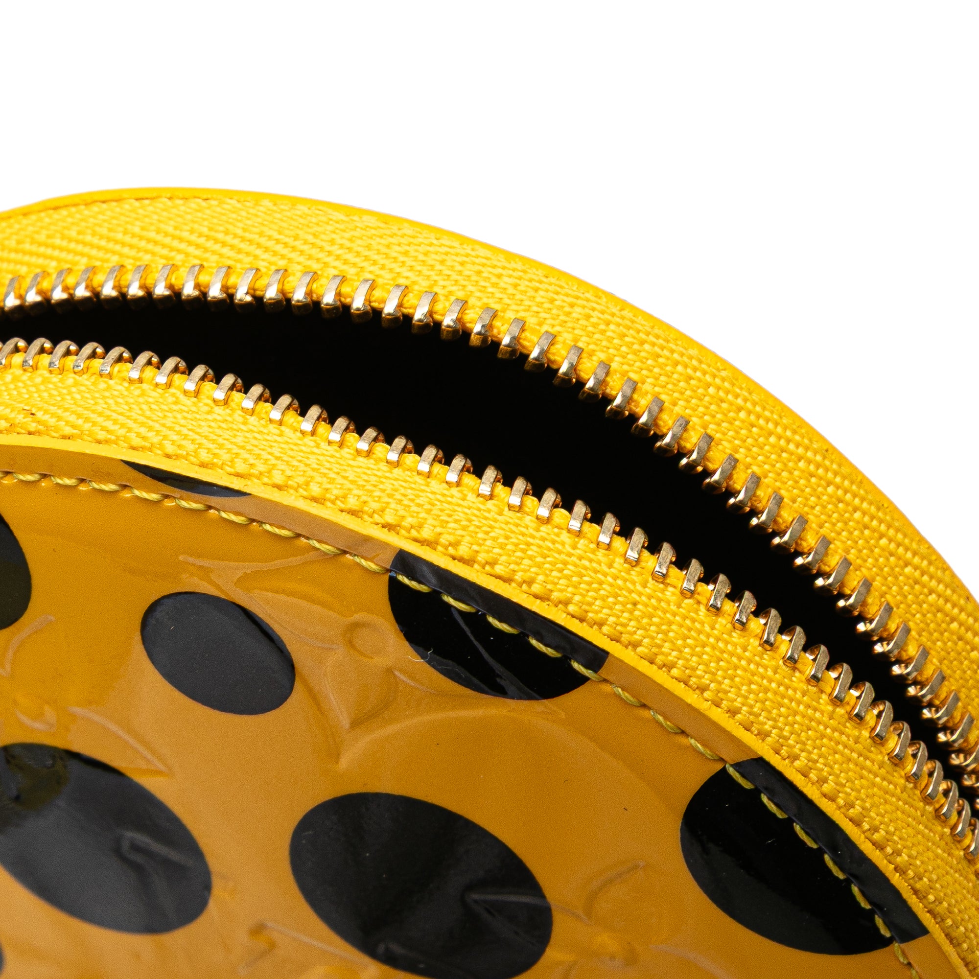 Product Details: Yellow Louis Vuitton Monogram Vernis Kusama Infinity Dots Chapeau Coin Purse. This coin pouch features a monogram vernis leather body and a top zip closure. 3.7" L x 2.8" W x 0.8" D.