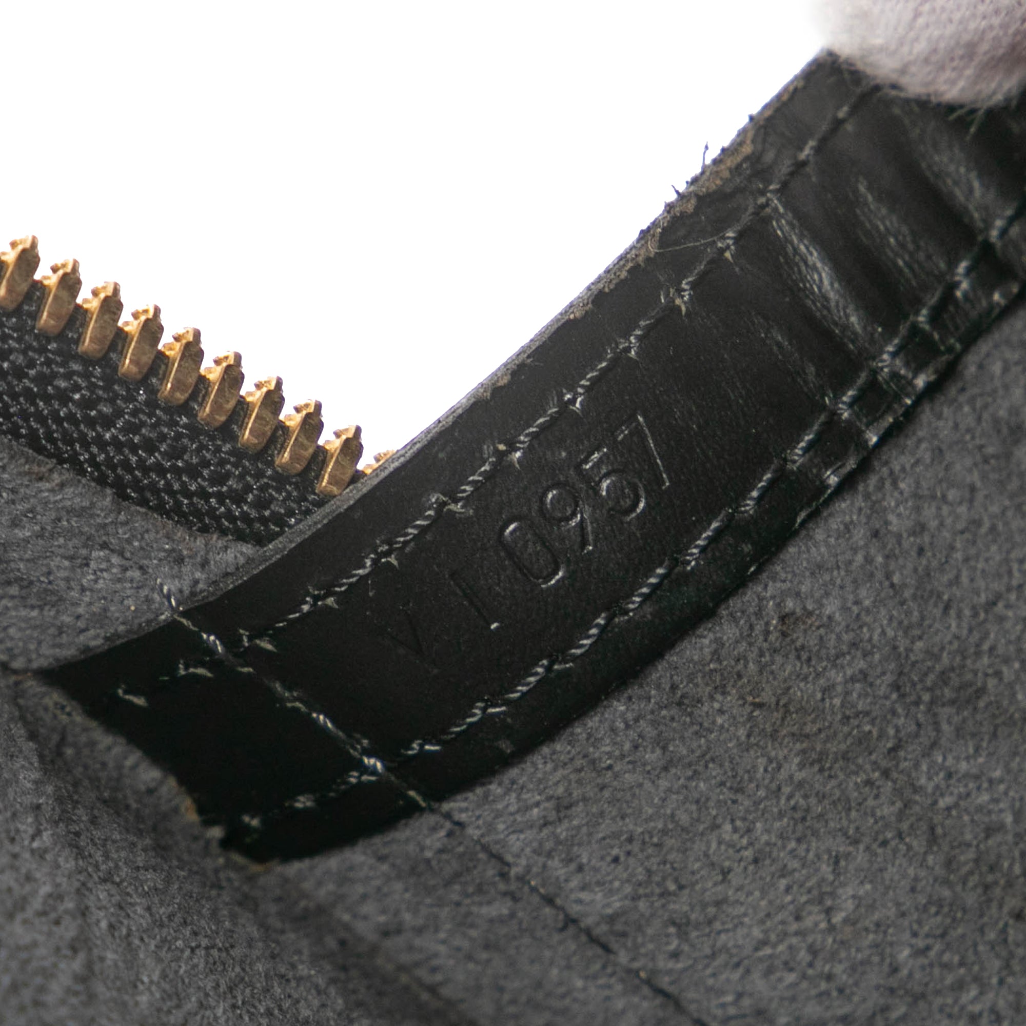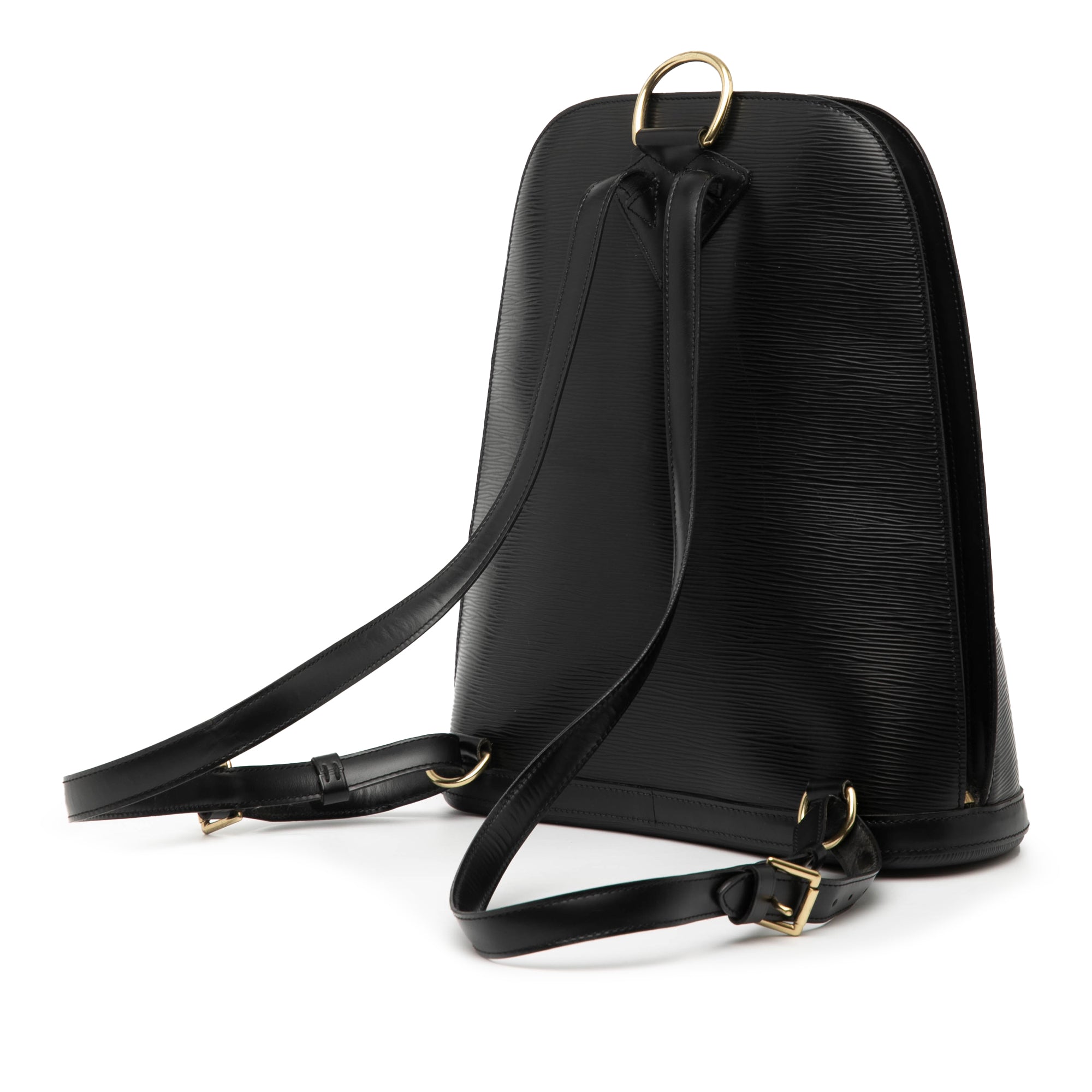Product Details: Black Louis Vuitton Epi Gobelins Backpack. The Gobelins features an epi leather body, flat back straps, a two-way zip around closure, an exterior front zip pocket, and an interior slip pocket. 13.6" L x 12.2" W x 5.5" D. Serial number VI0957.