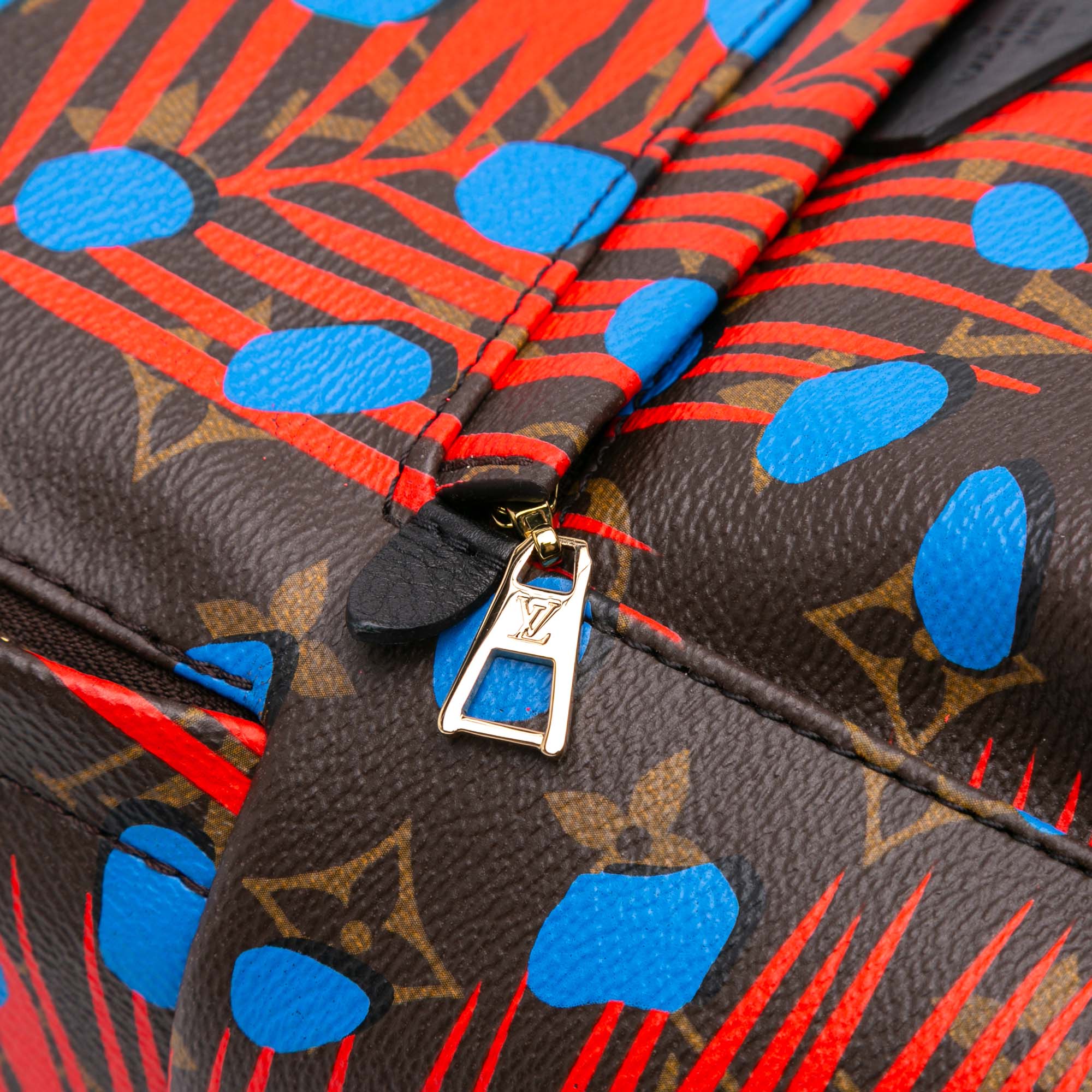 Product Details: Brown Louis Vuitton Monogram Jungle Dots Palm Springs PM Backpack. The Palm Springs PM features a printed monogram canvas body, a flat leather top handle, adjustable flat back straps, a top zip closure, an exterior front zip pocket, and an interior slip pocket. 12.6" L x 7.9" W x 3.5" D. Serial number FL0186.
