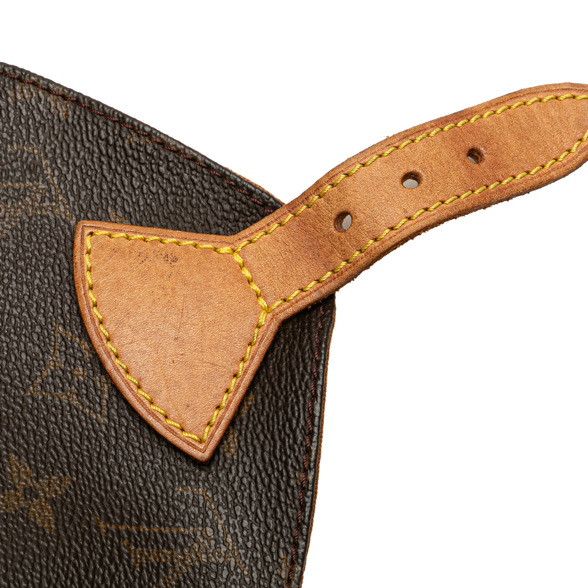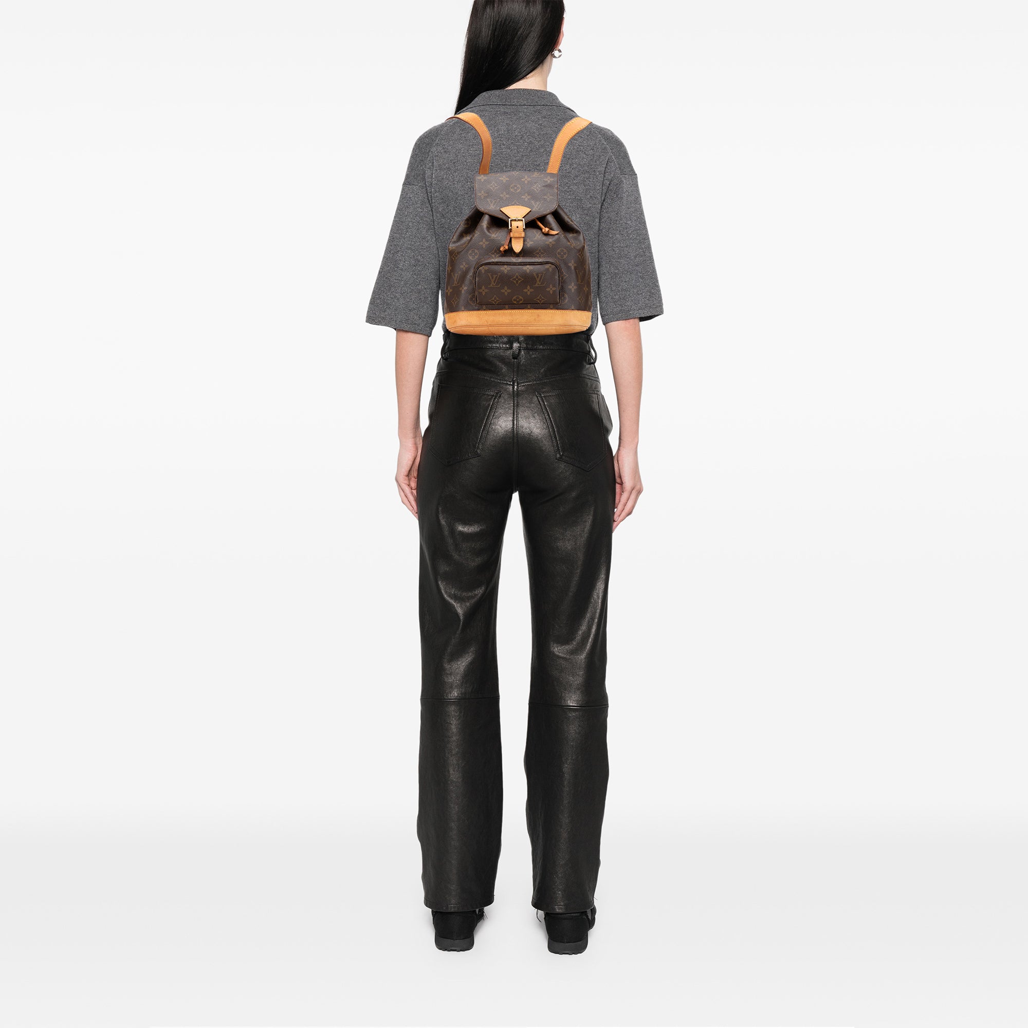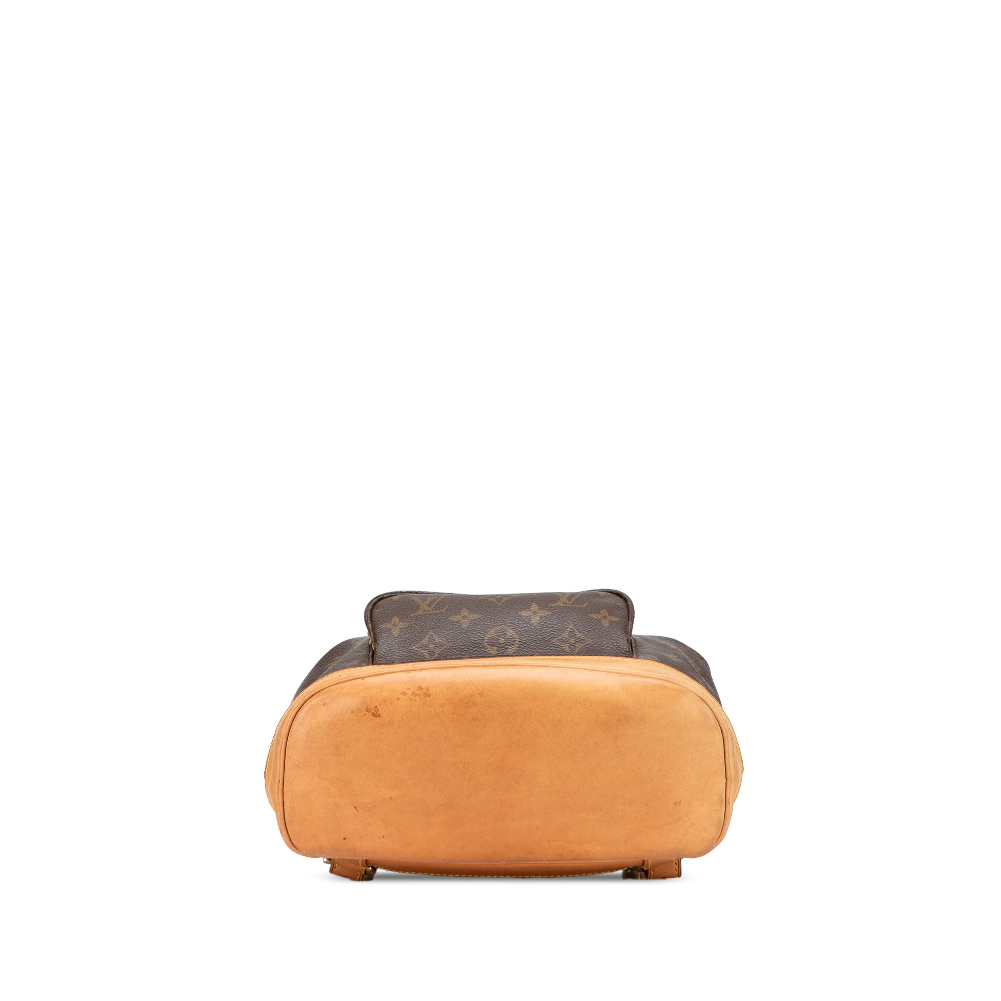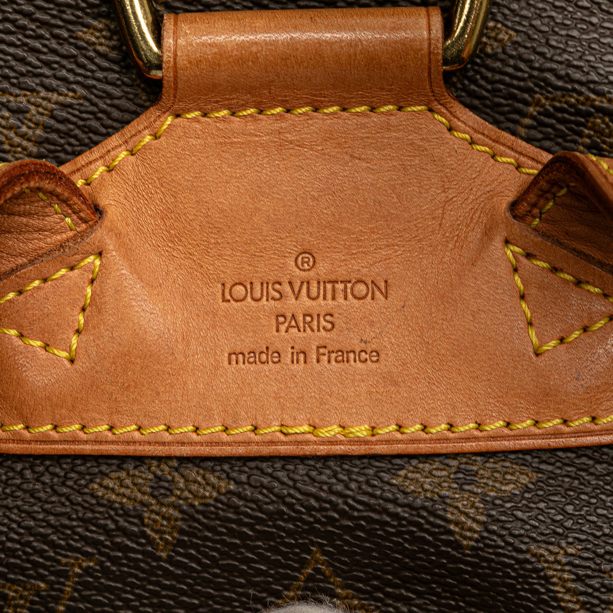 Product Details: Brown Louis Vuitton Monogram Montsouris PM Backpack. The Montsouris PM features a monogram canvas body with vachetta leather trim, flat vachetta leather back straps, a front flap with a belt buckle detail and a top drawstring closure, an exterior front zip pocket, and an interior slip pocket. 11.4" L x 9.8" W x 4.7" D. Serial number SP0060.