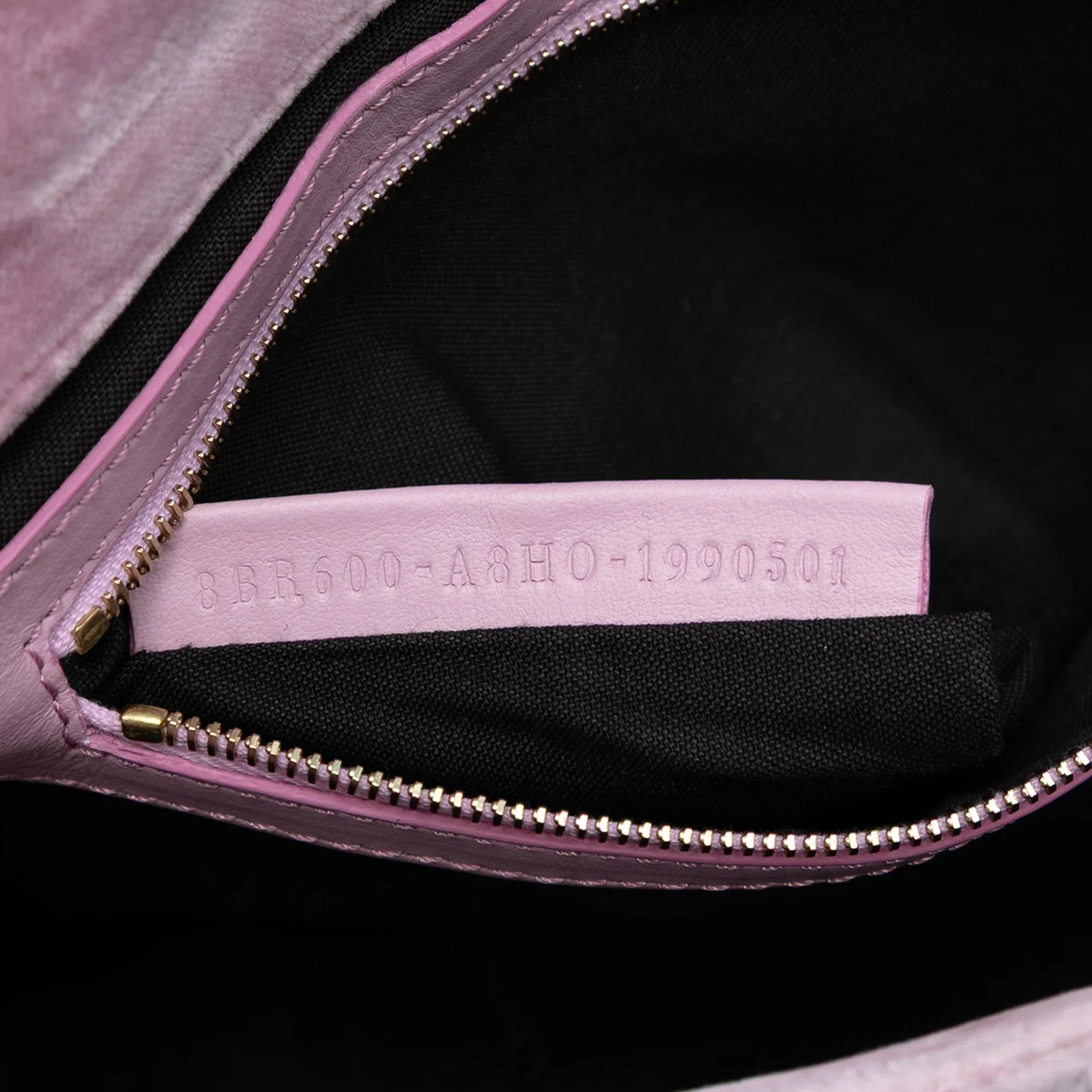 Product Details: Pink Fendi Zucca Embossed Velvet Baguette Satchel. The Baguette satchel features an embossed velvet body, a flat handle, a detachable chain link shoulder strap, a front flap with magnetic snap closure, and an interior zip pocket. 6.7" L x 10" W x 2.2" D, 3.9" drop. Serial number 8BR600-A8HO-1990501.