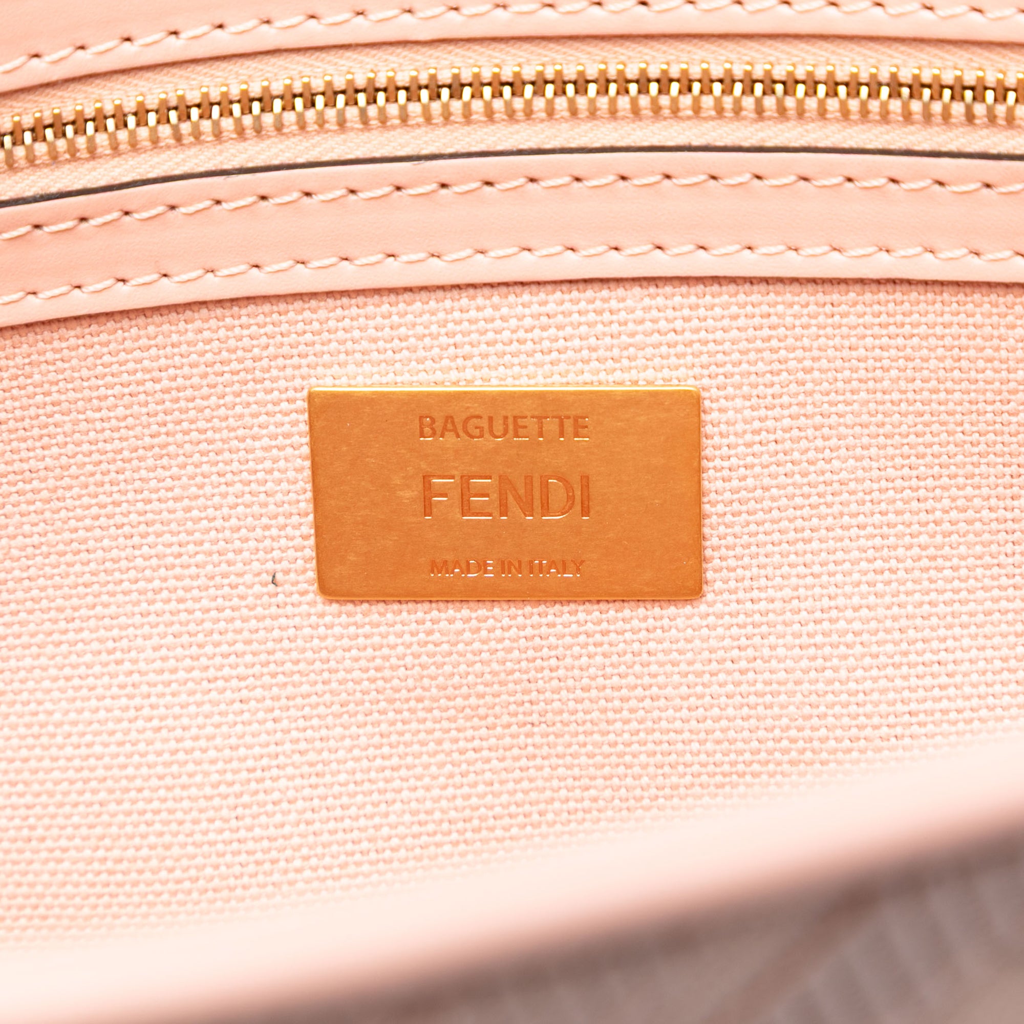 Product Details: Pink Fendi Zucca Embroidered Canvas Baguette Satchel. The Baguette features an embroidered canvas body with leather trim, a detachable leather top handle, a detachable leather strap, a front flap with magnetic closure, and an interior zip pocket. 6.1" L x 10.6" W x 2.6" D, 5.5" drop. Serial number 8BR600 AMCD 229 4095.
