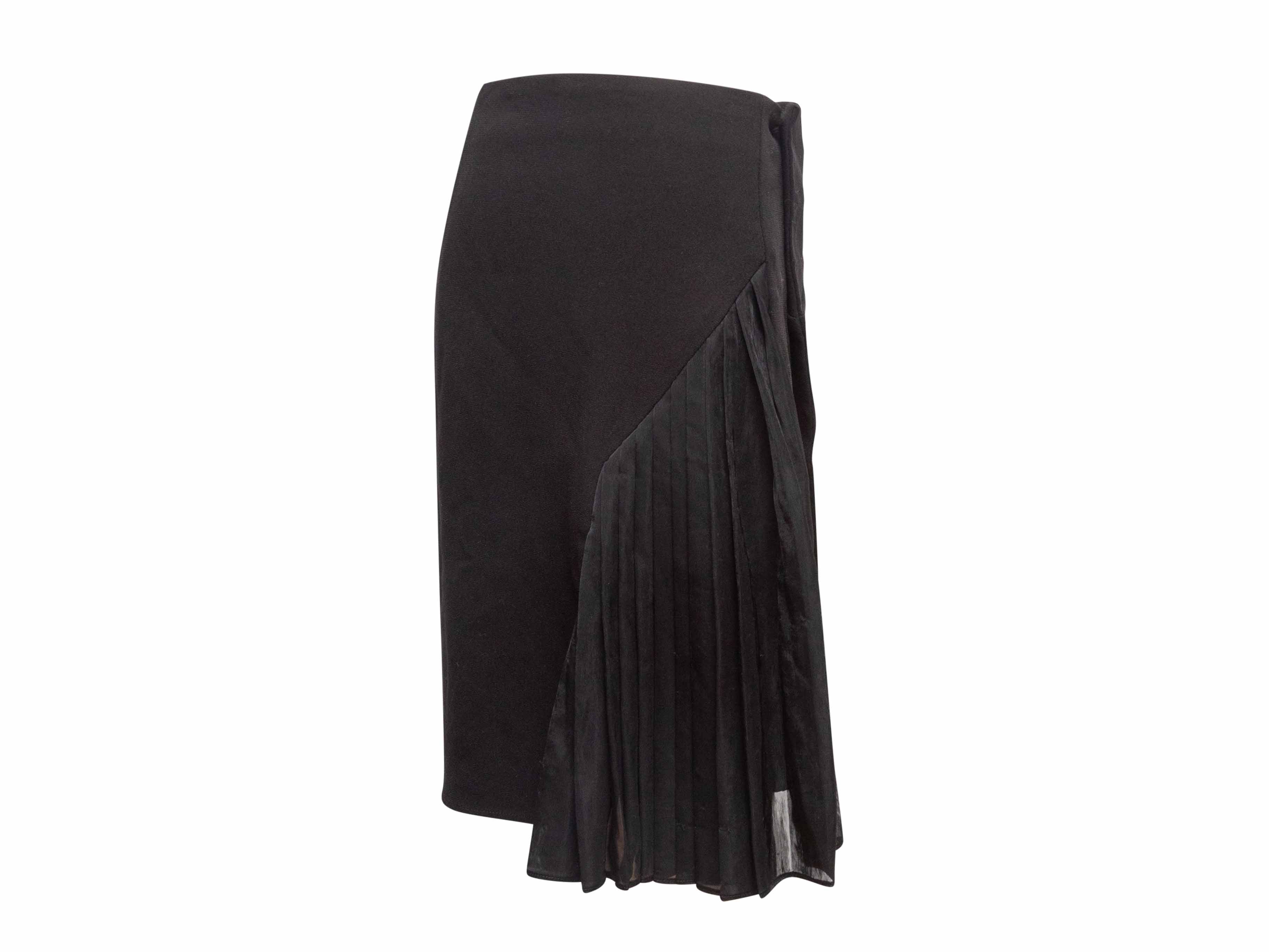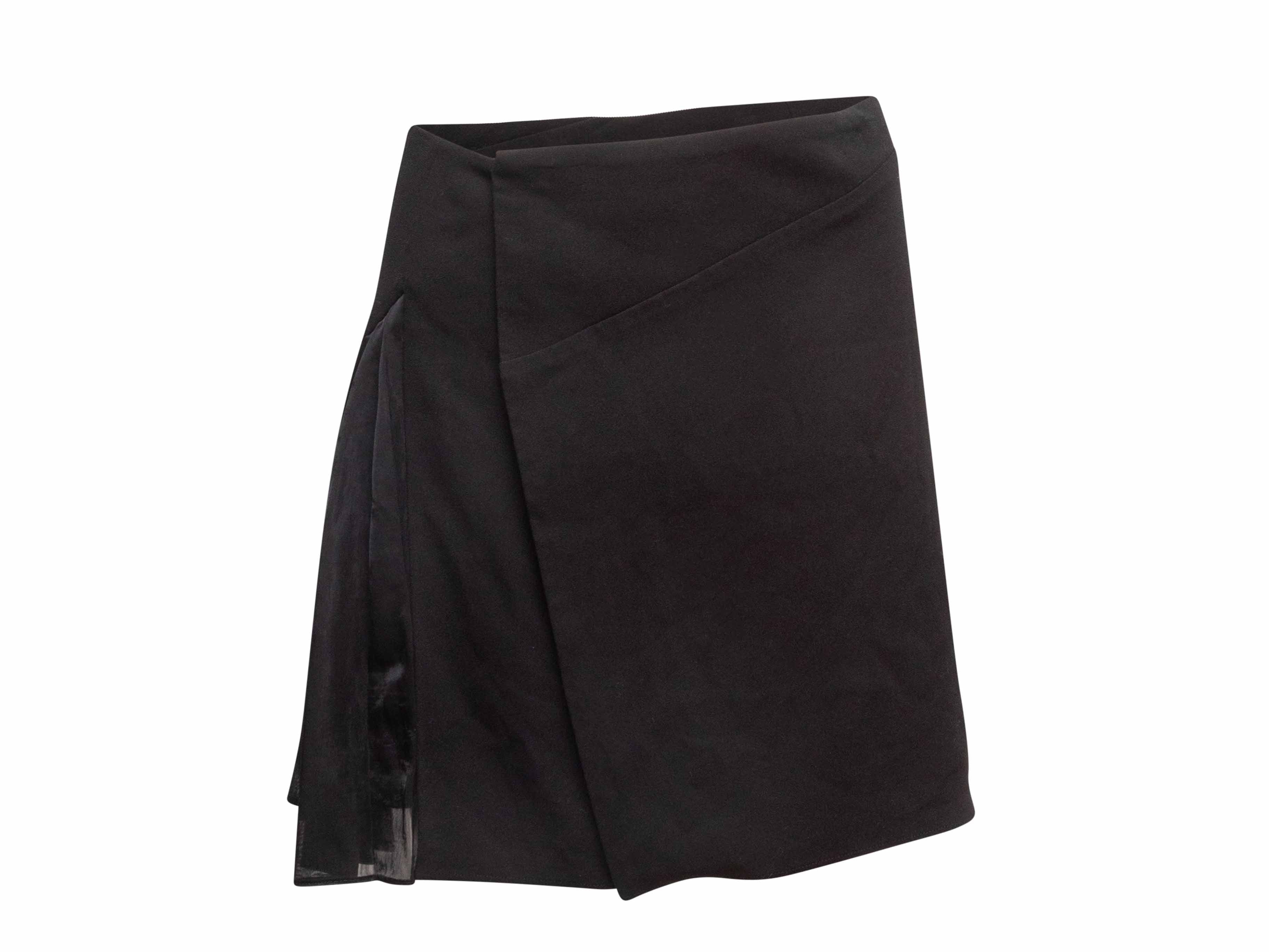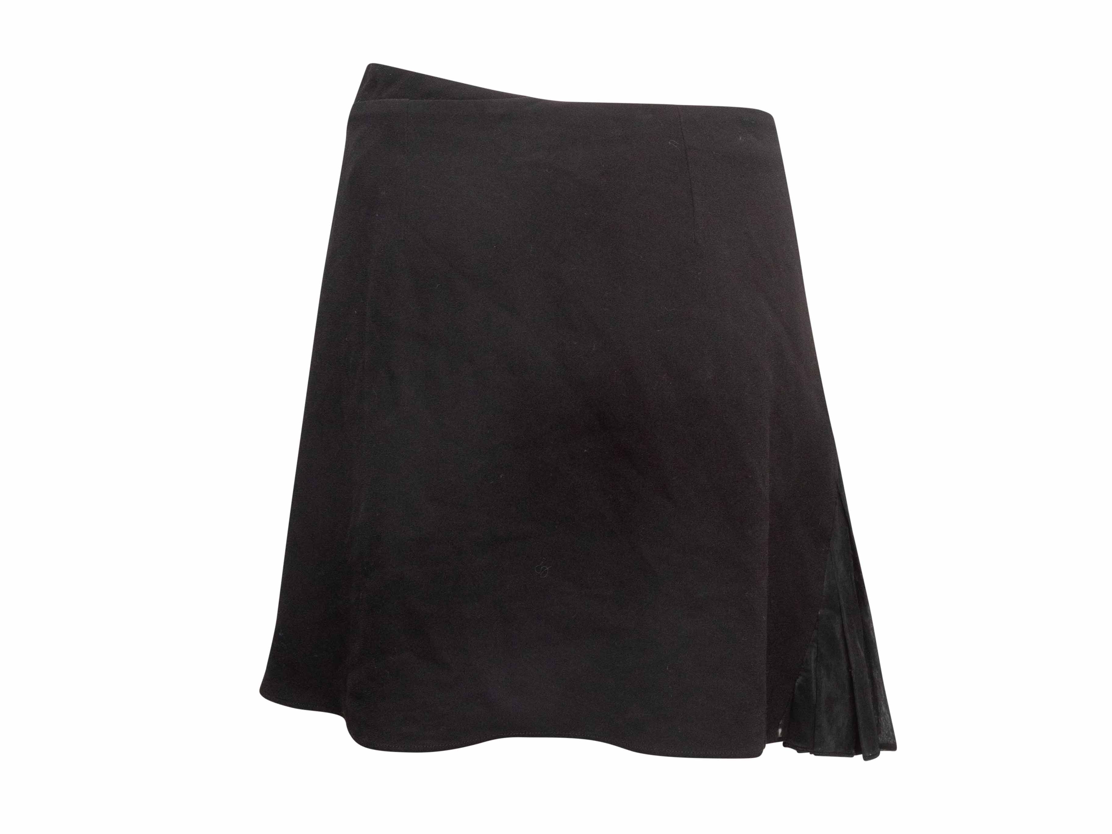 Product Details: Black pleat-accented wrap mini skirt by Balenciaga. Front closure. 30" waist, 34" hips, 17.5" length.
