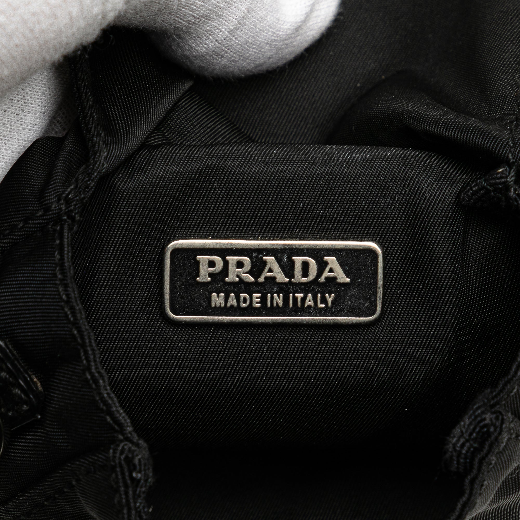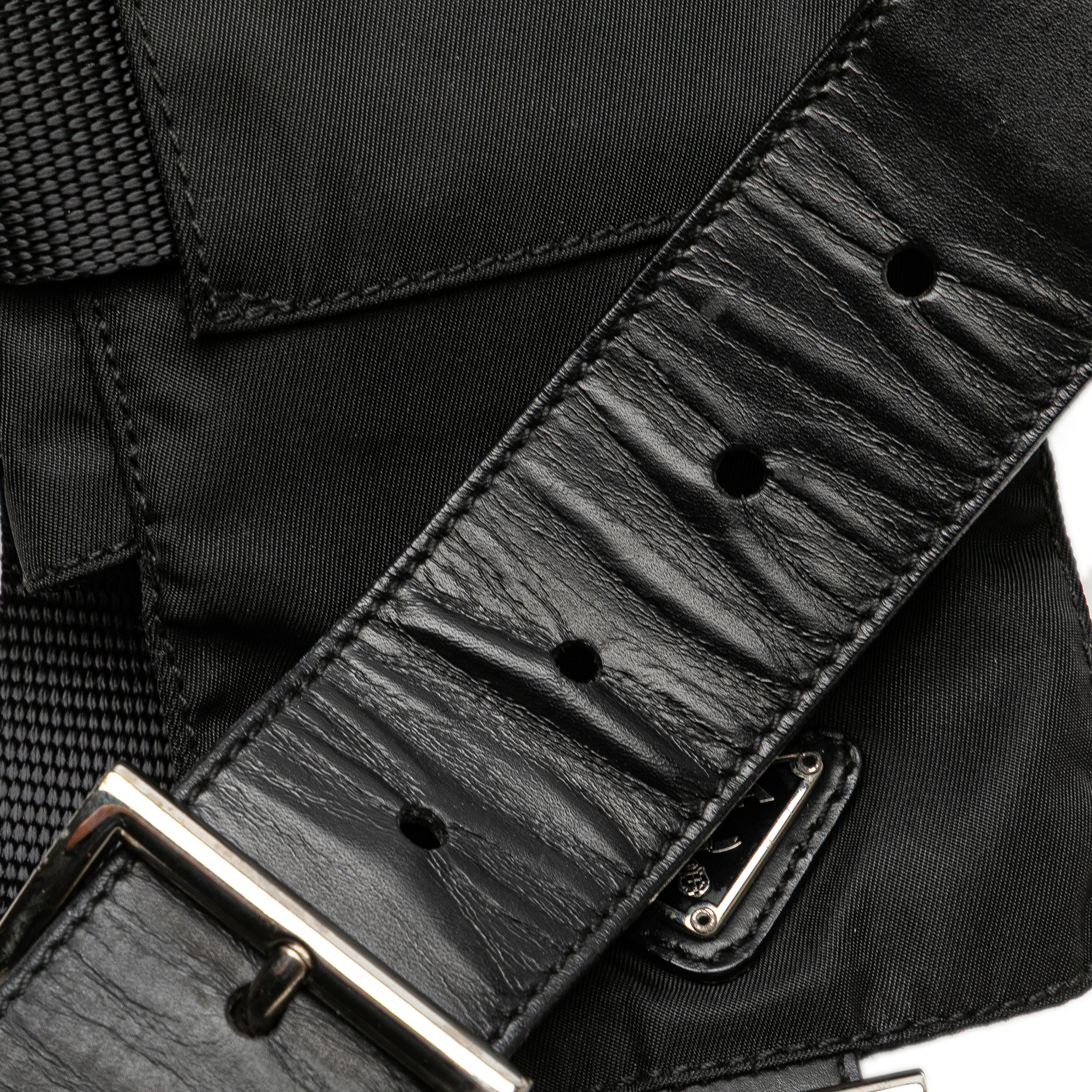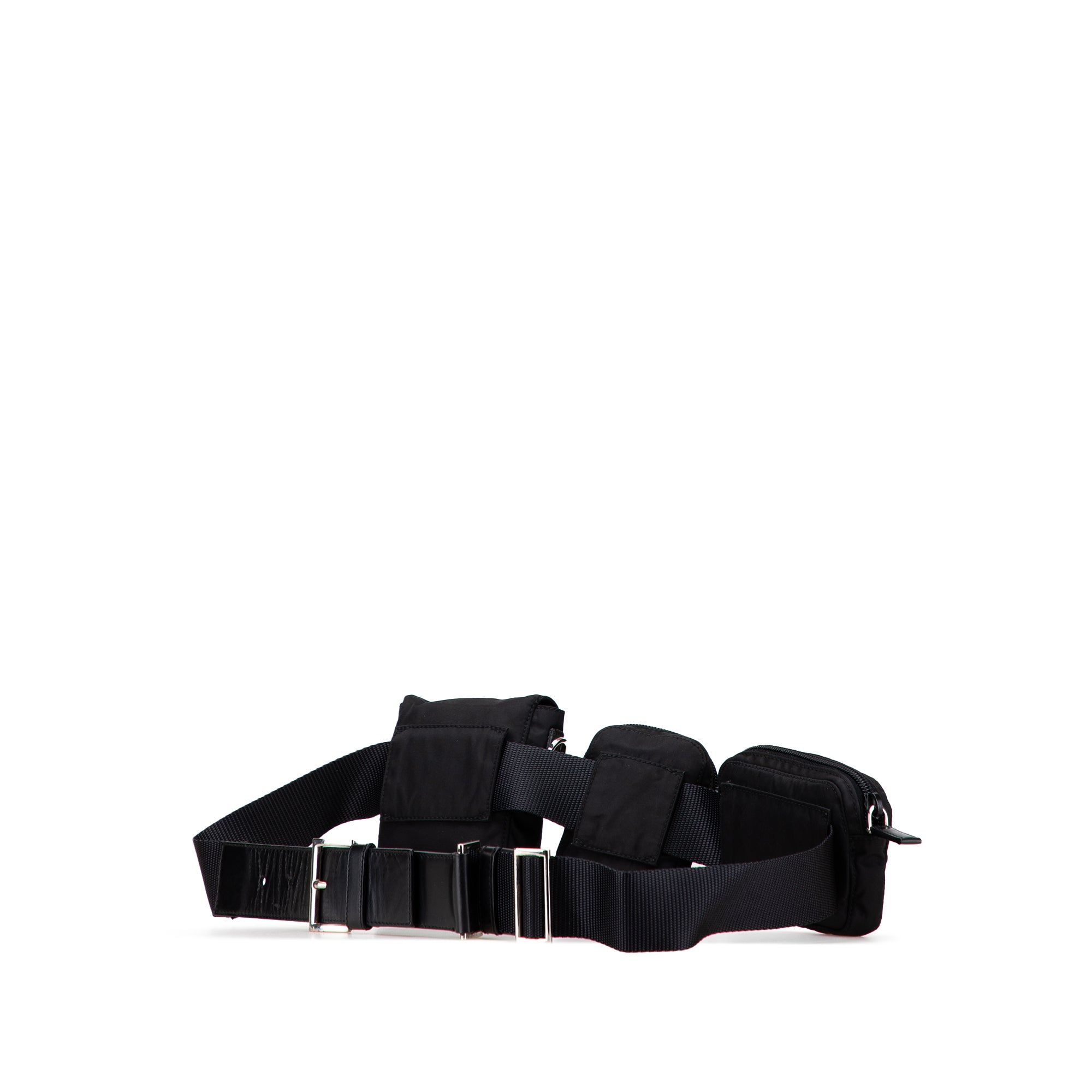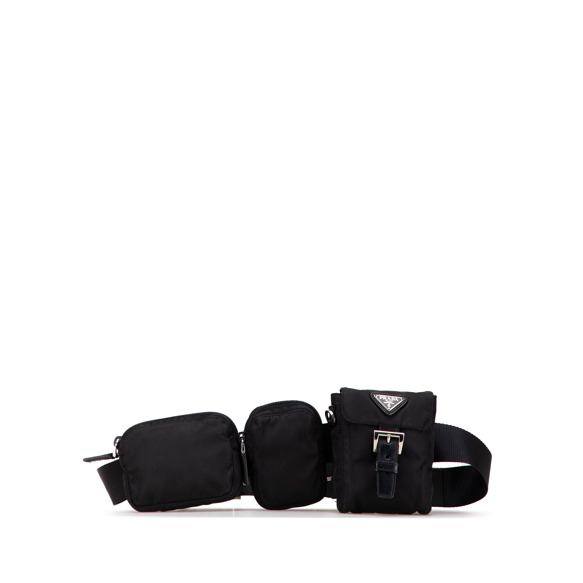 Product Details: Black Prada Tessuto Triple Pouch Belt Bag. This belt bag features a nylon body, an adjustable waist strap, a flap with buckle and magnetic snap closure, and detachable zip pouches. 5.5" L x 4.3" W x 1.2" D.