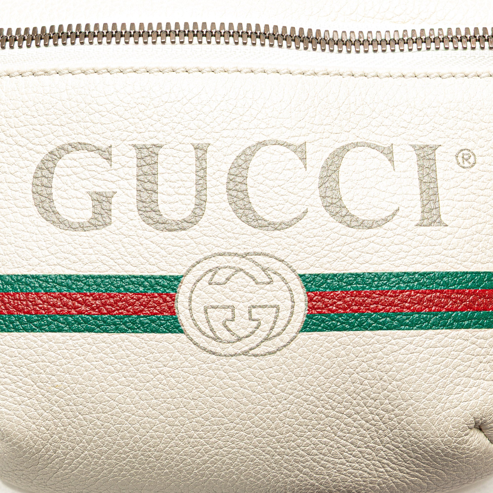 Product Details: White Gucci Logo Leather Belt Bag. This belt bag features a printed leather body, a canvas waist strap with buckle closure, and a front zip closure. 5.1" L x 4.5" W x 1.6" D. Serial number 527792 486628.