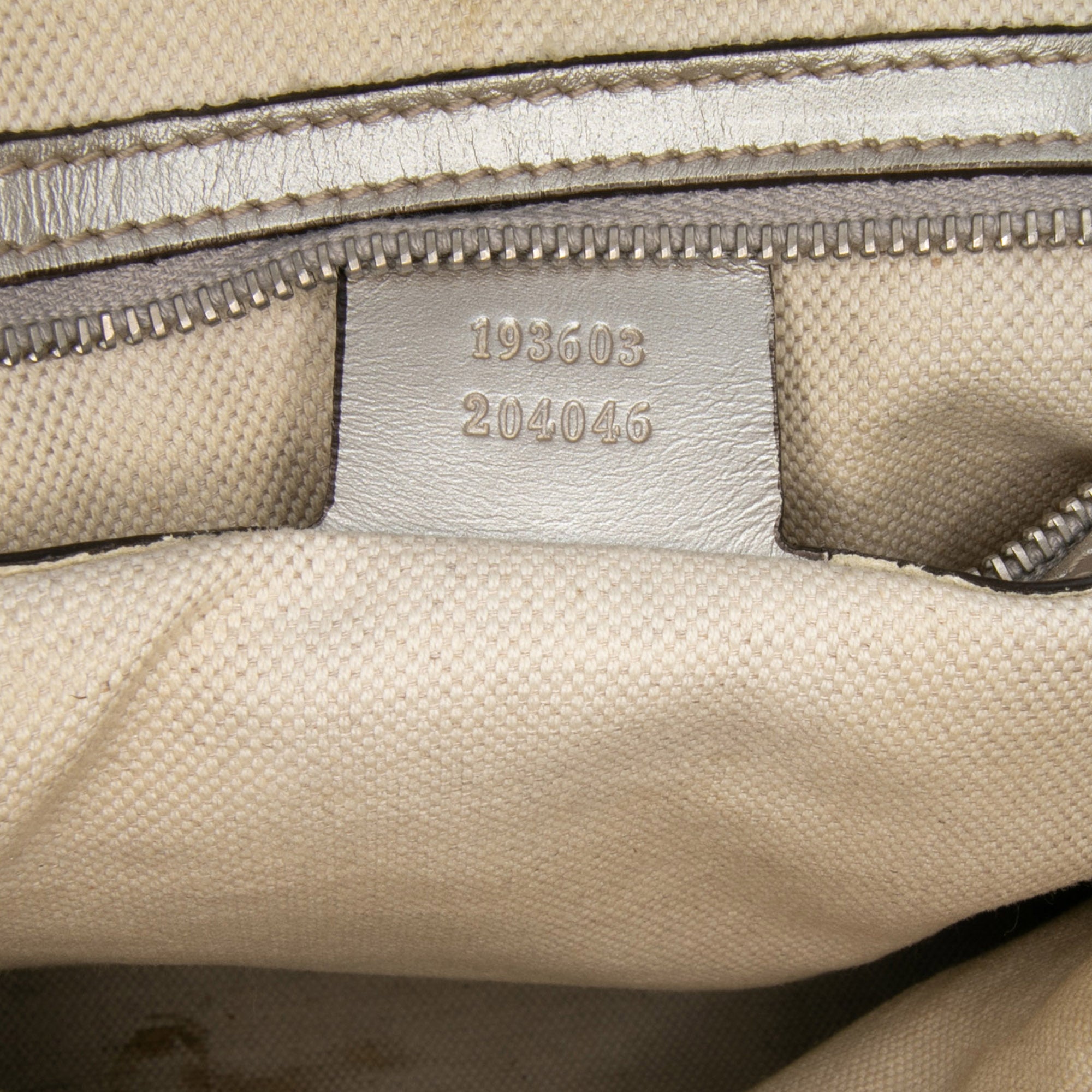 Product Details: Gold Gucci Medium GG Imprime Joy Boston Bag. This boston bag features a coated canvas body with leather trim, rolled leather handles, a top zip closure, and an interior zip pocket. 8.3" L x 12.8" W x 6.9" D, 3.9" drop. Serial number 193603 204046.