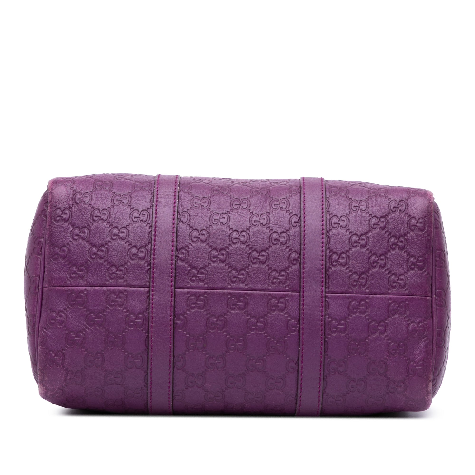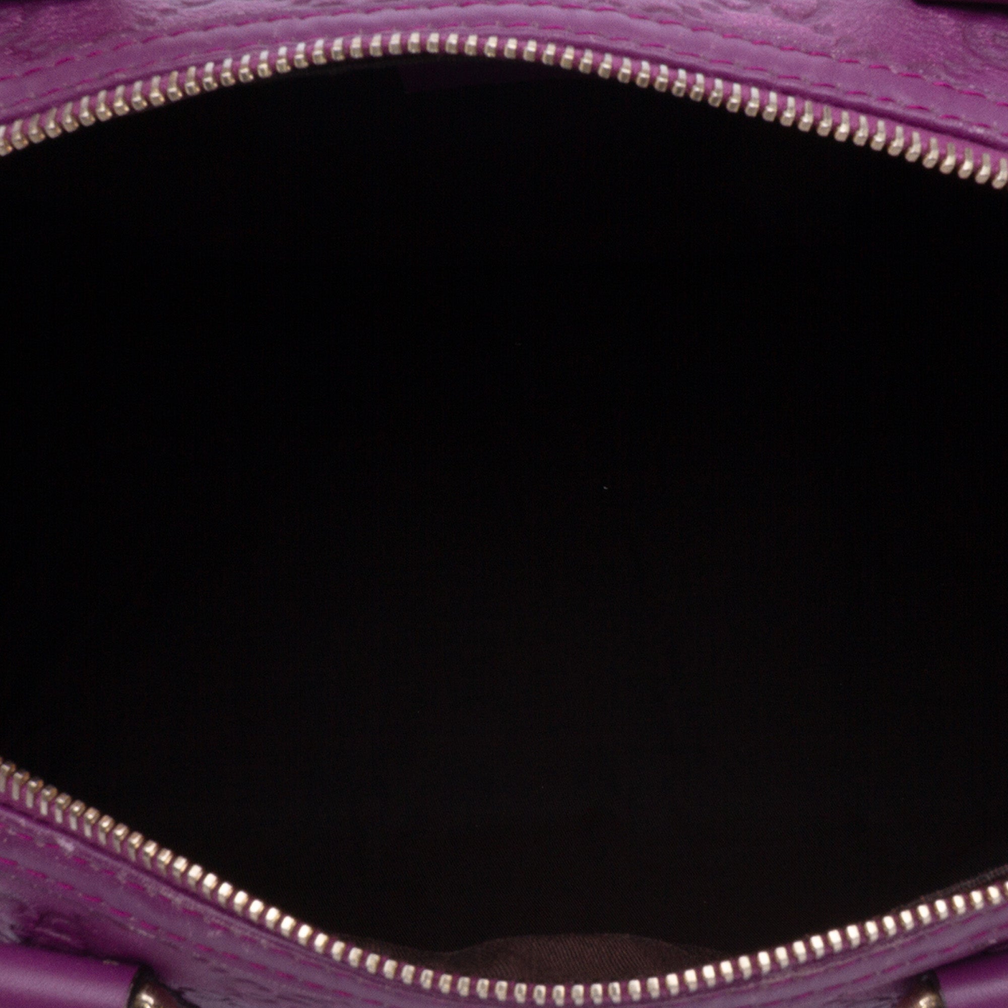 Product Details: Purple Gucci Medium Guccissima Joy Boston Bag Satchel. This satchel features an embossed leather body, rolled leather handles, a top zip closure, and an interior slip pocket. 8.7" L x 13" W x 6.7" D, 3.5" drop. Serial number 265697 204991.